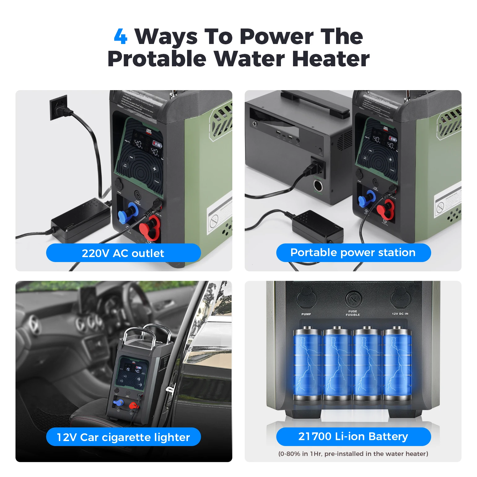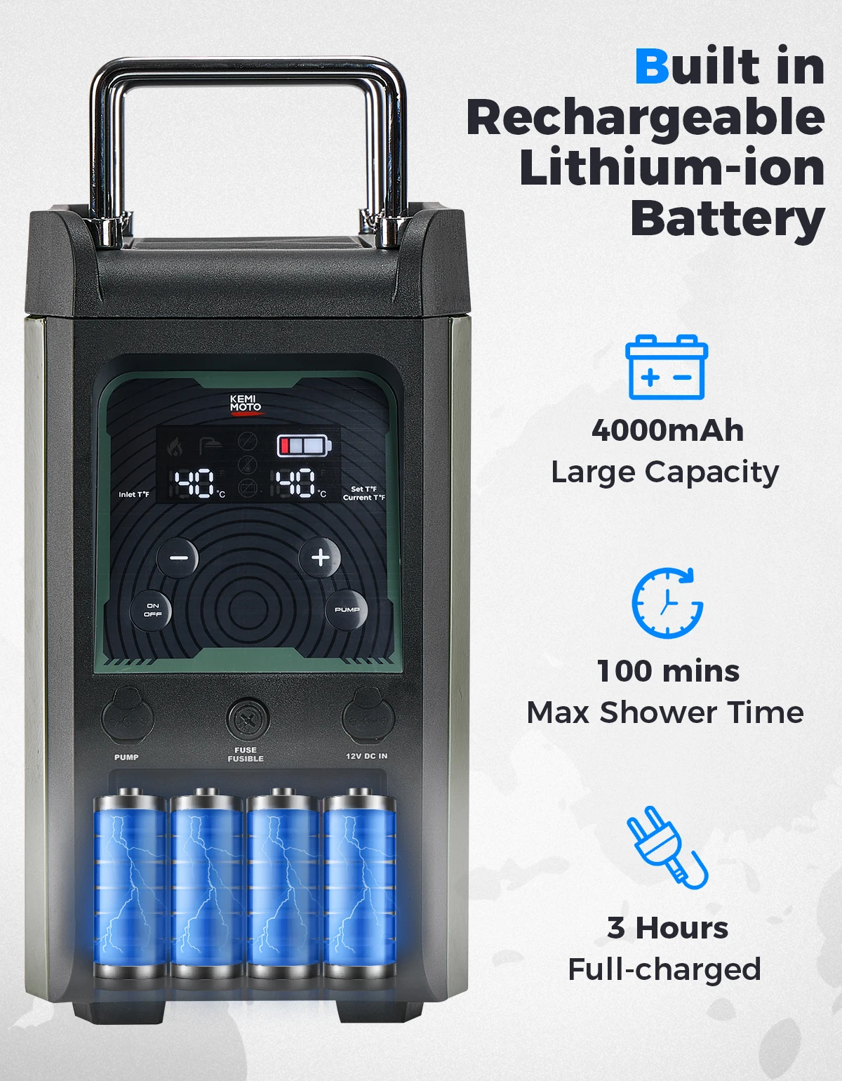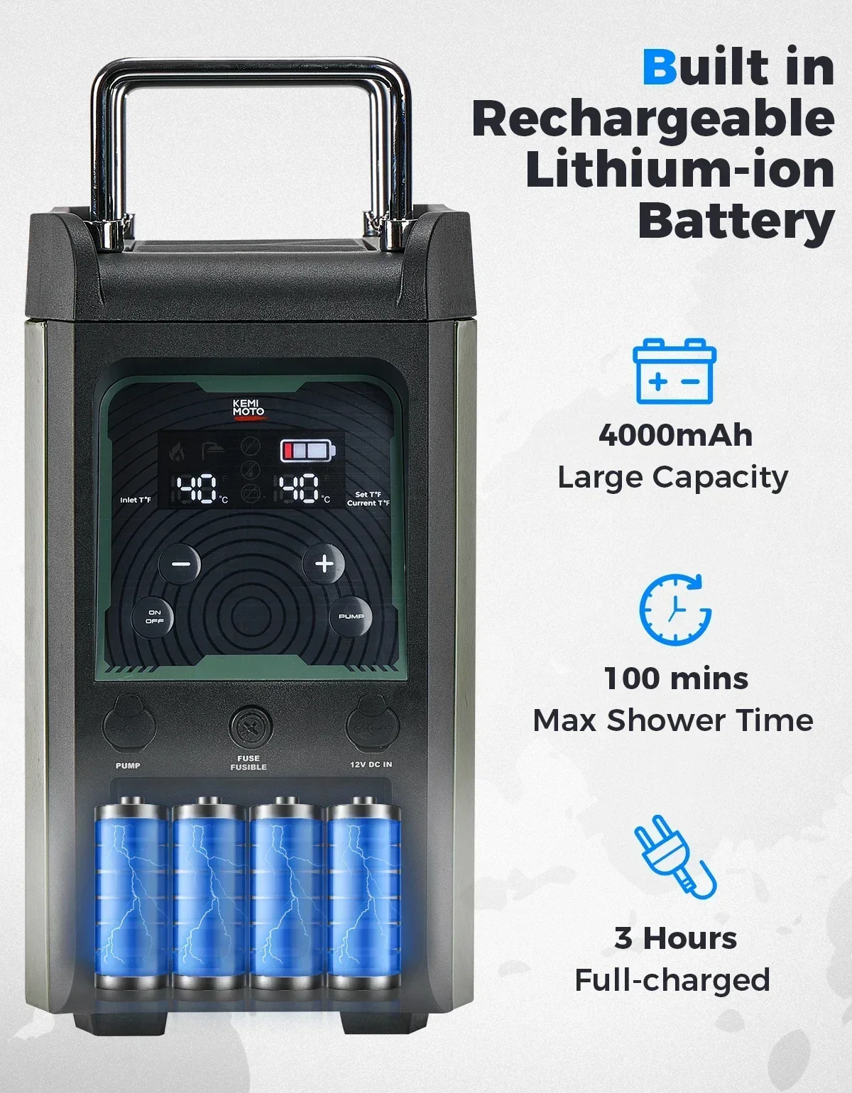 Встроенный литий-ионный аккумулятор емкостью 4000 мАч при полной зарядке аккумулятор может питать портативный водонагреватель в течение 100 минут.Аккумулятор поддерживает одновременную зарядку и разрядку и может быть полностью заряжен до 80% за 120 минут.