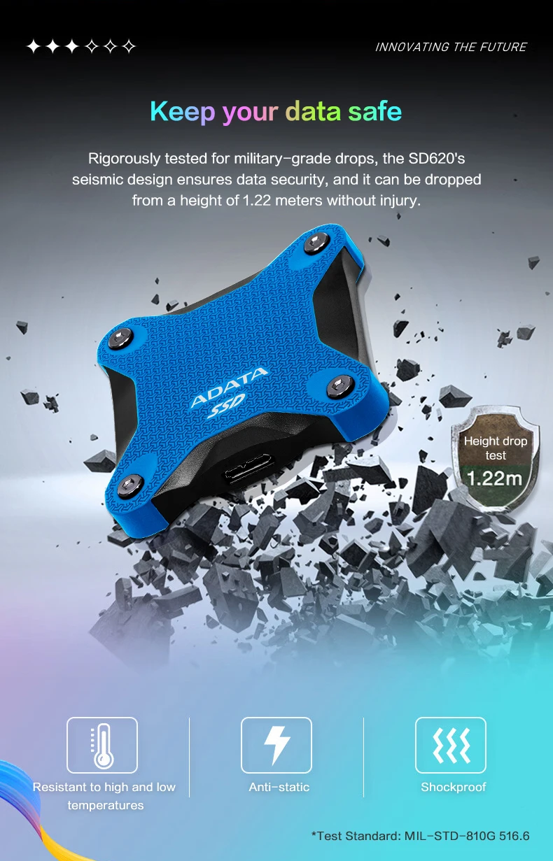 SD620 покрыт защитным противоударным силиконовым чехлом, который является превосходным эластичным буфером по сравнению со стандартными внешними твердотельными накопителями.Он прошел строгие испытания на падение MIL-STD810G 516,6 и останется незакрепленным даже при падении с 1,22 метра.Долговечность SD620 позволяет носить его без необходимости!