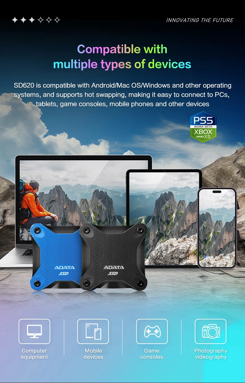SD620 совместим с такими операционными системами, как Android, Mac OS и Windows, и поддерживает горячее соединение.Его можно подключать к различным устройствам, таким как ПК, планшеты, мобильные телефоны и игровые консоли.SD620 может передавать файлы без установки дополнительных драйверов.Резервное копирование всех ваших устройств за один раз это удобно и безопасно!