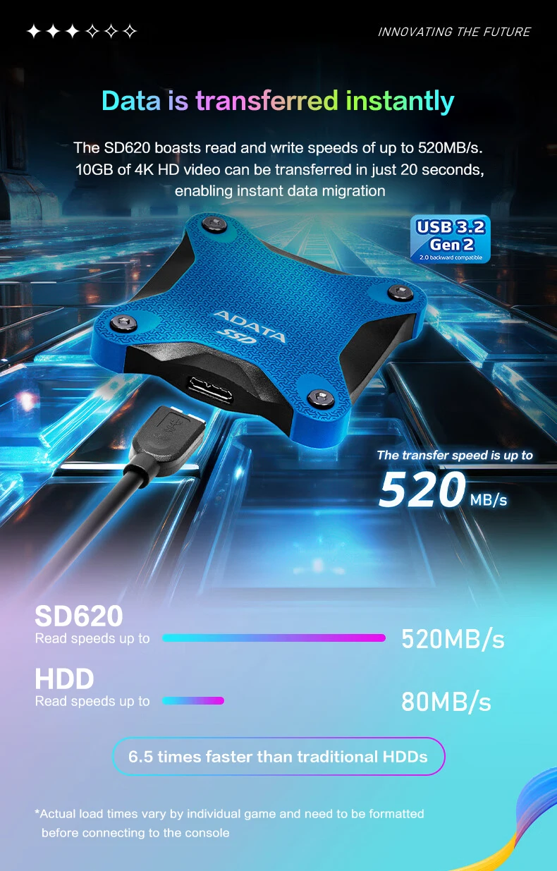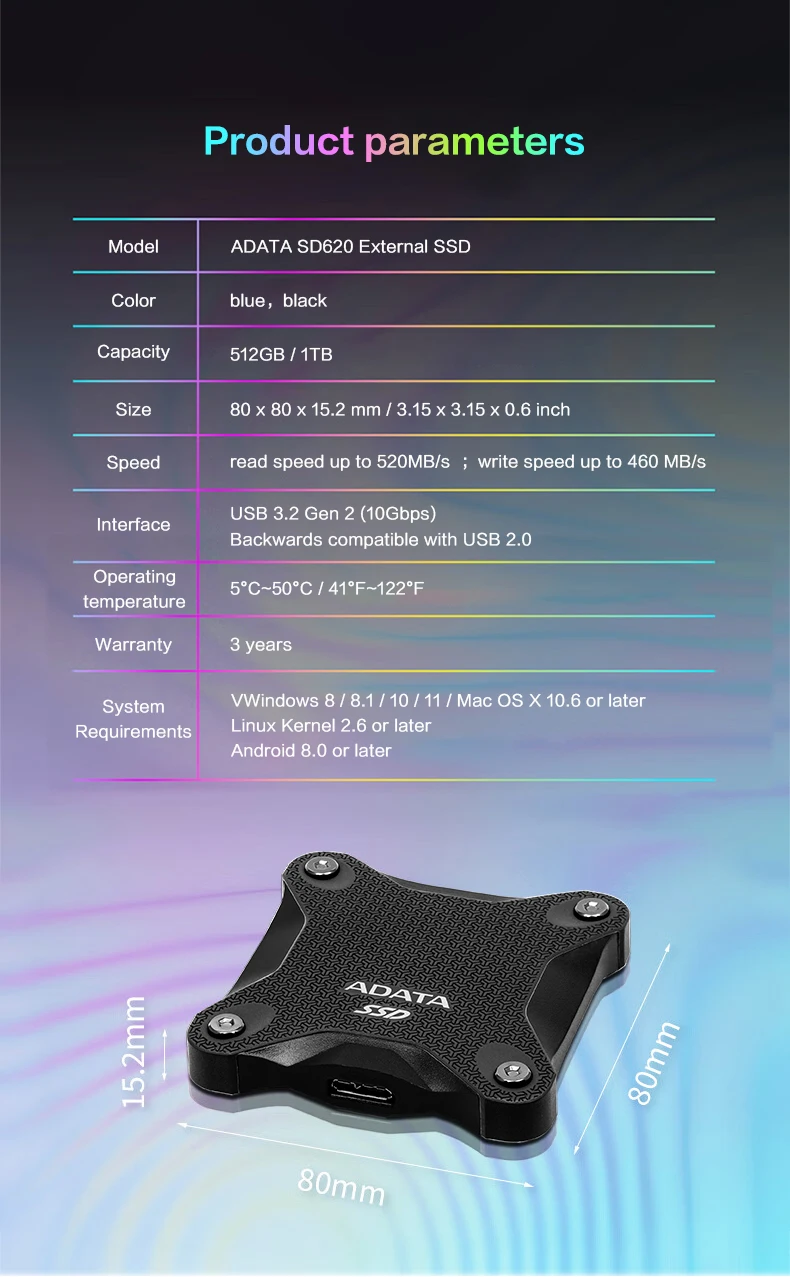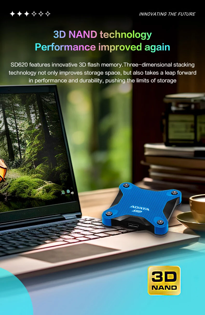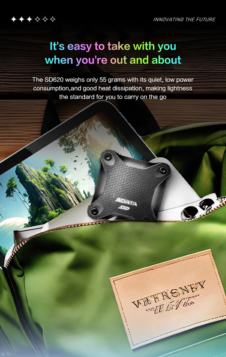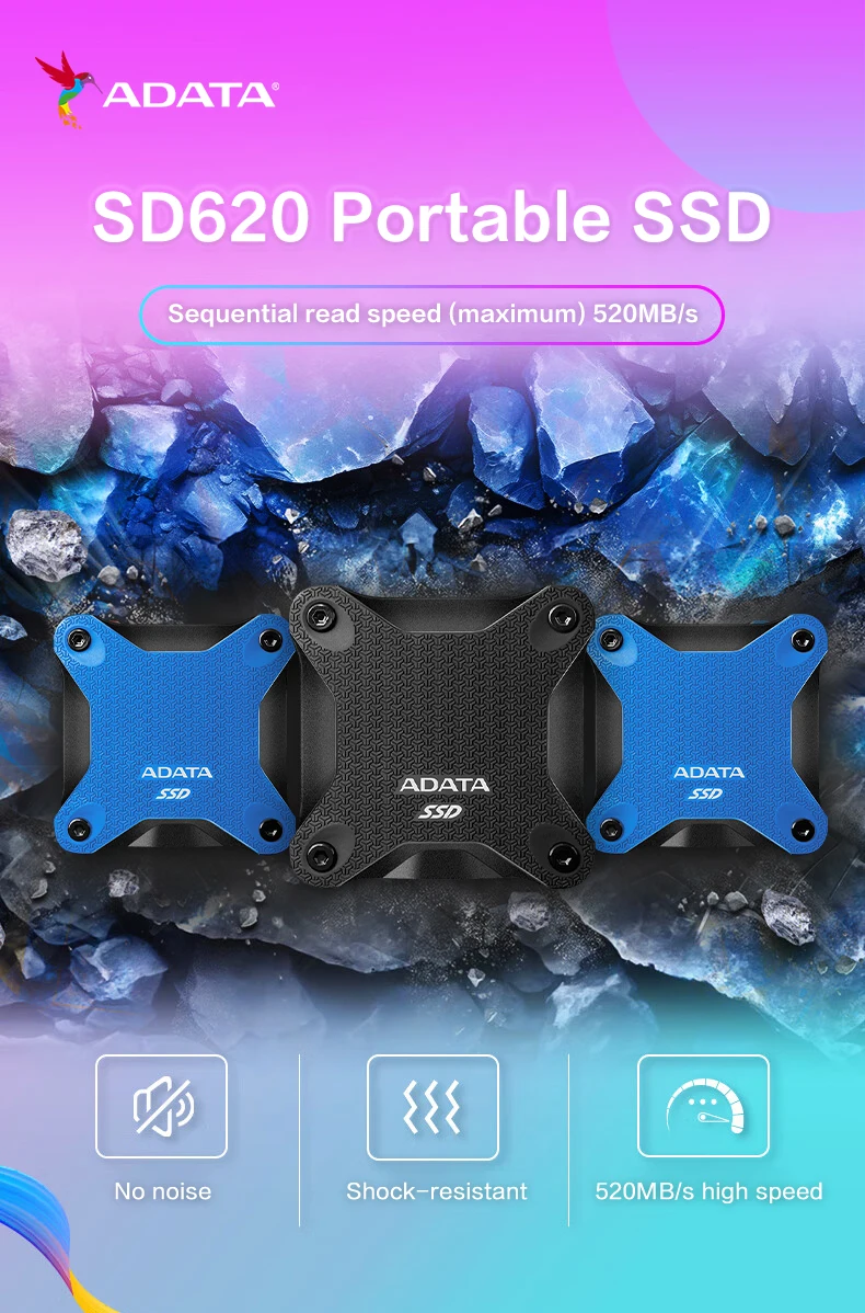 Внешний твердотельный накопитель SD620 обеспечивает скорость передачи данных до 520 МБ/с, что примерно в 5 раз выше, чем стандартные внешние твердотельные накопители (около 100 МБ/с).Очень стабильный и мощный, SD620 передает данные плавно и без задержек.SD620 весит всего 55 грамм, что делает его легким и портативным, а также имеет устойчивость к падению и ударам MIL-STD на уровне 1,22 метра.Его можно использовать с несколькими устройствами, такими как ноутбуки, настольные компьютеры, телефоны Android и планшеты.SD620 это шикарный и спортивный, а также отличный новый вариант для внешних устройств хранения данных!