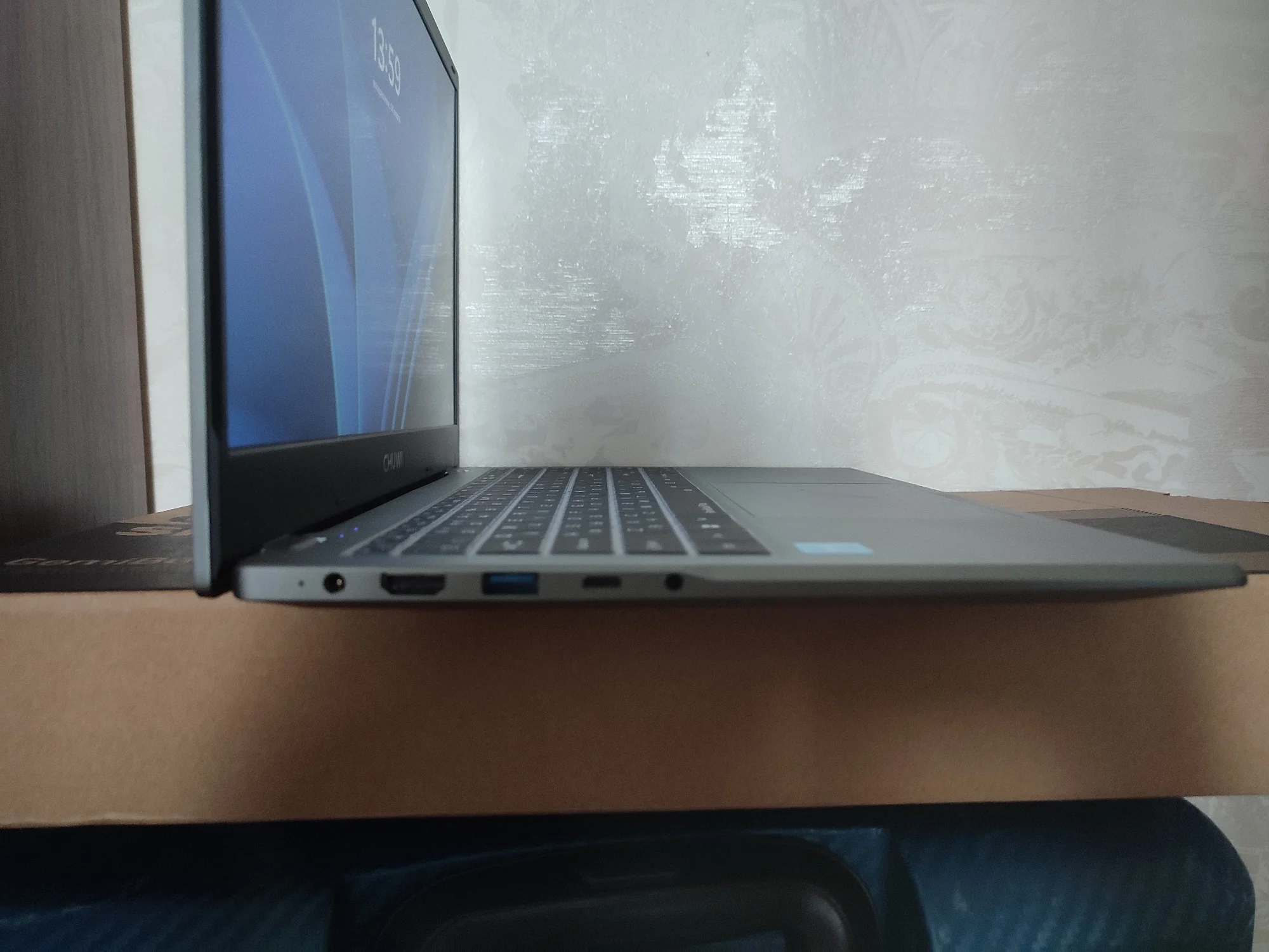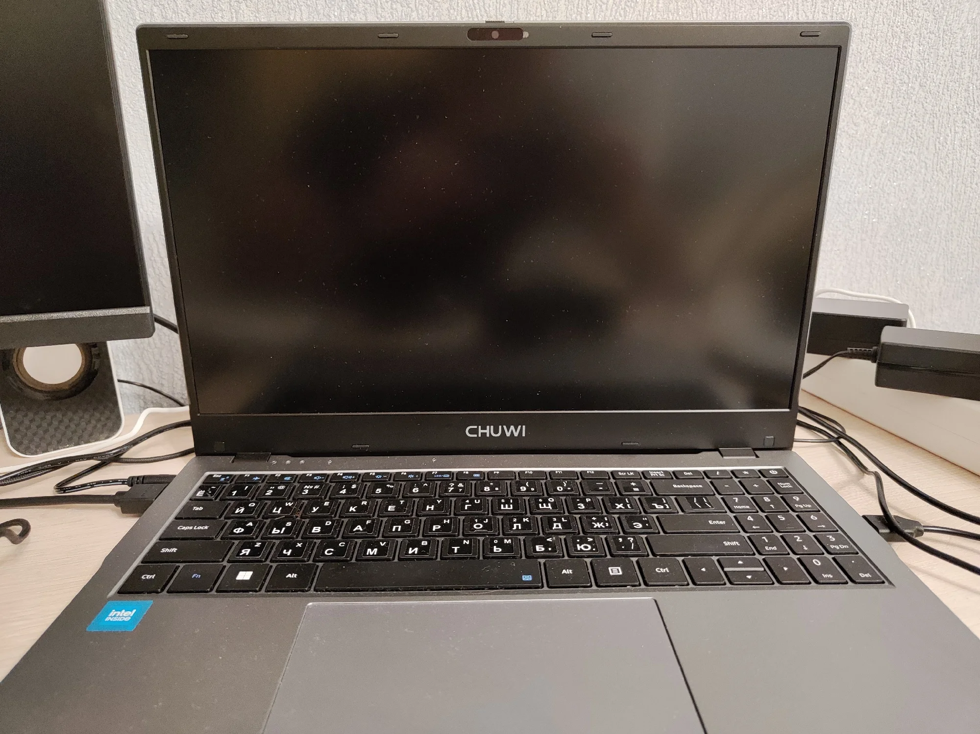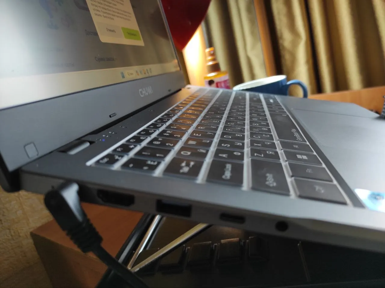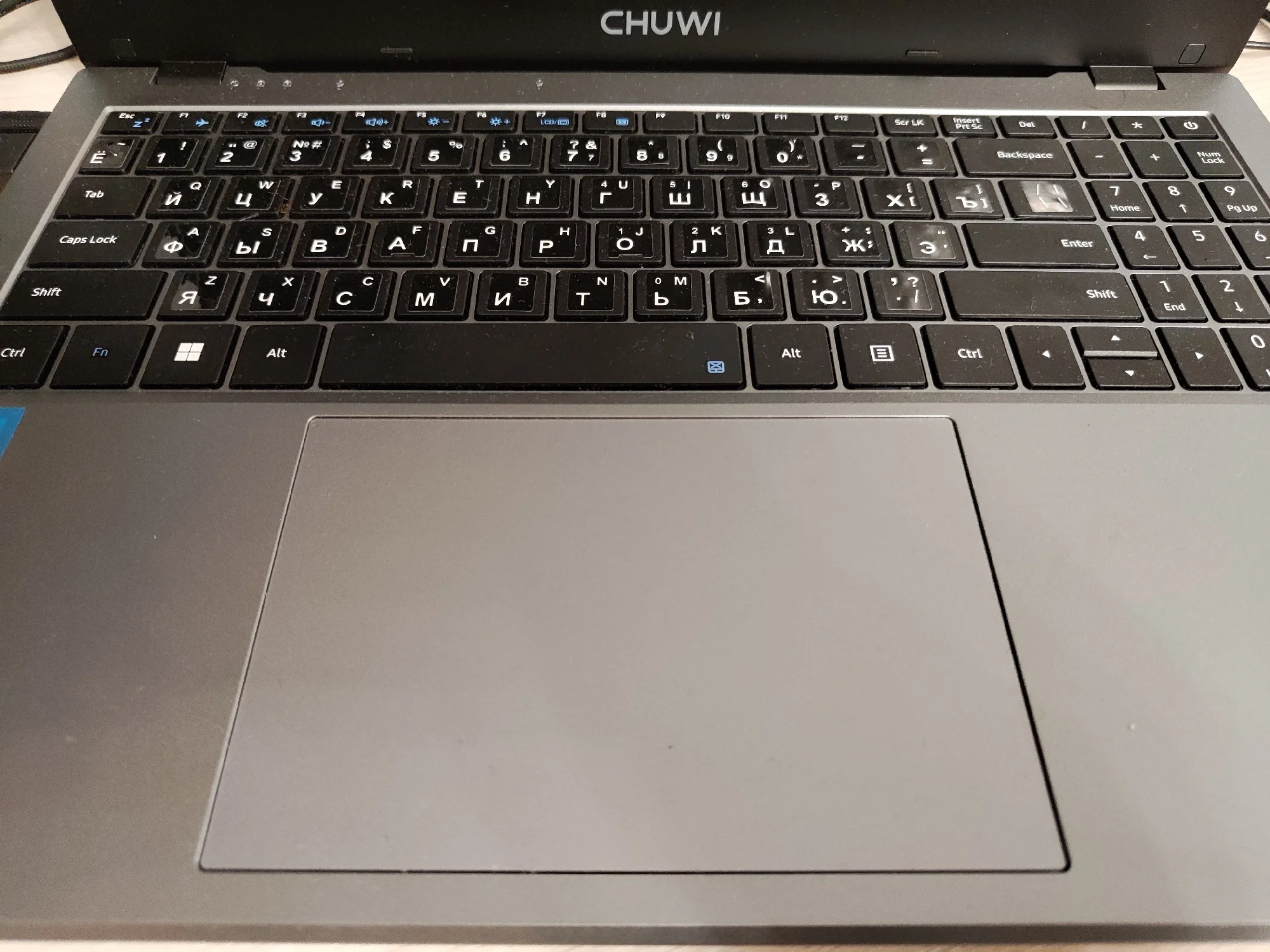 Брала на замену своему старенькому Асусу. По работе приходится много печатать - очень много) Старый ноут не справлялся - буквально пять-шесть открытых вкладок в браузере приводили к ощутимому нагреву и постоянным уведомлениям о чрезмерной нагрузке. Бесил дико)) А по работе приходится открывать по десятку и больше вкладок и одновременно работать с текстовыми приложениями и фоторедакторами. Честно говоря, остановилась на нем в последний момент, потому что скидка была такая привлекательная, что не устояла. Посмотрела характеристики процессора и решила - была не была. Пользуюсь второй день. Первые впечатления - он тихий, по сравнению с предыдущим. практически бесшумный. Раскладка только латиница. Но продавец положил силиконовую накладку на клавиатуру с кириллицей. Для меня она стала открытием - легла идеально, не ерзает, не съезжает. Клавиши тихие, достаточно мягкие (в плане нажатия), то есть при печати усилие минимальное. Кстати, в моем экземпляре звук нажатия на тачпад громче, чем звук нажатия на клавиши)) Тачпад достаточно громко клацает и щелкает и при одиночных-двойных кликах в центральной части, и при нажатии на углы. А еще он огромный (тачпад). Пока еще не определилась записать это в достоинства или странности) Прямо из коробки ноут готов к работе. Настройка системы заняла буквально пару минут. Активация Windows прошла мгновенно. Перед первым включением дала ему отогреться пару часов (принесла с мороза), заодно за это время он полностью зарядился. Рядом с разъемом для подключения зарядного провода есть светодиод, который при зарядке меняет цвет с красного на зеленый. Сегодня юзаю его на батарее. За три часа потерял 35% заряда. Не много не привычный 11 Home - но это лично для меня, я, как правило, работала на Pro. Корпус пластиковый - ровный, гладкий, без зазоров. Не скрипит, не болтается. Выглядит очень аккуратно. Корпус тонкий. Порты сгруппированы ближе к экрану. Крышка одной рукой не открывается - нужно двумя и с усилием))) Экран матовый и достаточно блеклый, но настраиваемый. Шнур питания стандартной толщины - не хлипкий. Сам адаптер на вилке. Он большой и Г-образный, то есть, мне пришлось переставлять сетевой фильтр в другое место, потому что вилка старого ноута втыкалась сверху вниз, а для этого нужно больше места. Кстати, можете посмотреть на фото, насколько толще стандартный зарядный кабель у моего старого ноута. Для сравнения размеров на фото: зарядный провод с вилкой (Asus), зарядный провод Chuwi, зарядка от смартфона, пульт от телевизора. На первый взгляд - очень достойное устройство. Пока для моих целей подходит прекрасно. По заказу: товар был отправлен в день заказа. Отслеживался ровно до таможни. Потом по России - тишина. Пришел на неделю позже заявленного срока. Коробка изрядно "пожеванная", верхняя упаковка поцарапана и порвана, но сам ноутбук целый. Внутри картонной коробки он был вложен в толстенький пенопластовый короб. Это, видимо, его и спасло.