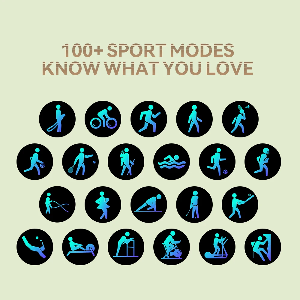 100 + спортивные режимы (ходьба, бег на открытом воздухе, езда на велосипеде, езда на велосипеде, плавание, Йога, эллиптический тренажер, баскетбол, футбол, бадминтон, настольный теннис, регби, теннис, бейсбол, скалолазание, прыжки в длину, хула-Хуп, волейбол, гольф, приседания)