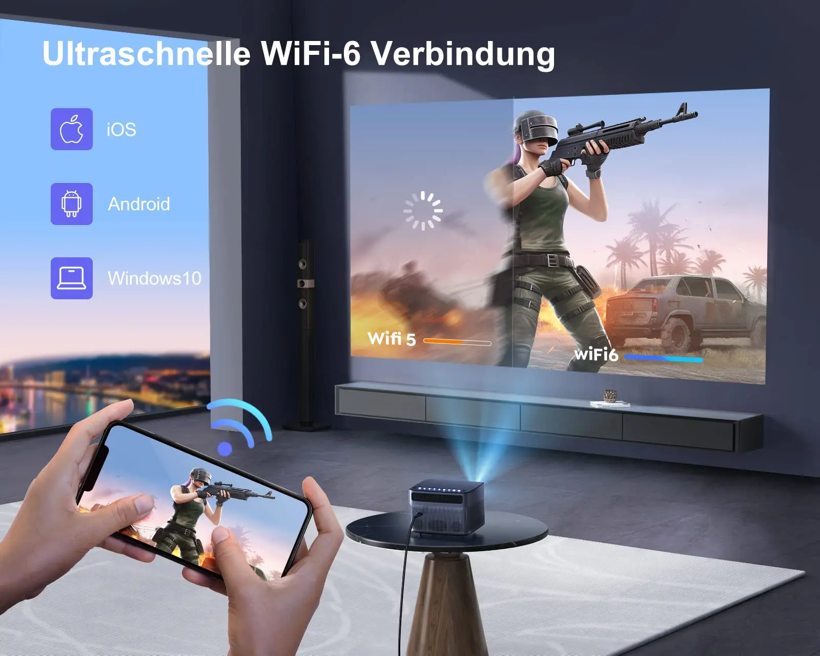 No latency Ultra-fast WiFi 6 & Two-way Bluetooth 5.2 WiFi projector uses industry-leading WiFi 6 technology, the transmission is faster and more stable, enjoy a smooth viewing and gaming experience! Especially when you play on Xbox, Switch, PS5, and more! The Bluetooth projector supports two-way transmission, which can be connected to mobile devices and used as a Bluetooth speaker. In addition, equipped with 12W Hi-Fi speakers giving you a sense of immersion.