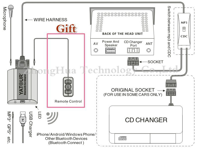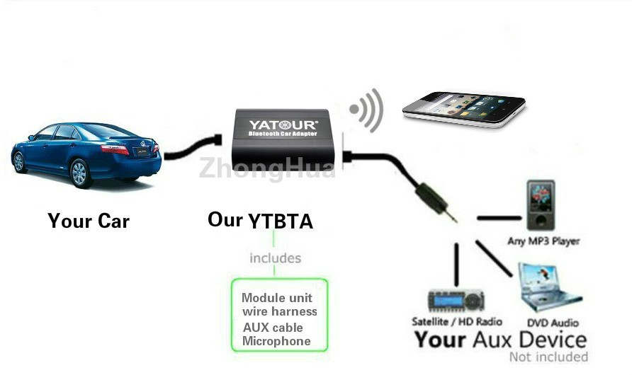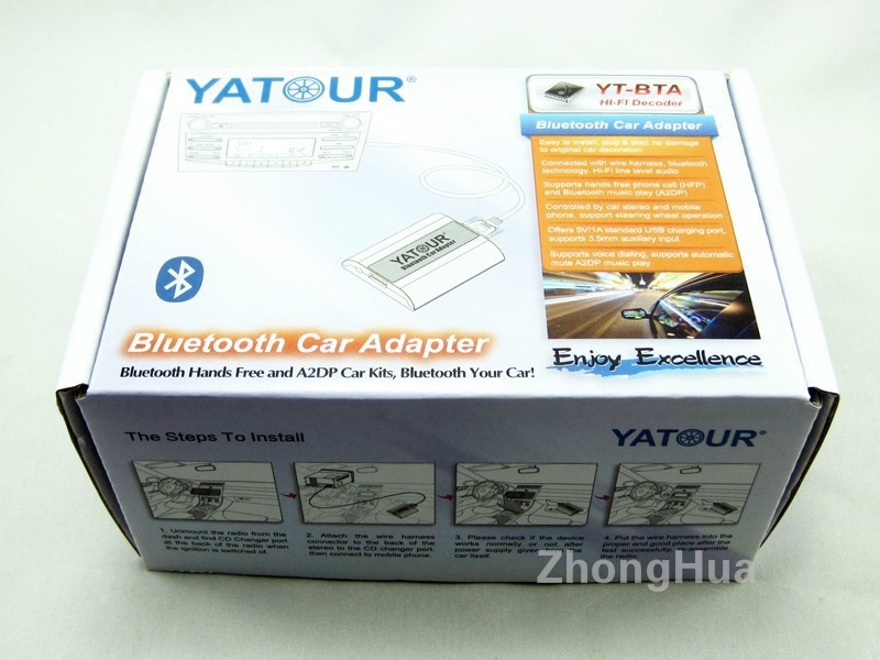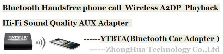 В настоящее время использование мобильного телефона во время вождения считается опасным, а автомобильный комплект громкой связи обеспечивает безопасность вождения. Поскольку использование смартфонов широко распространено, большинству водителей настоятельно необходимо наслаждаться огромными источниками музыки и другими приложениями своего смартфона через автомобильную стереосистему. Для вышеуказанных требований выпущен автомобильный адаптер Yatour Bluetooth (BTA). Разработанный в соответствии с оригинальным протоколом автомобильной стереосистемы OEM, BTA-это высокотехнологичный продукт, инновационно интегрированный с новейшей стандартной технологией Bluetooth.