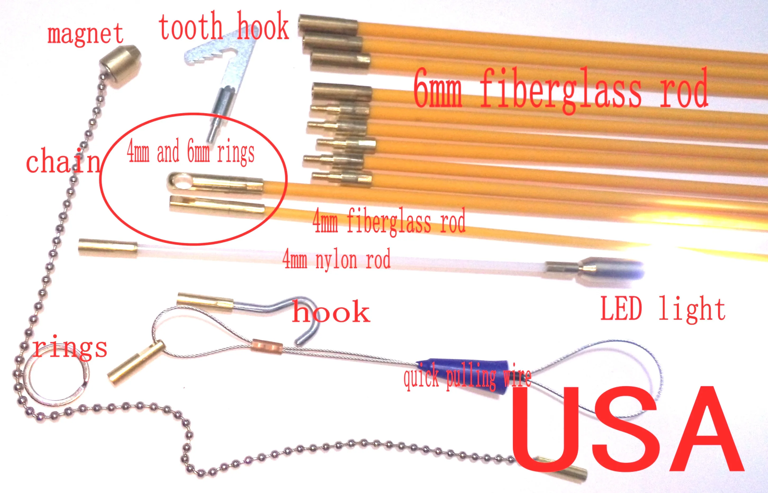 Комплекты кабельного доступа 20x100 см 10 стержней с крючком, кольцами, светодиодный светильник, магнит, съемник цепного троса, толкатель стержня, стержень для съемника проволоки, стержень из стекловолокна, стержень из фибры, трубы из стеклопластика удочка