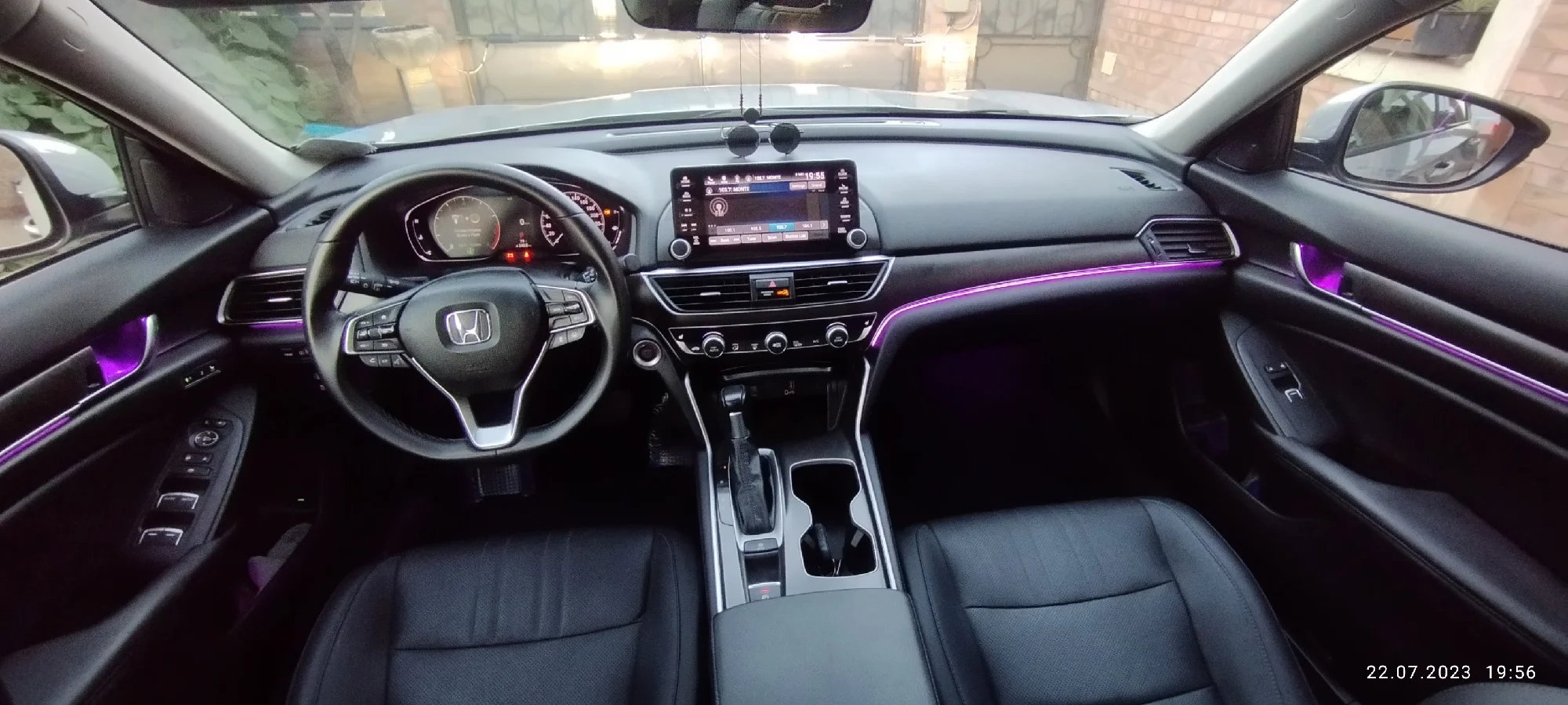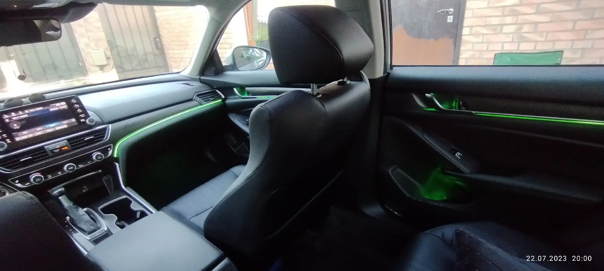 отличный кит, для оснащения авто амбиент подсветкой. все четко работает, приложение понятное и быстрое, регулировка яркости интенсивности и прочей ерунды. да это просто комплект, нет приветствия и демо, но и стоимость в два раза дешевле аналогов. что хотелось бы видеть так это отдельную регулировку яркости или вкл/выкл подсветки ручек и подстаканников. кстати обрезки ленты не спешите выбрасывать, если верить черную фольгу то можно увидеть пятаки для пайки, легко припаять и дополнить ещё подсветку, ТК блоки имею 4 выхода а задействованы только 3😉 буду брать ещё однозначно ну и фото моего аккорда🤤