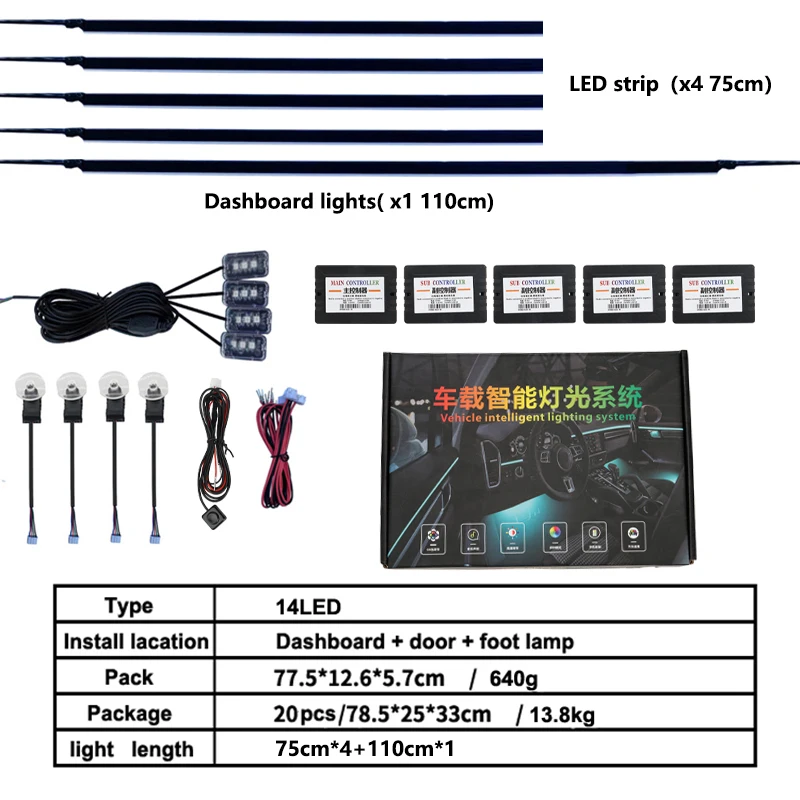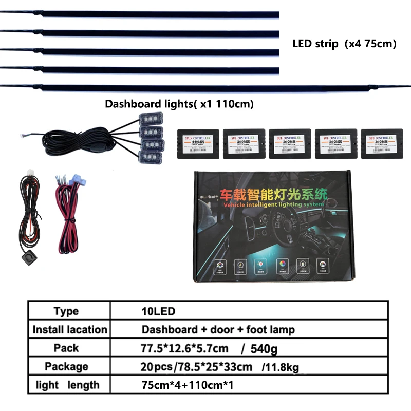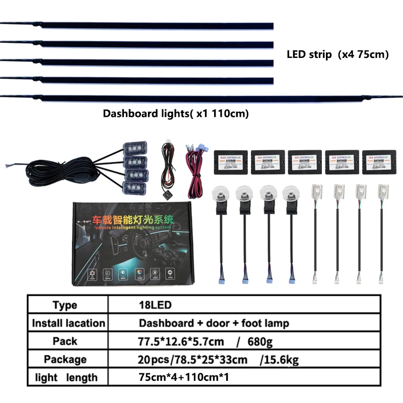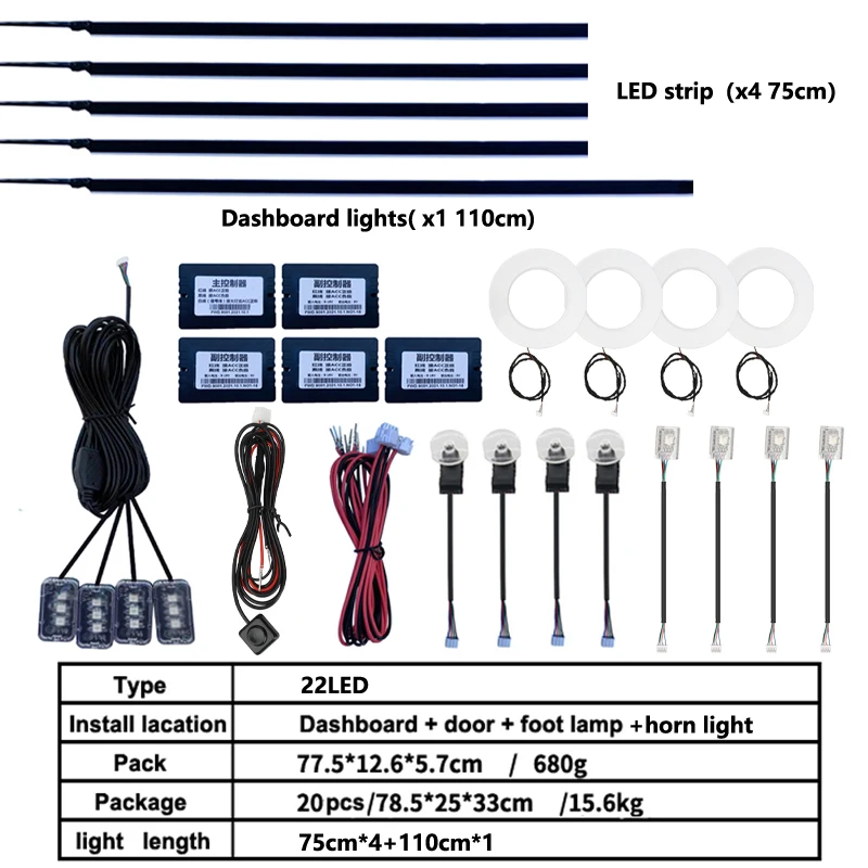 - Тип изделия: 22 в 1 (5 * светодиодная лента (75 см * 4 + 10 см * 1 + 4 * подсветка + 4 * дверные чаши + 4 * фонари для хранения + 4 * габаритные фонари)