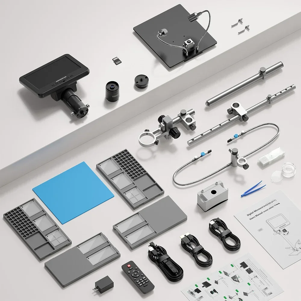 Andonstar AD246SM-Plus оснащен 7-дюймовым дисплеем, что обеспечивает комфортный просмотр без необходимости подключения к внешним устройствам. Разрешение сенсора составляет 4 мегапикселя с возможностью съемки фото до 4032×3024 пикселей. В комплекте пользователи получают три сменные линзы, что отмечается в отзыве Petr Z.: "Отличный микроскоп! 3 разные насадки под разные задачи. В том числе для микроорганизмов". Металлический корпус гарантирует долговечность использования, а поддержка записи видео в формате MP4 расширяет возможности документации исследований.