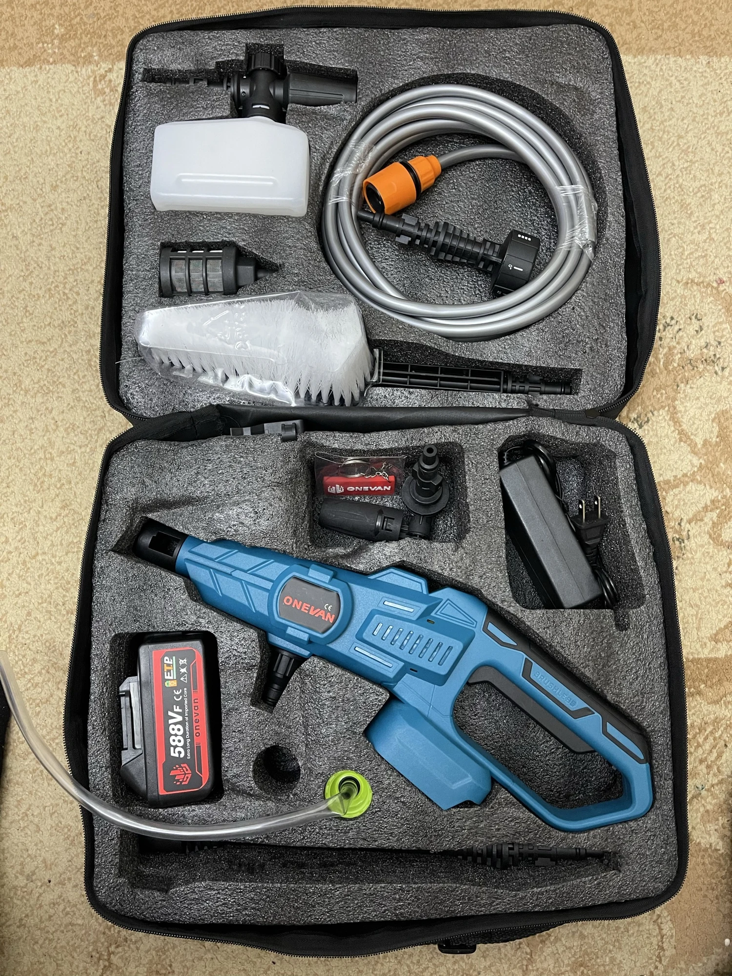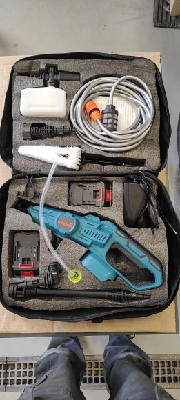 Купував на сервіс для мийки мотоциклів та для мийки авто на природі! Звісно не професійна мийка, тиск щонайменше вдвічі слабший, але тиск порядний як для акумуляторної мийки! Щоб відмити не дуже брудний мотоцикл розхід +- 5-10 л води, для нормальної мийки авто +- 20л, з піною, автошампунем і змиванням! Повністю зарядженої батареї вистарчає на 2-3 миття, є індикатор залишку батареї в % і три режими потужності! Є усі необхідні насадки, але найкраще користуватись тою що має регулятор кута струменю! Піногенератор видає дуже непогану піну, якщо заливати активну піну а не рідке мило чи автошампунь! Всередину фільтра кинув кілька нержавіючих гайок, щоб не випливав на поверхню! Єдиний мінус, як на мене, так це сумка, занадто м'яка і незручно усе назад запаковувати після користування, краще б був жорсткий пластиковий кейс! Своїх грошей однозначно вартує! Далі покаже експлуатація! Рекомендую!!!