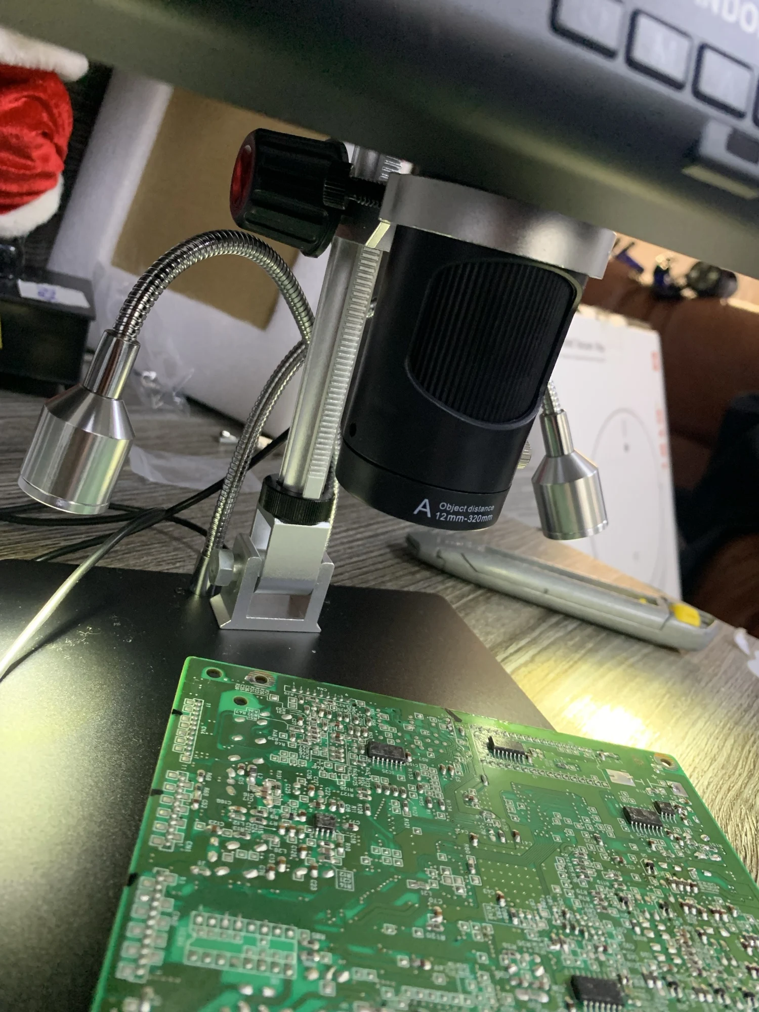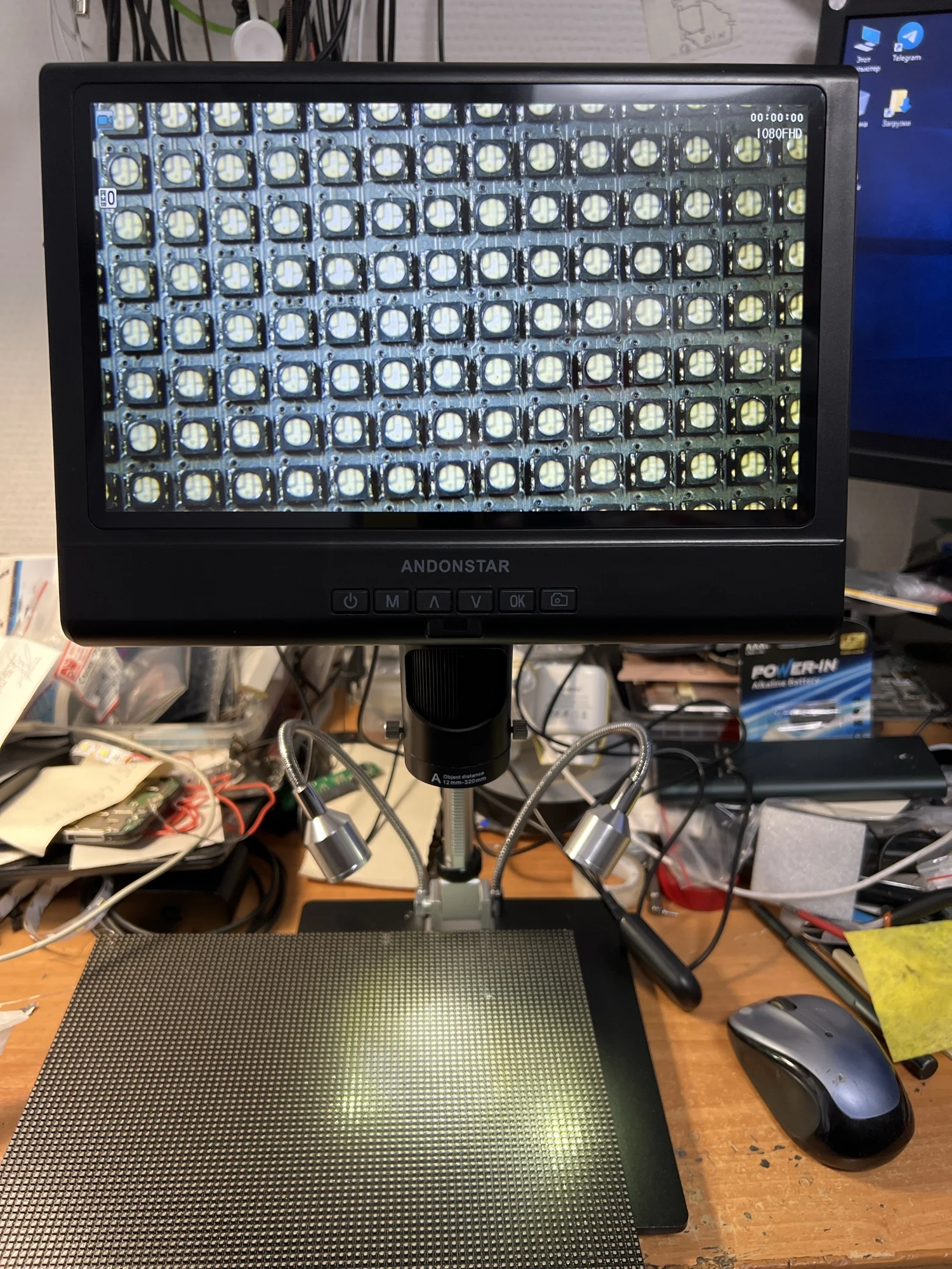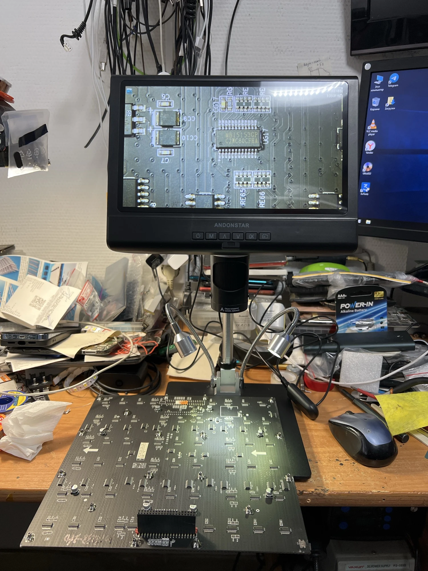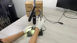 Микроскоп бомба. Фен и паяльник без проблем помещаются под объективом. Приехал с пылинкой на матрице камеры, пришлось разбирать и чистить. При разборе увидел что можно подкинуть аккумулятор и динамик так и сделал теперь настройки при выключении не сбиваются от аккумулятора работает только микроскоп без подсветки но можно доработать чтобы убрать эту лапшу из проводов есть ик приёмник можно докупить пульт если кому надо.