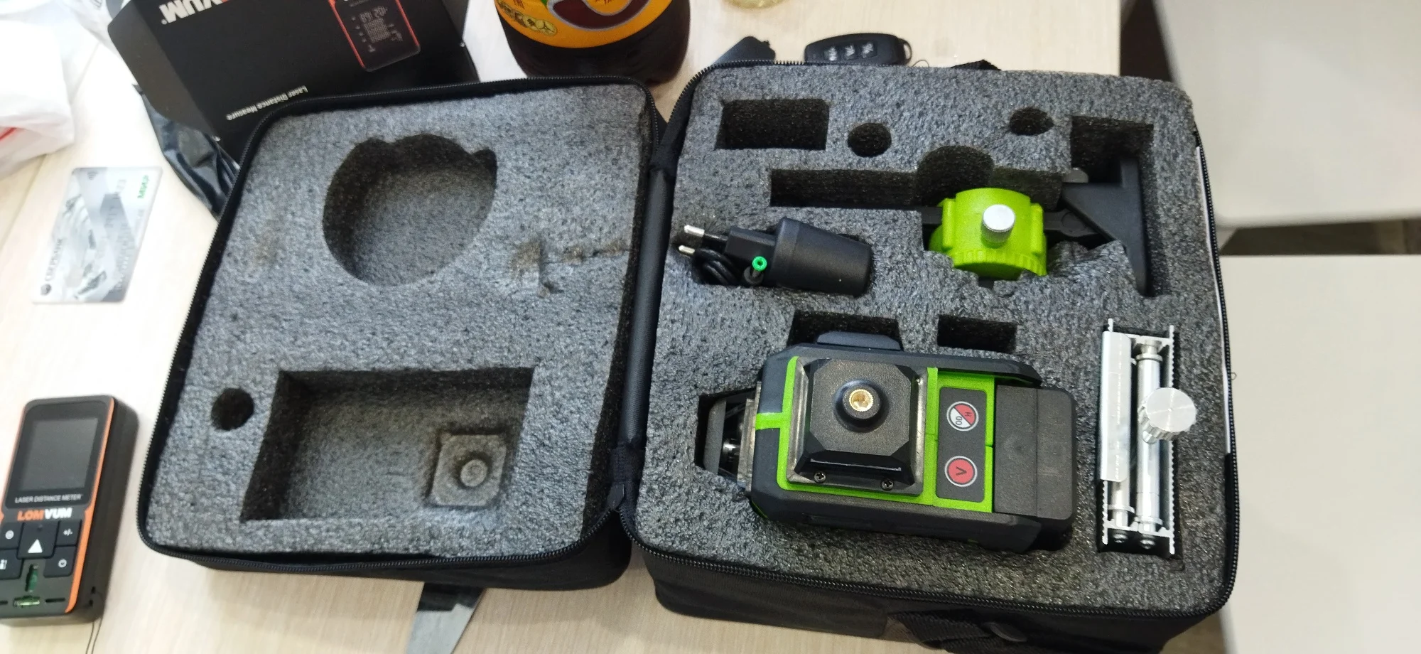 Долго выбирал среди аналогичных уровней разных брендов. Доставка шустрая- 10 дней. Упаковка отлично. Сам уровень выглядит достойно. Комплект прибамбасов на много лучше чем у другого производителя( есть с чем сравнивать у друга в бригаде 2 шт.) Батарея пришла заряжена. Линии бьёт чётко. Всё работает. Погрешность в пределах нормы для такого класса инструмента. Сравни вал со своим более дорогим бошем, которым пользуюсь несколько лет всё ОК. Продавца и товар рекомендую.