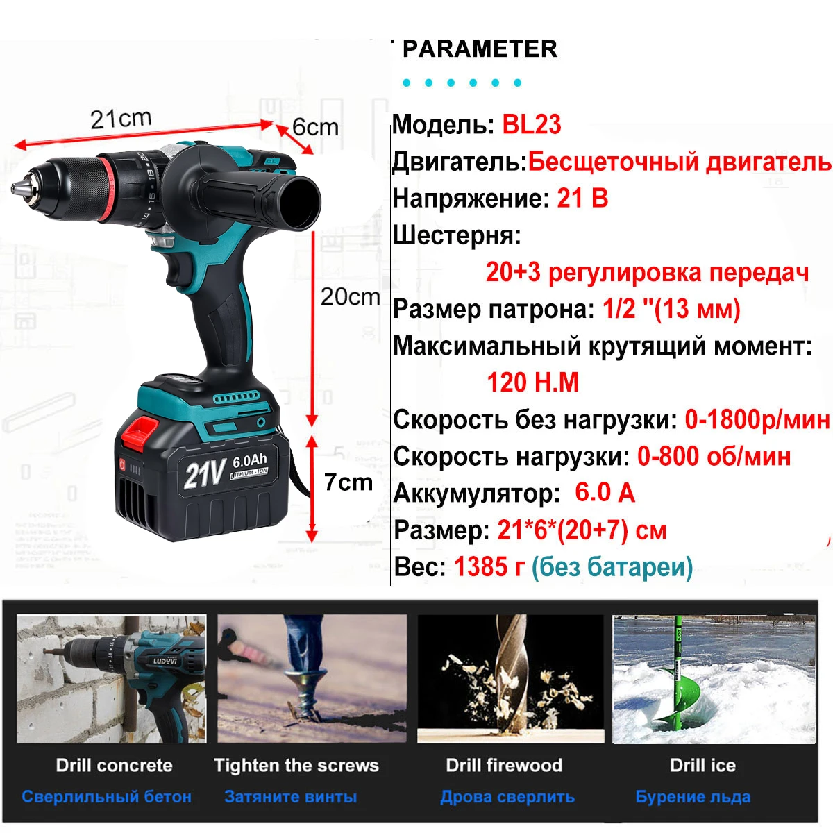 Бесщеточный шуруповерт LUDYVI 21V для ледобура