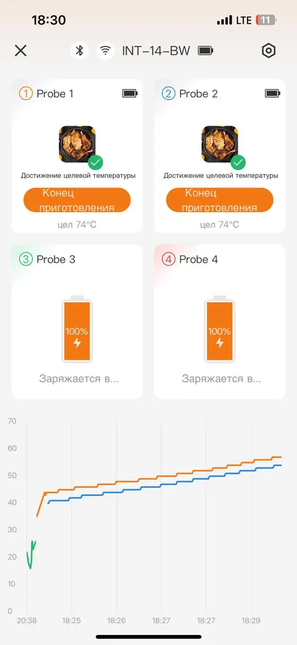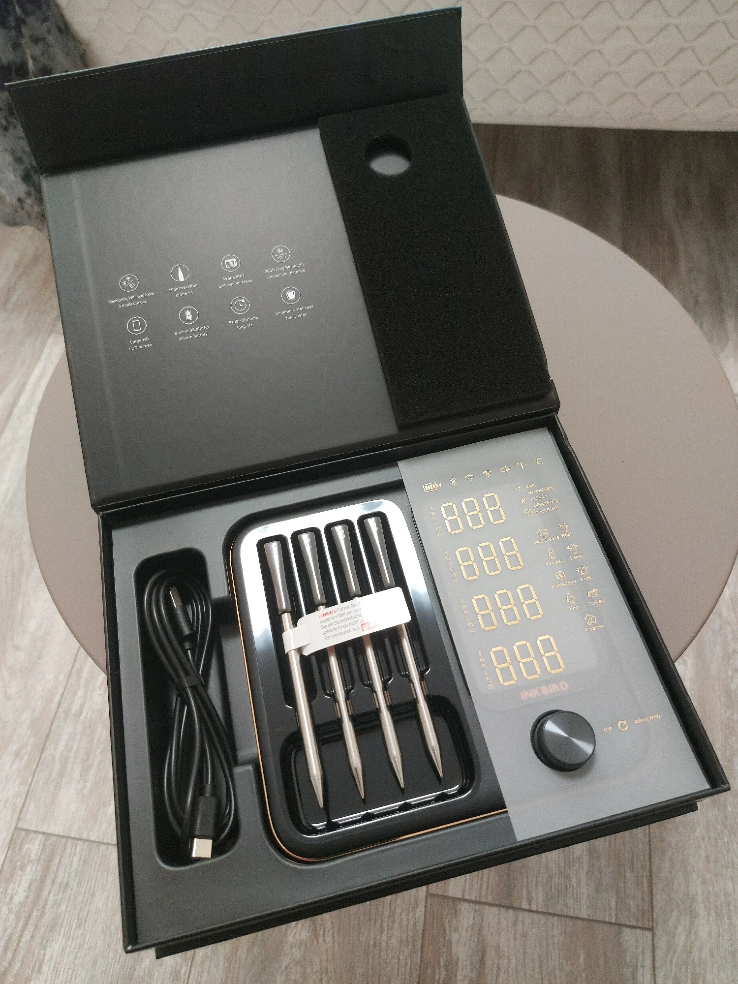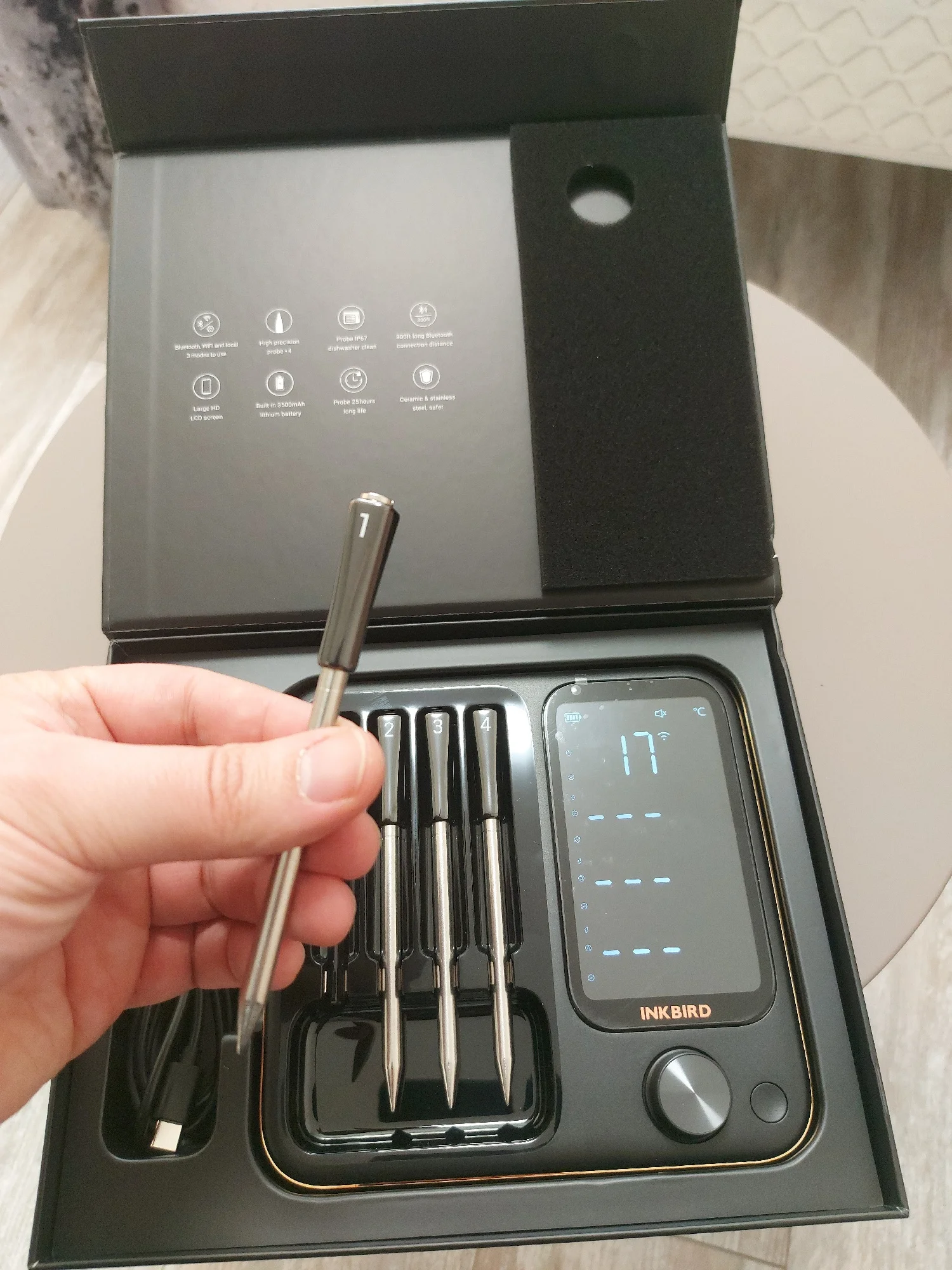 INKBIRD INT-14-BW это интеллектуальный термометр для барбекю, содержащий четыре беспроводных датчика и имеющий три режима на выбор.Вы можете использовать его через приложение INKBIRD после подключения Bluetooth и Wi-Fi.Если вы не хотите подключиться к приложению, это также поможет вам приготовить в локальном режиме.Больше не связан кабелем проводных зондов, каждый зонд может точно измерять внутреннюю температуру продуктов, эффективно сокращая отходы энергии и пищевых ресурсов и предотвращая переносимые пищевые заболевания;Больше не нужно беспокоиться о переваривании и недостаточном приготовлении.Этот продукт очень прост в использовании.Просто вставьте зонд термометра в еду, подключите его к приложению для телефона и настройте настройки.Затем можно отдохнуть и дождаться завершения приготовления.Этот функциональный термометр напомнит вам, когда наслаждаться вкусными блюдами.