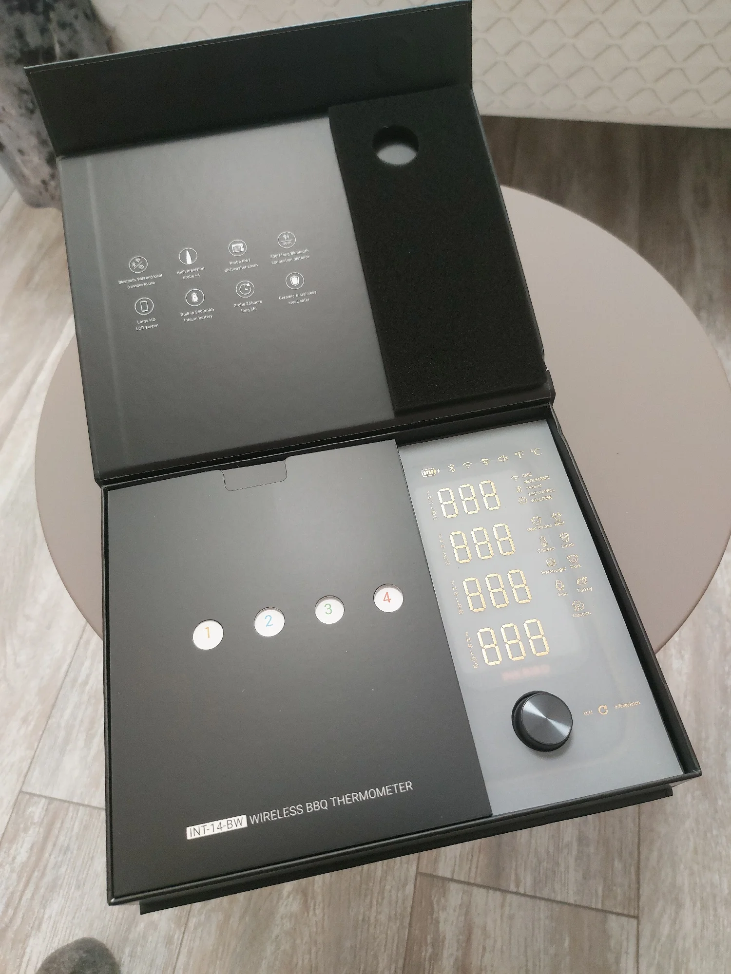 Наслаждайтесь несколькими деликатесами одновременно:Это устройство оснащено четырьмя беспроводными зондами из пищевой нержавеющей стали с ручками из циркониевой керамики, которые более долговечны, чем обычные проводные зонды, освобождая вас от запутанных проводов, делая приготовление пищи более свободным и удобным.Благодаря полному обзору ЖК-экрану высокой четкости на основании вы можете четко видеть температуру пищи каждого зонда во время приготовления.Вы можете поглотить основание к грилю или любой металлической поверхности, избегая источника огня, для лучшего обзора и удобства хранения, поскольку его задняя часть оснащена сильным магнитом.С INT-14-BW вы можете готовить, запекать и жарить одновременно, наслаждаясь целым разнообразием вкусных блюд одновременно!