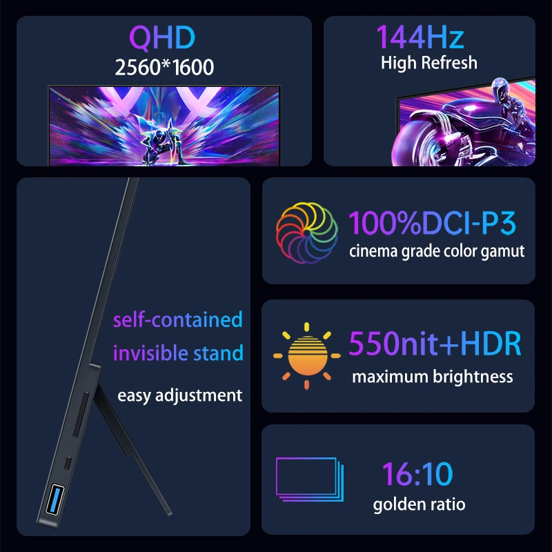 16 Inch 2.5K 144hz Portable Monitor 100%DCI-P3 550nit 2560x1600p 16:10 Travel...