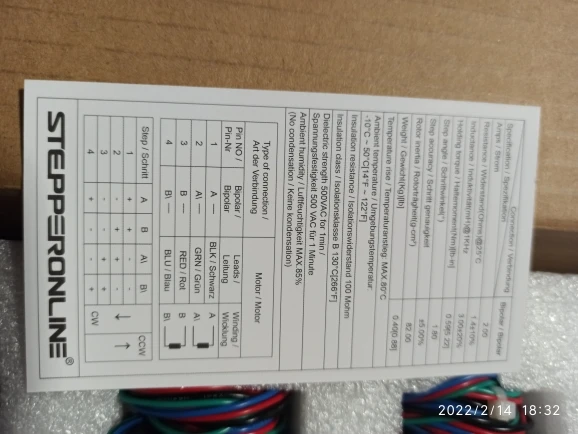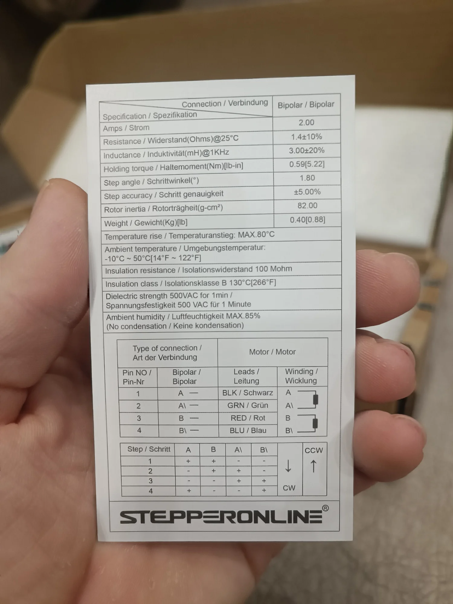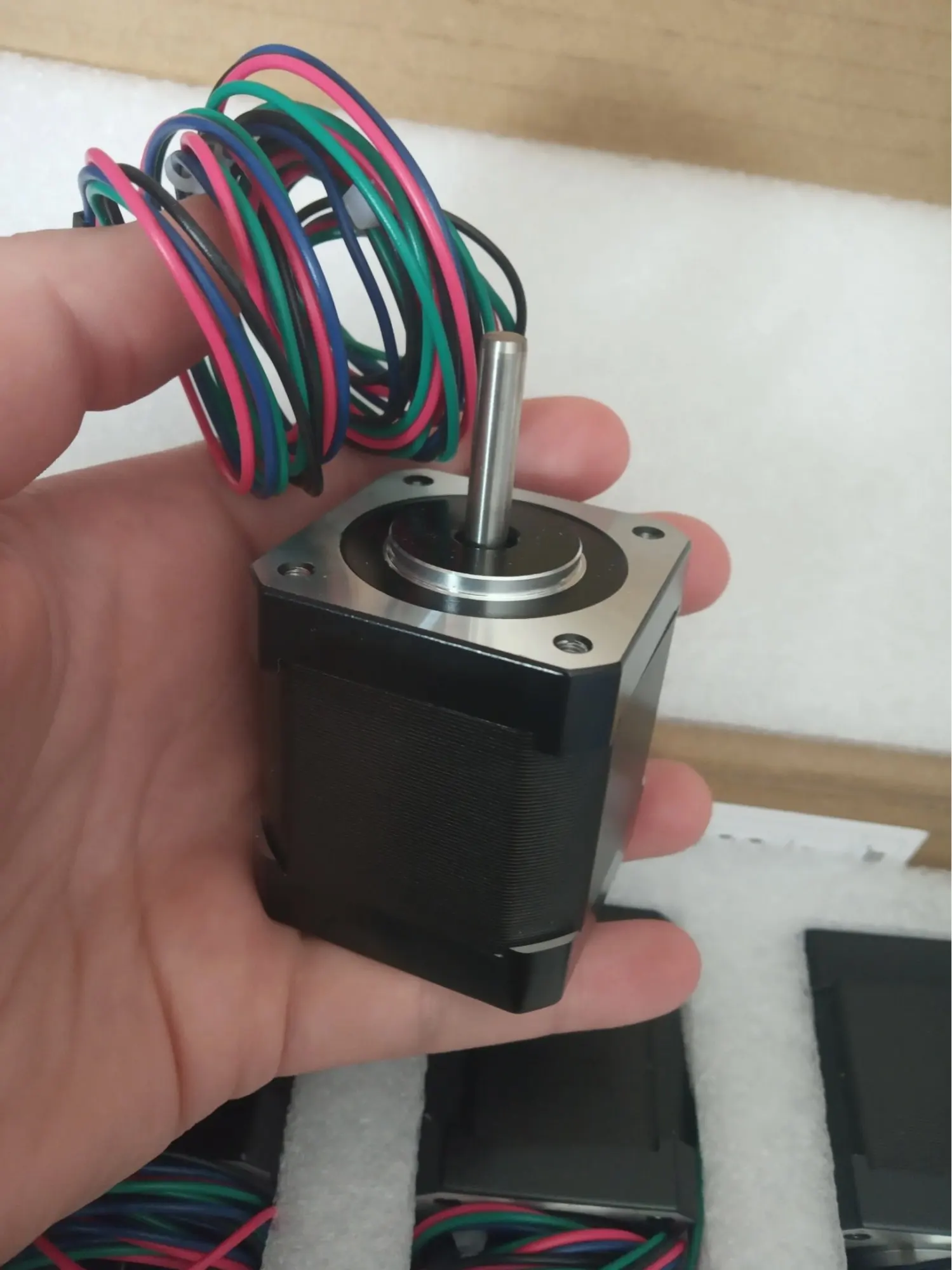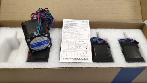 Доставка курьером 4 дня. Коробка была в одном месте вмята, но внутри вспененная прокладка, так что не страшно. Двигателя проверил - рабочие, всё отлично. Рекомендую. Распиновка проводов стандартная. Подключал для проверки к 3D принтеру.Gennadiy S. 16 апреля 2022