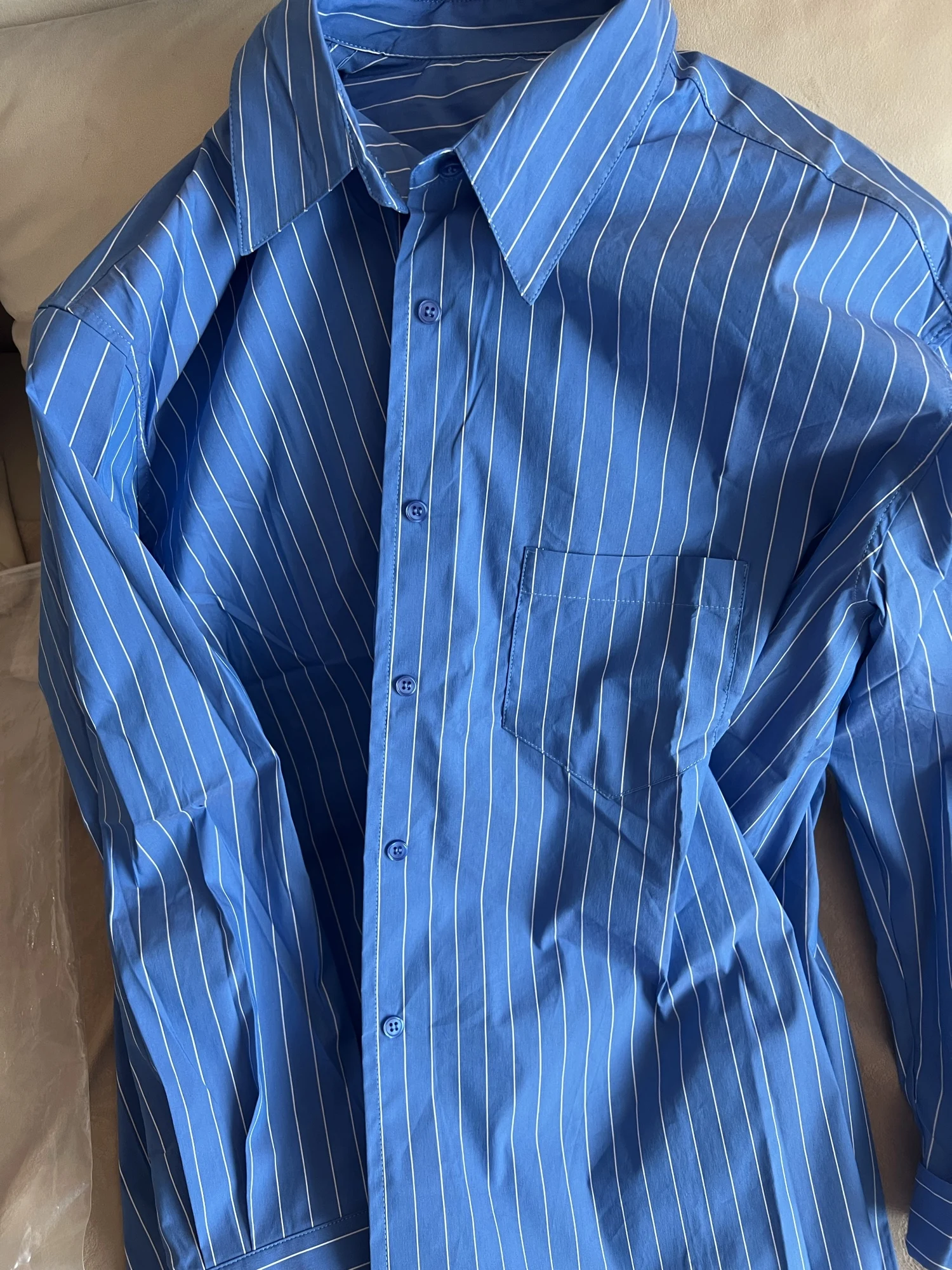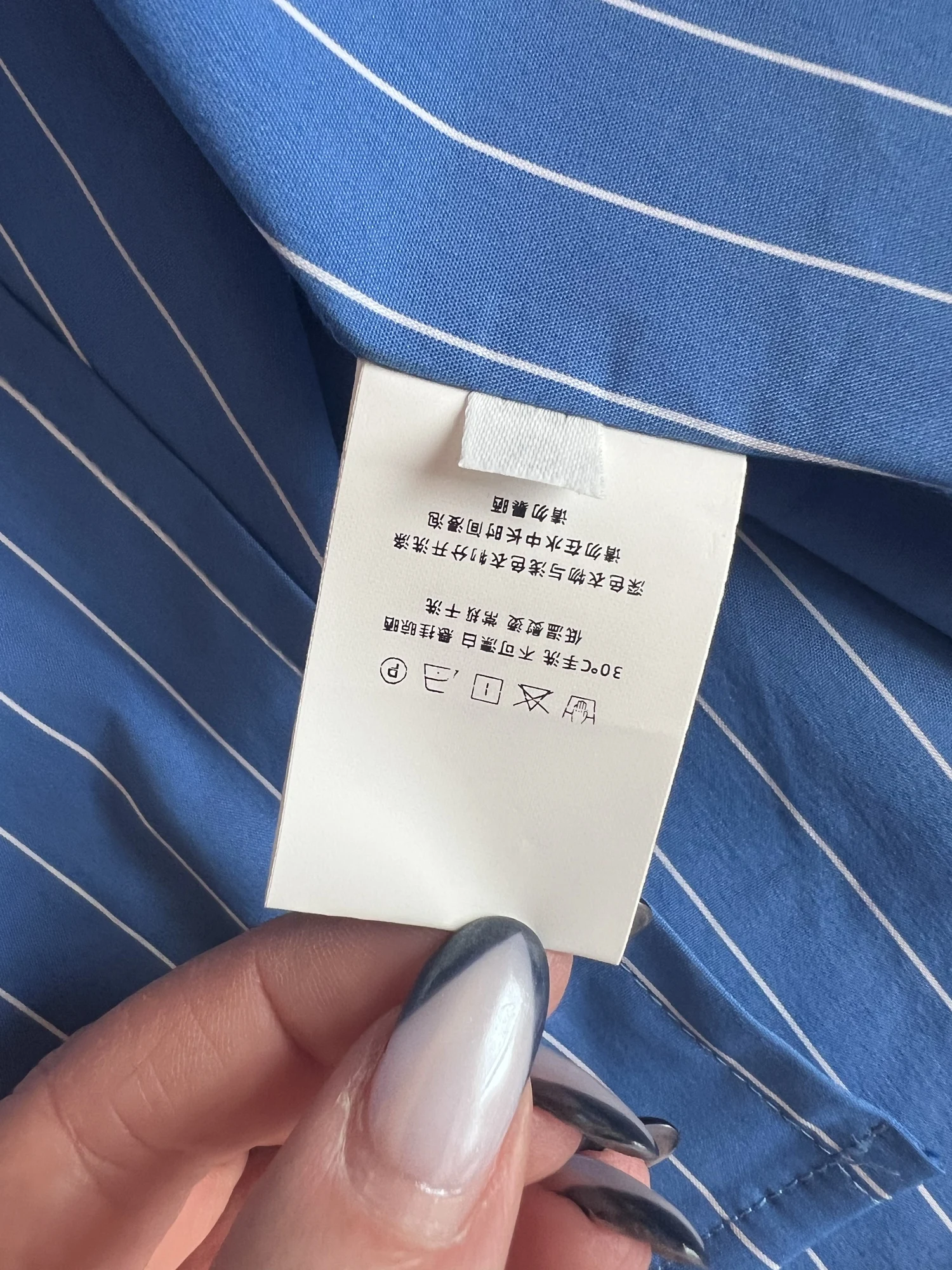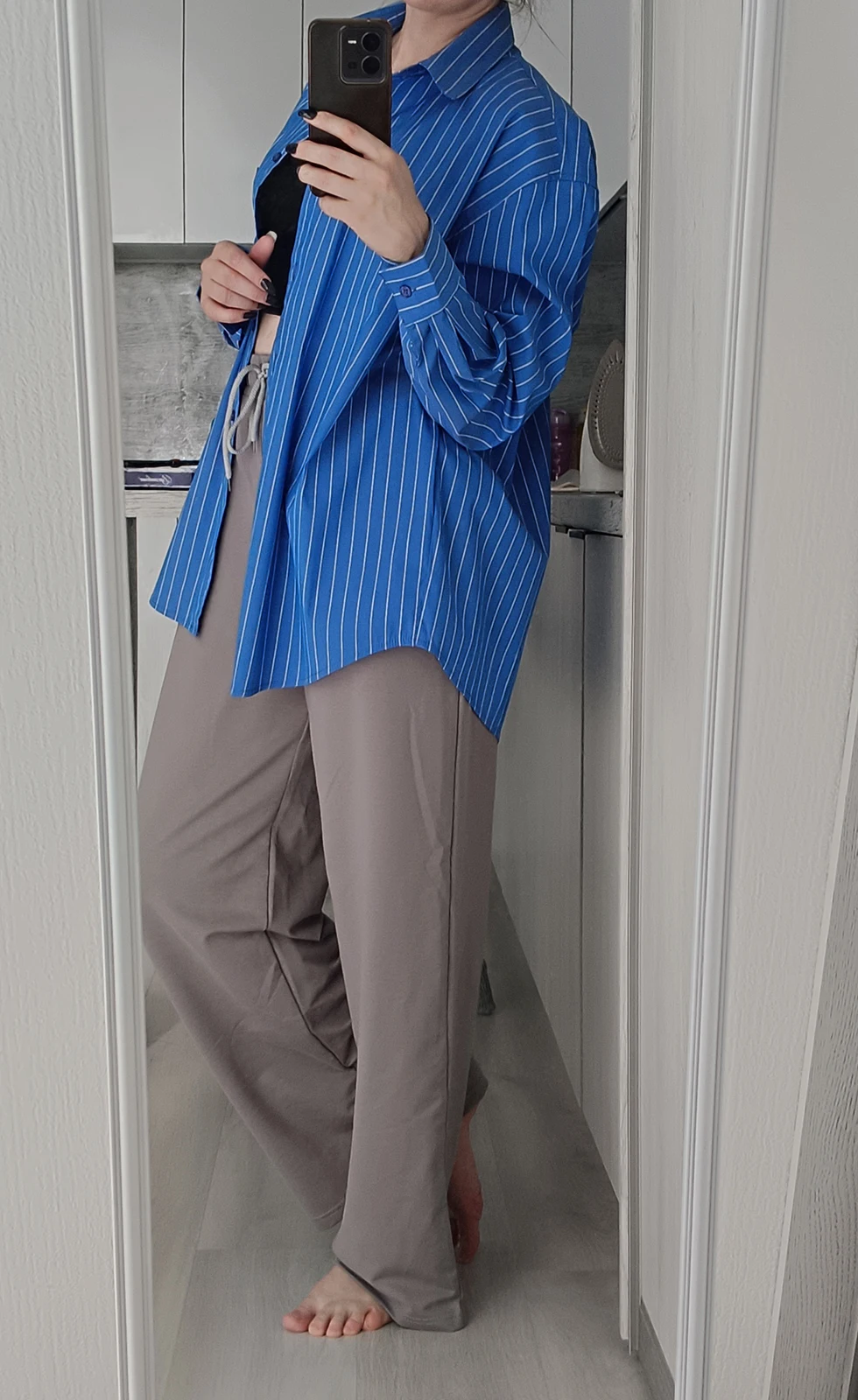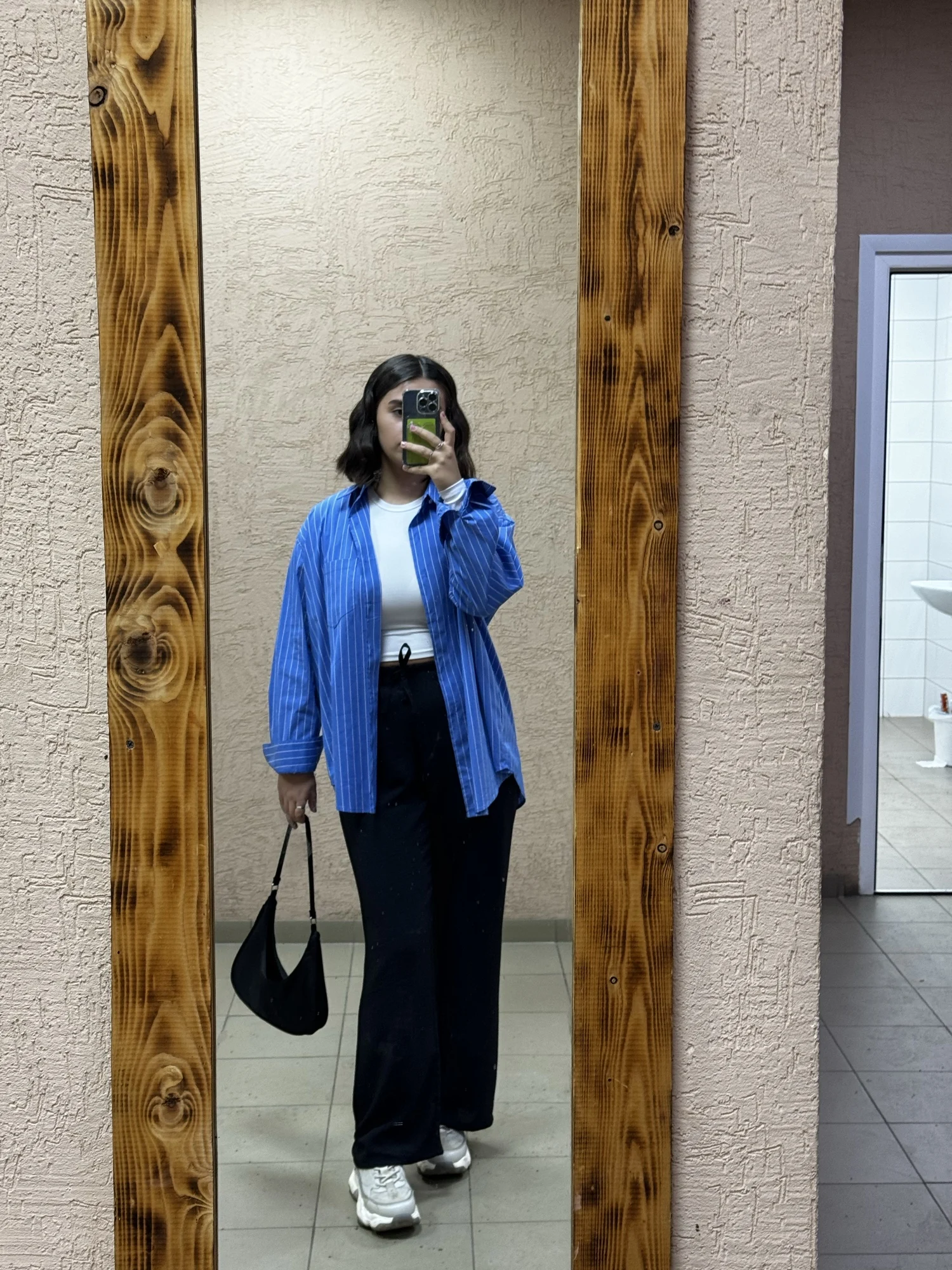 Отличная базовая рубашка. Сшито безупречно, даже полоска на кармане идеально совпадает с полоской полочки. Швы аккуратные, села оверсайз на 44, цвет яркий голубой.