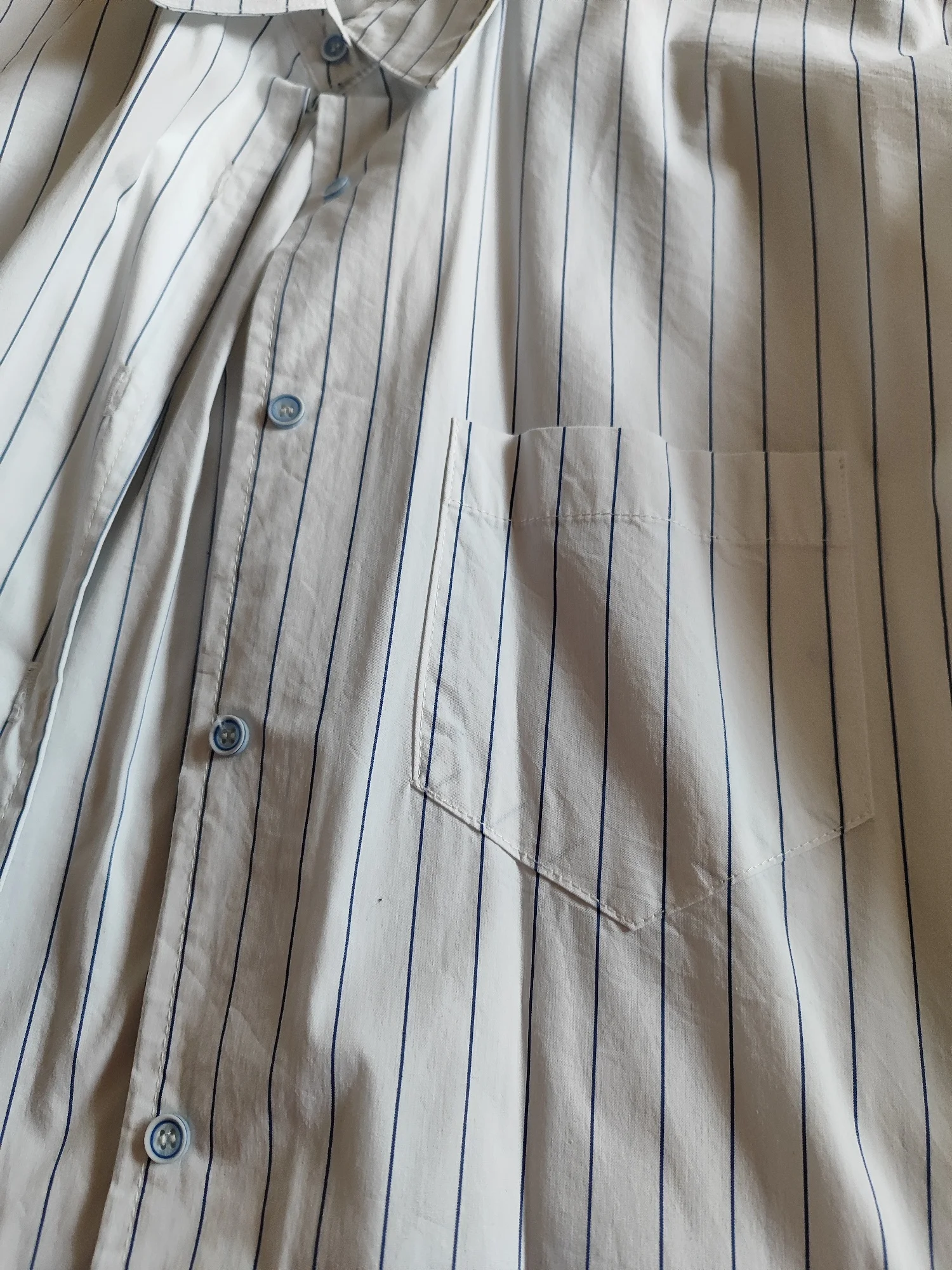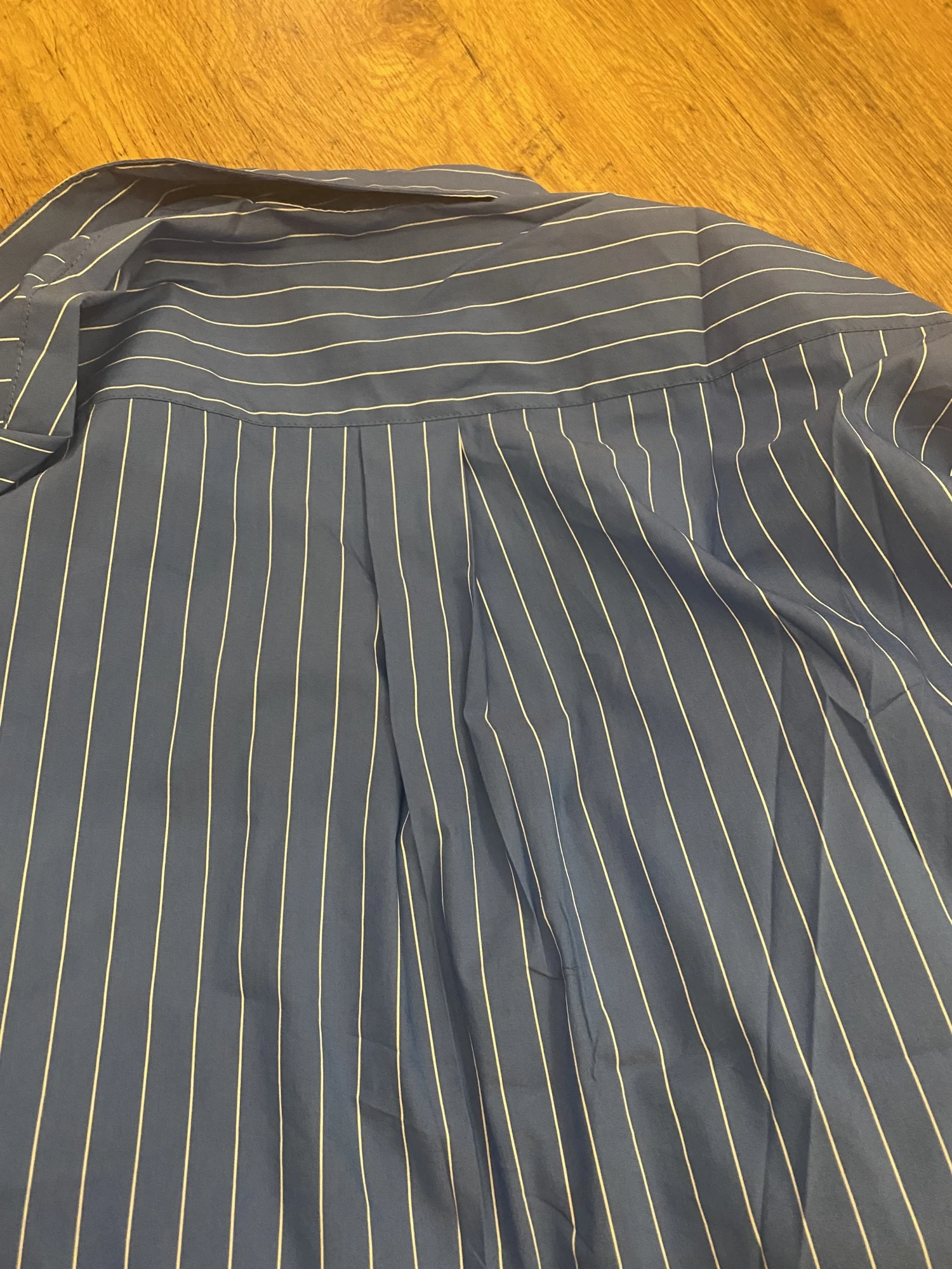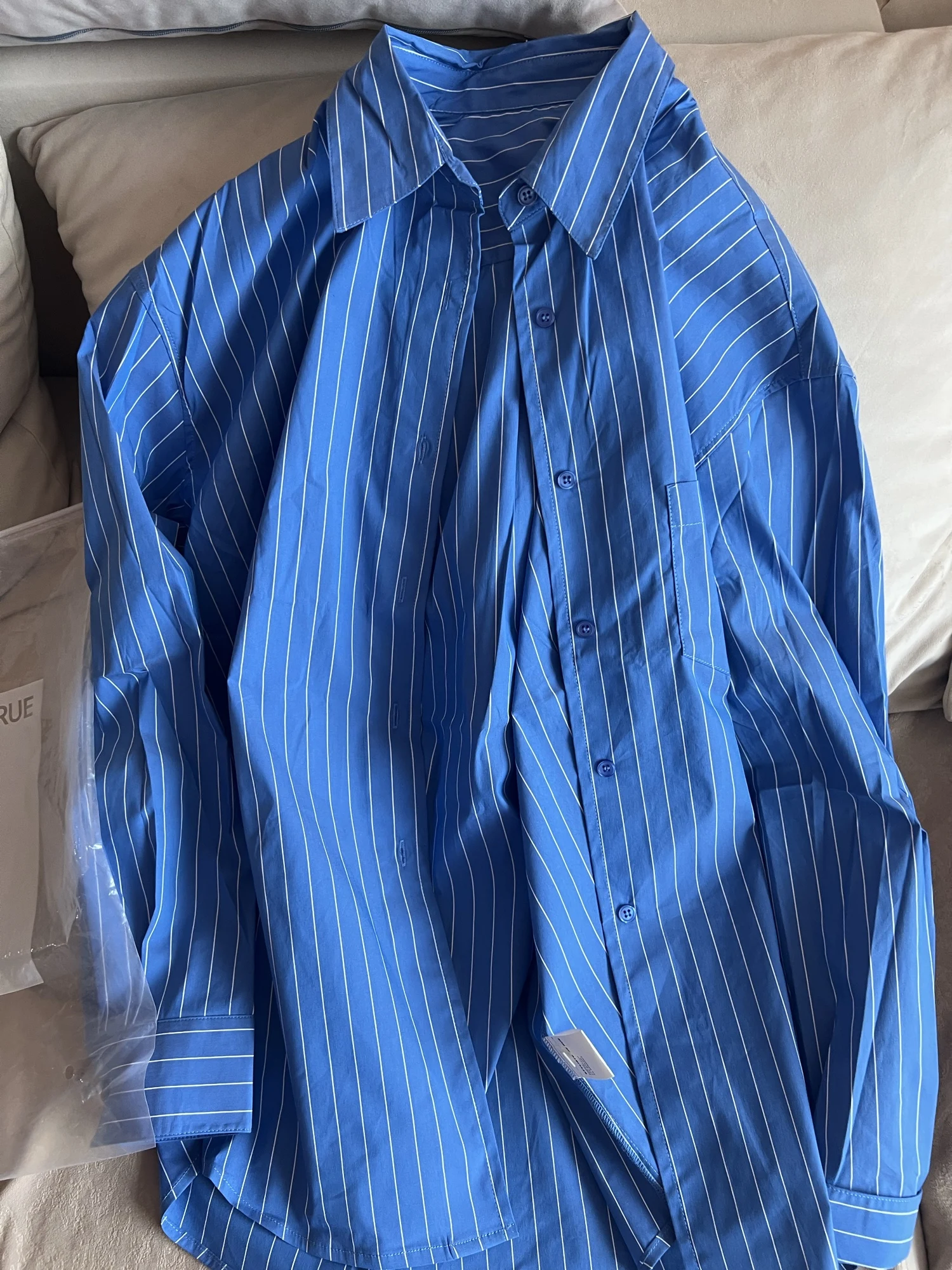 Отличная базовая рубашка. Сшито безупречно, даже полоска на кармане идеально совпадает с полоской полочки. Швы аккуратные, села оверсайз на 44, цвет яркий голубой.
