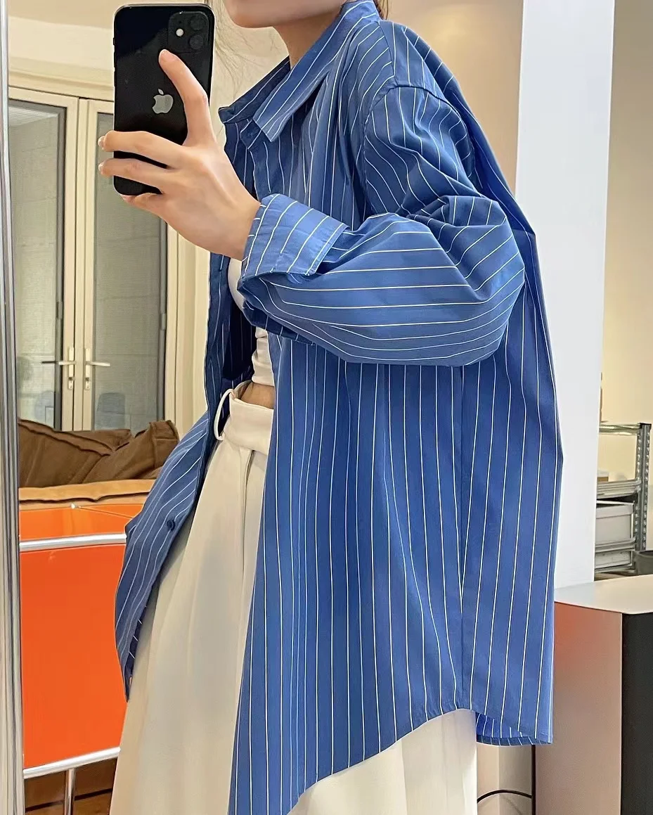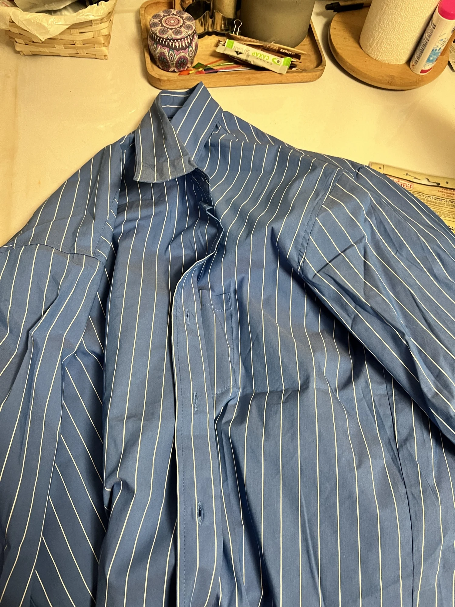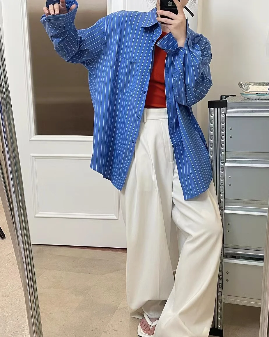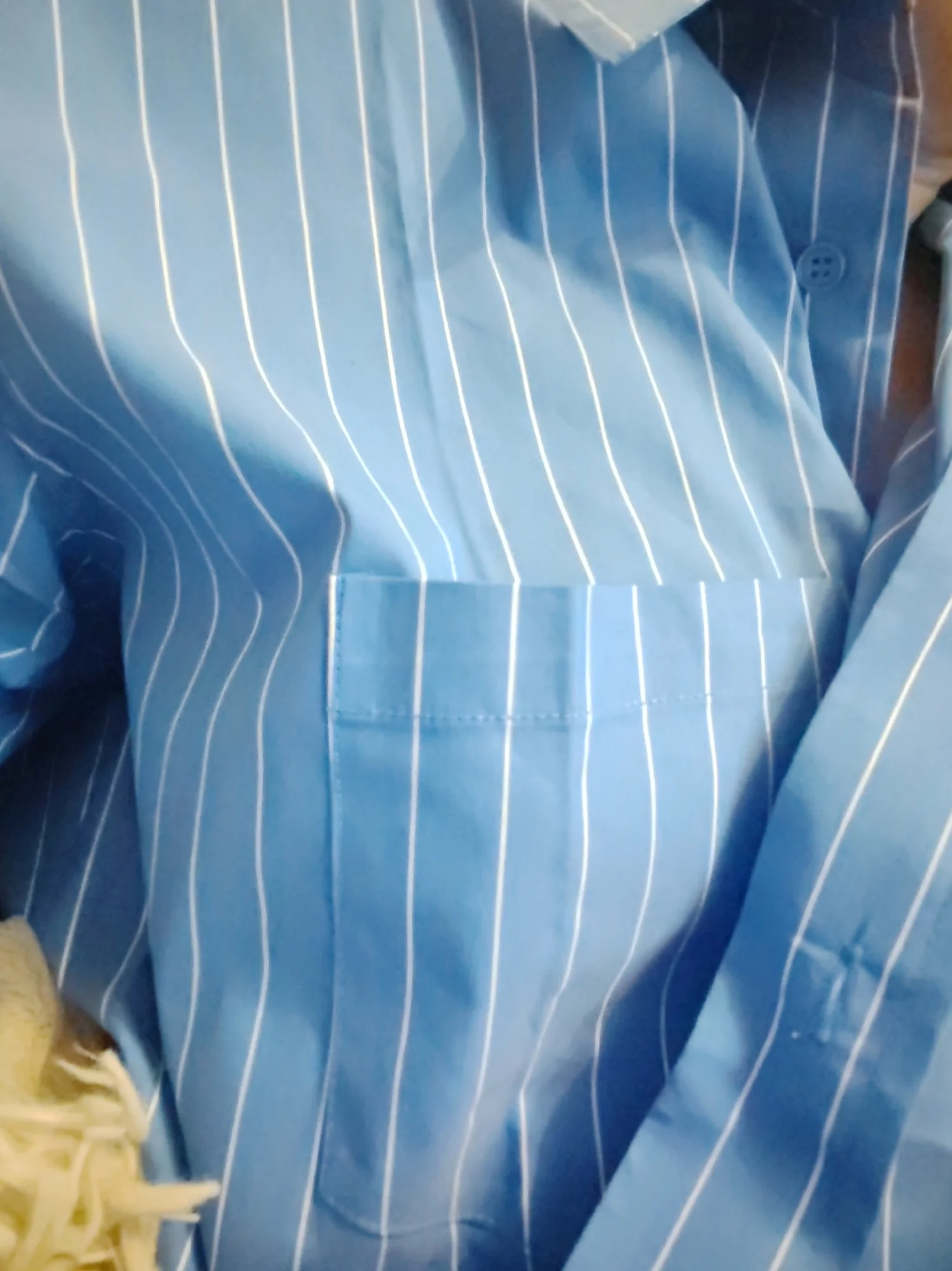 Отличная базовая рубашка. Сшито безупречно, даже полоска на кармане идеально совпадает с полоской полочки. Швы аккуратные, села оверсайз на 44, цвет яркий голубой.