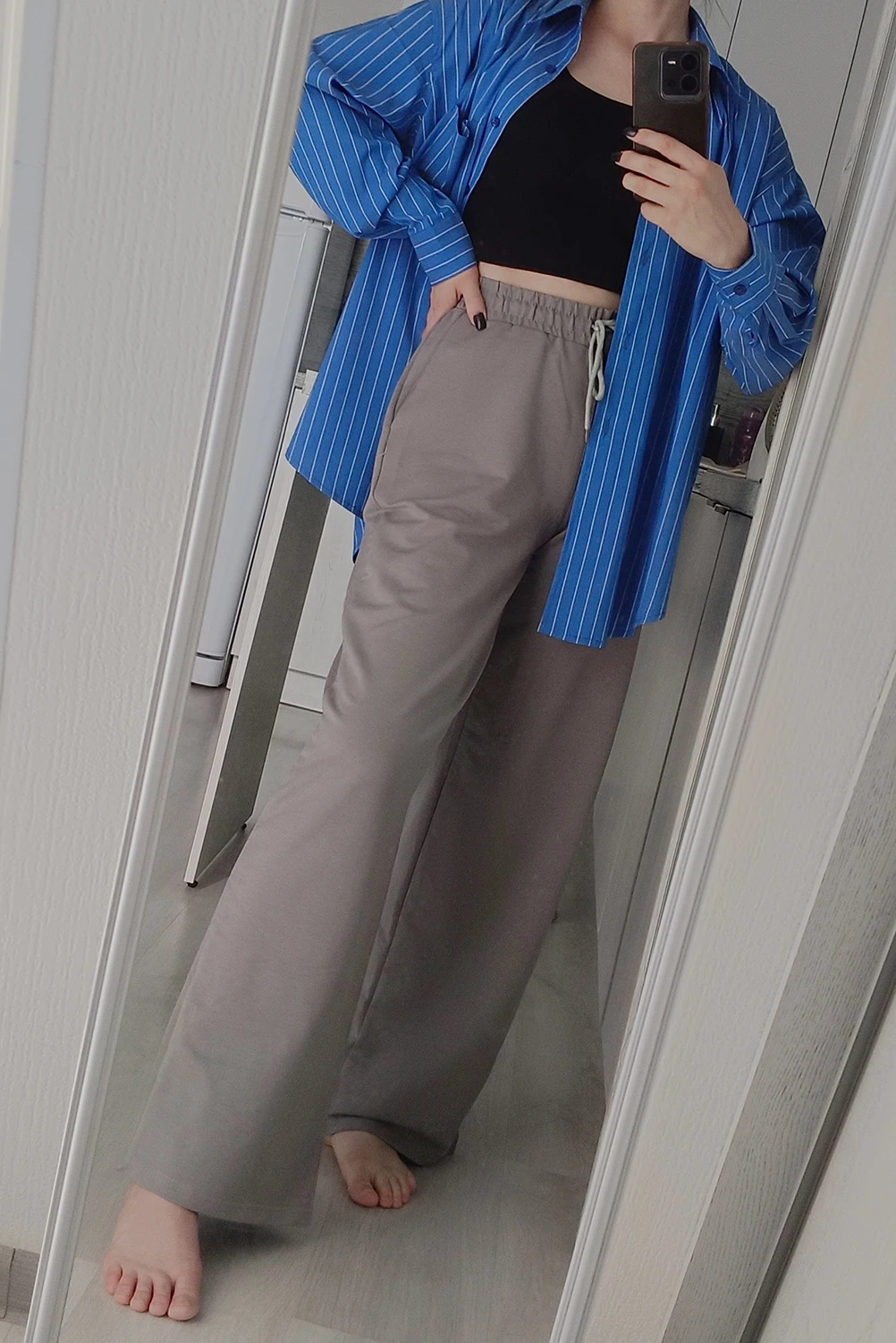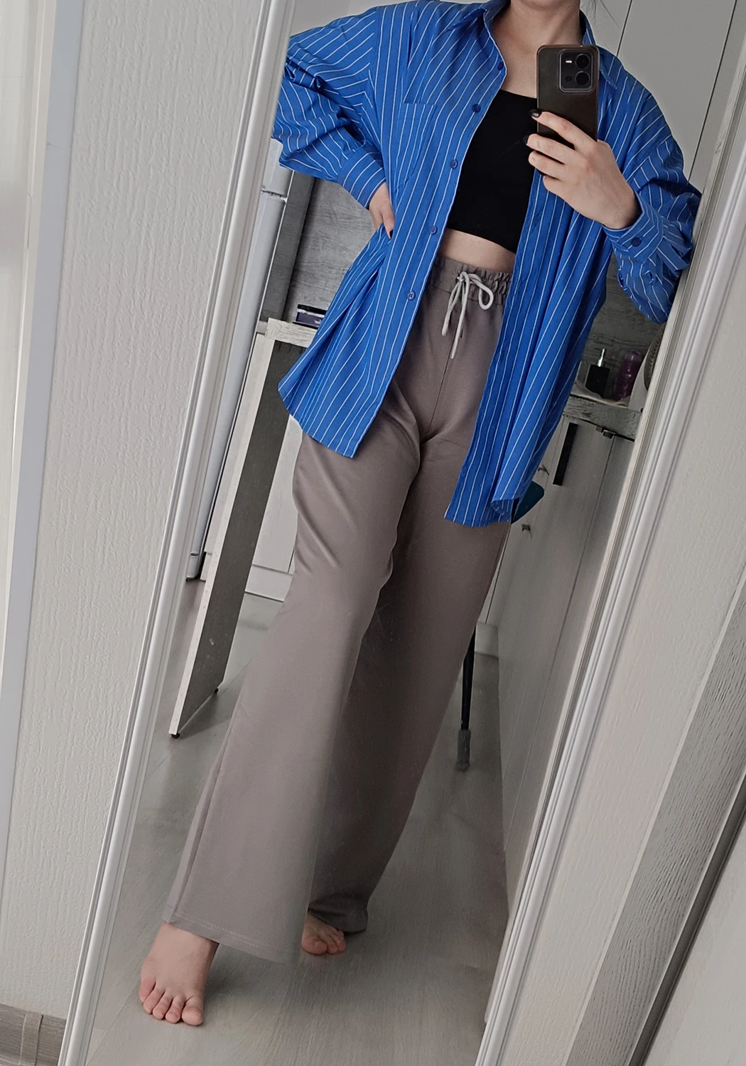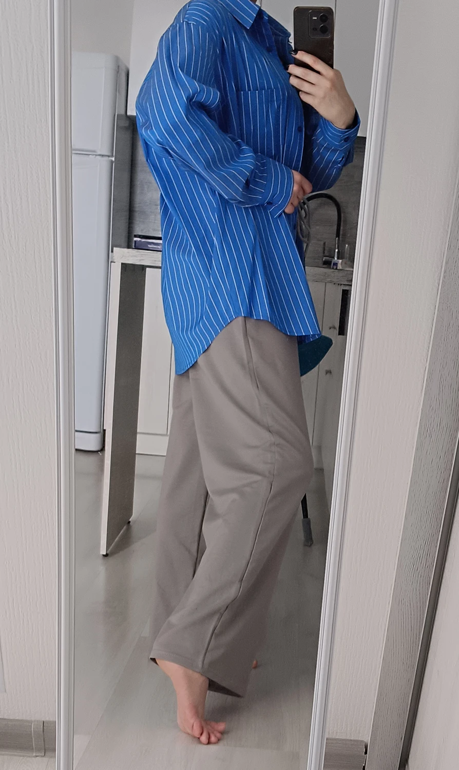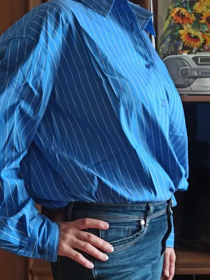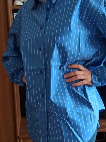 Все, что пишут про рубашку - правда, полоски совпадают, цвет отличный, но цена, по мне, завышена. На рост 158 великоват, но к серым глазам идёт. Широко вата, но поскольку единый размер, то уже как есть