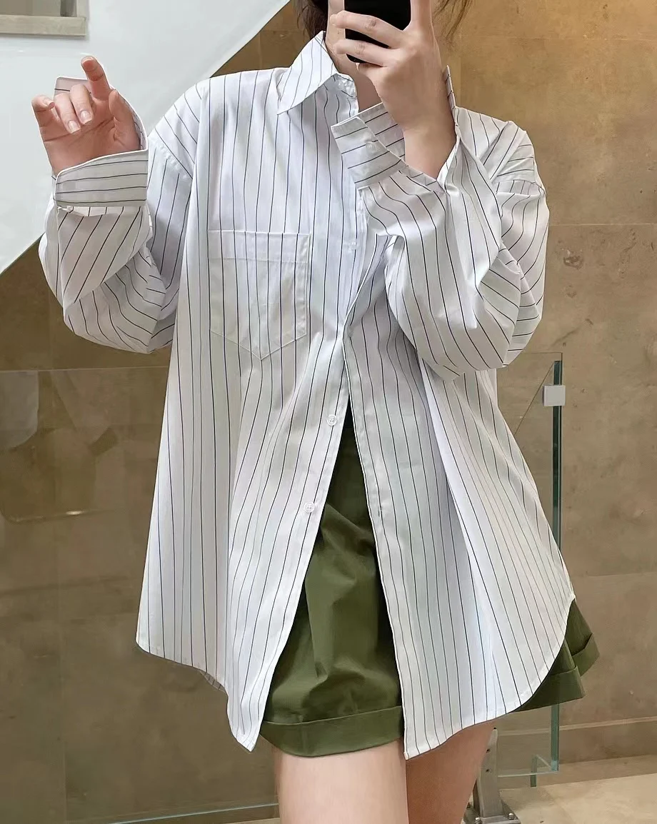 Spring/Summer Women's Striped Polo Neck Long Sleeve Pocket Decoration Loose...