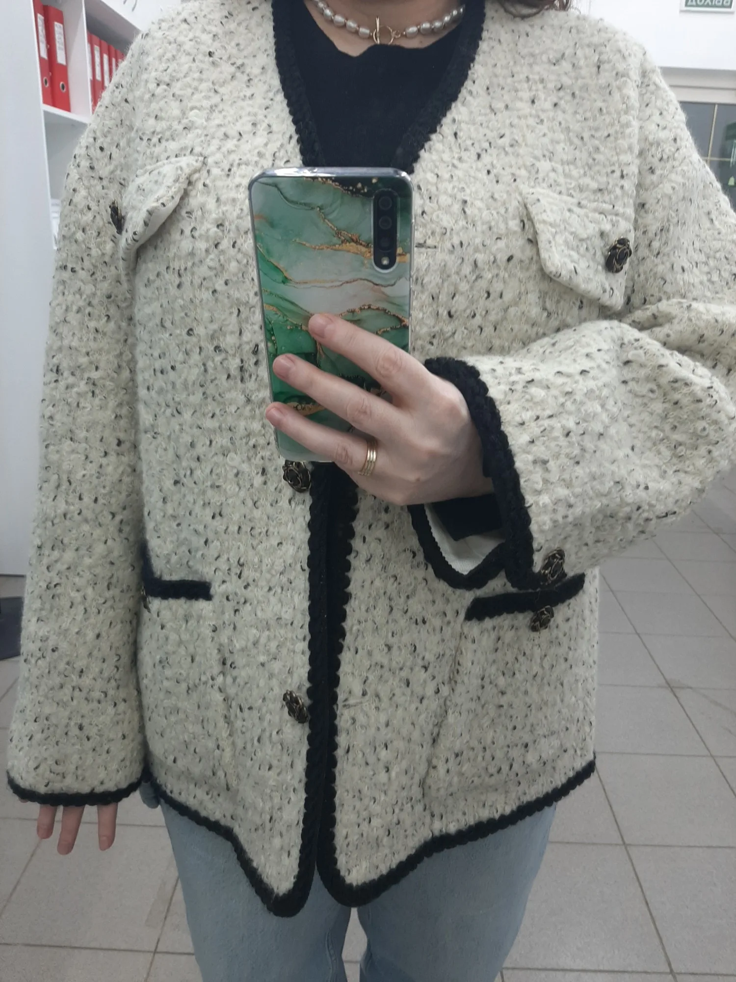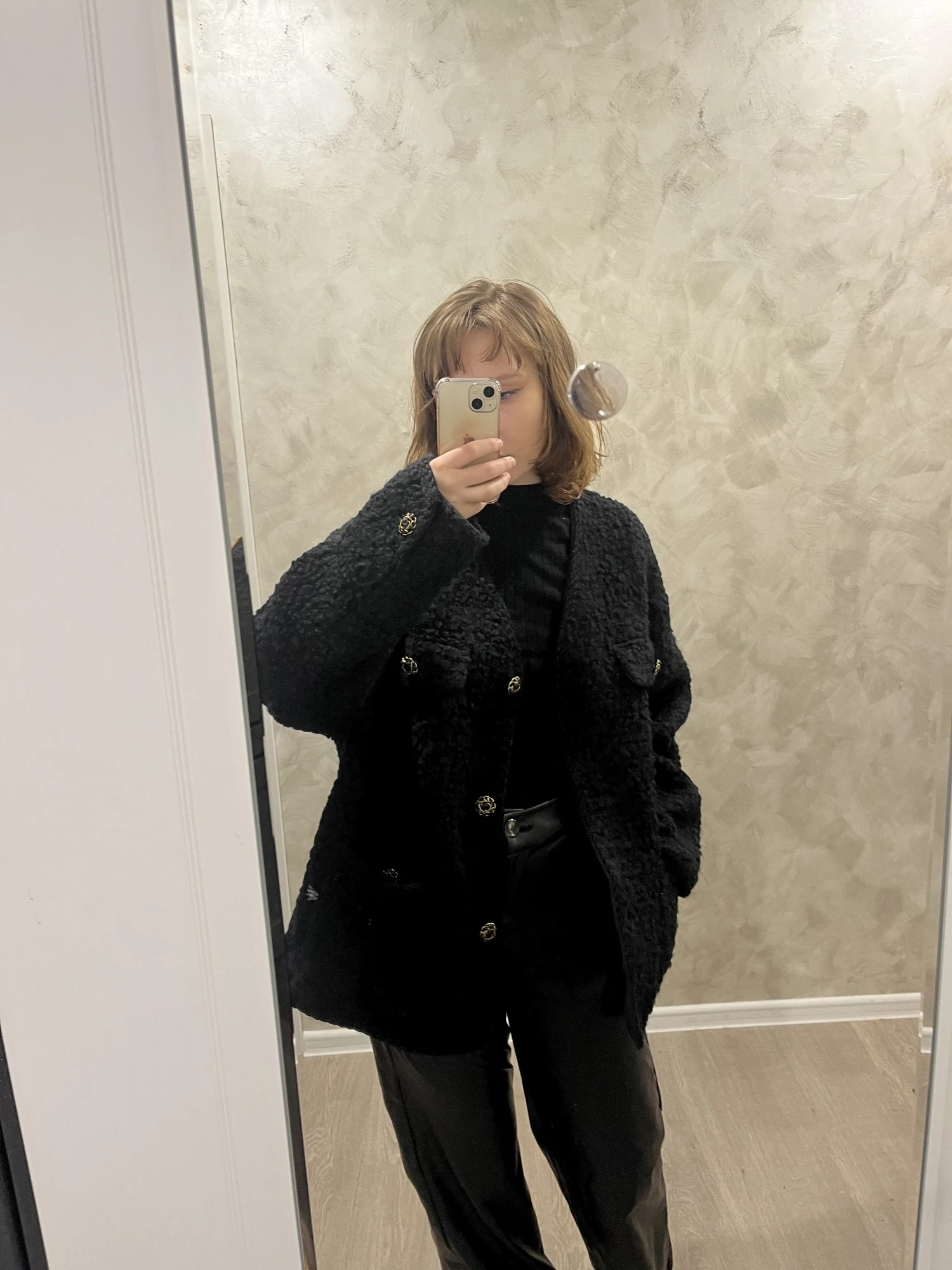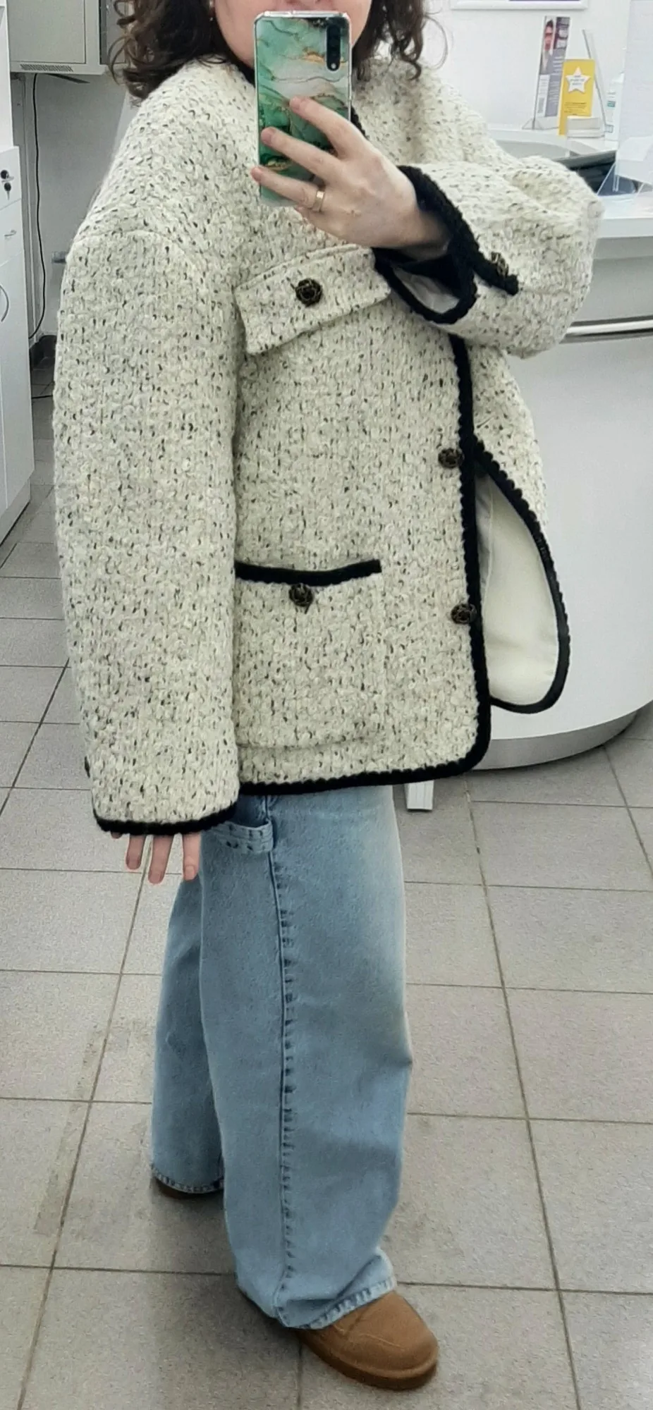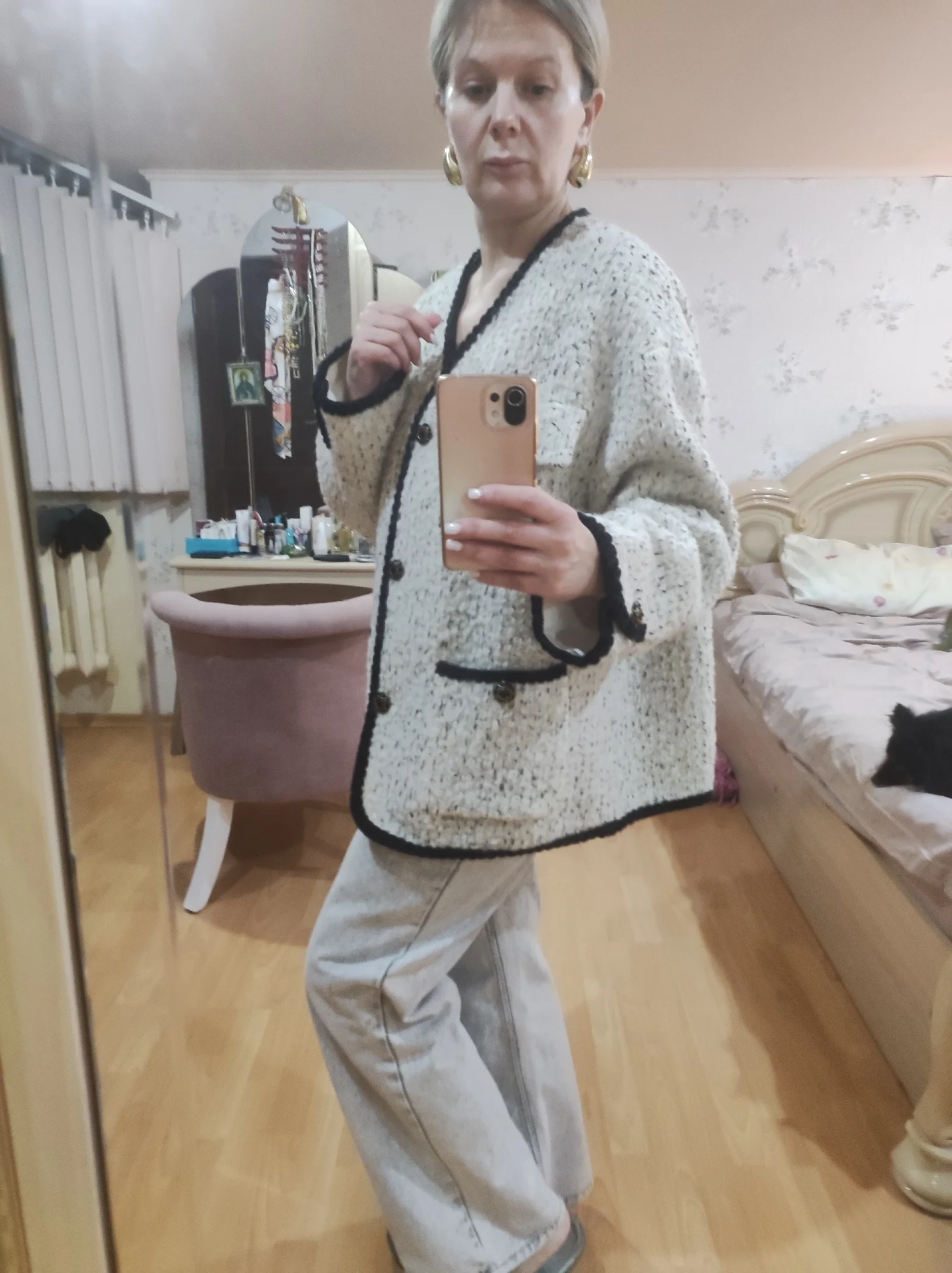 Очень классное пальто - жакет. Тёплое,тяжелое ,качественно сшито. Хорошая фурнитура и подклад. Послушала одну известную блогершу и заказала на свои 90-70-95 XL, чтобы сидел свободно. В результате получился не оверсайз, а оверсайзище. Но, в целом, всё равно неплохо.