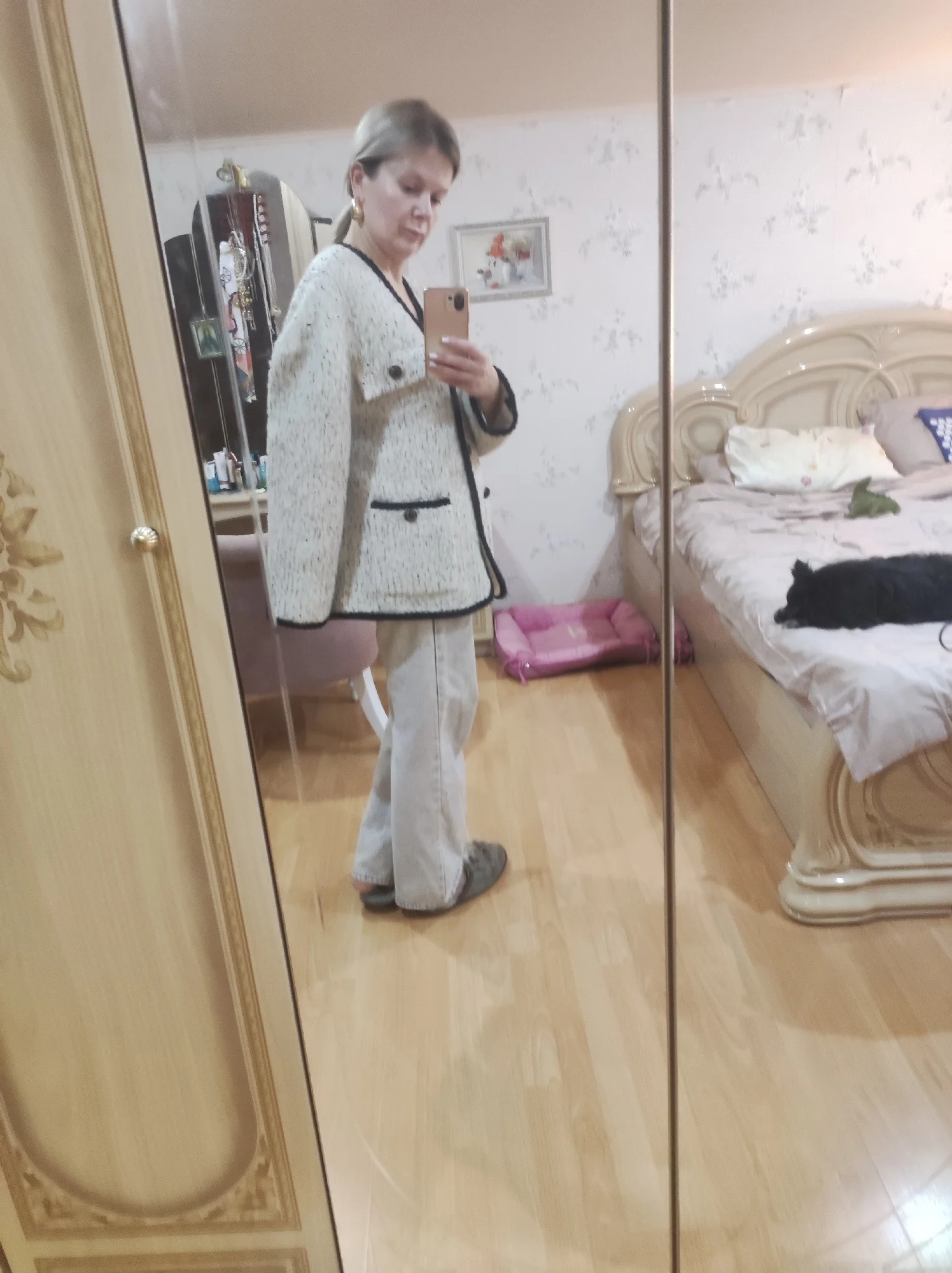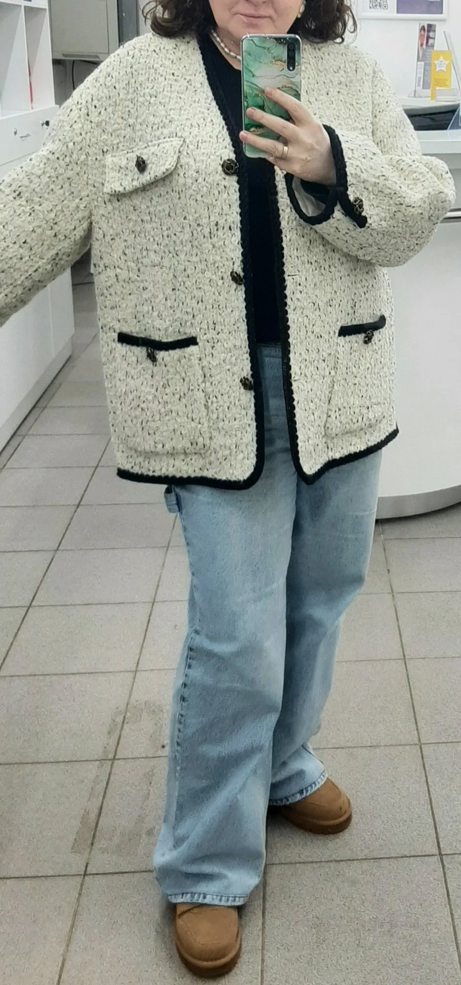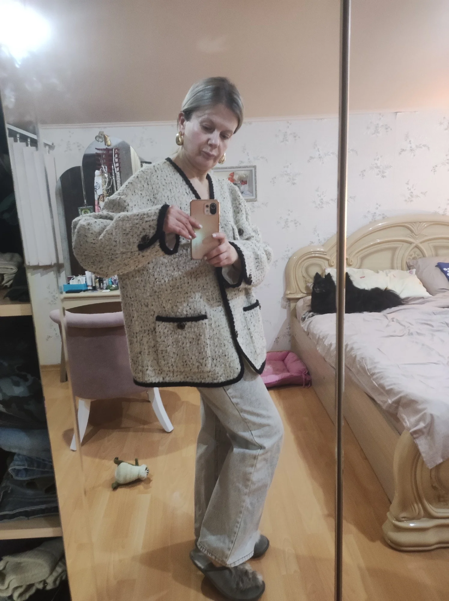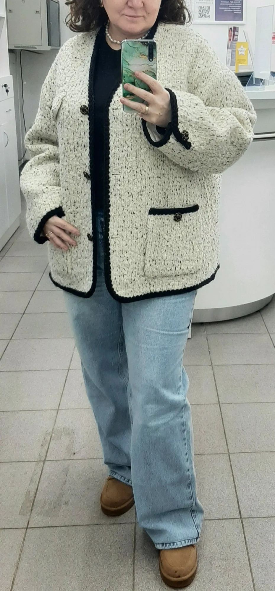 Очень классное пальто - жакет. Тёплое,тяжелое ,качественно сшито. Хорошая фурнитура и подклад. Послушала одну известную блогершу и заказала на свои 90-70-95 XL, чтобы сидел свободно. В результате получился не оверсайз, а оверсайзище. Но, в целом, всё равно неплохо.