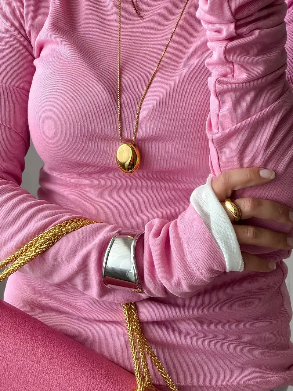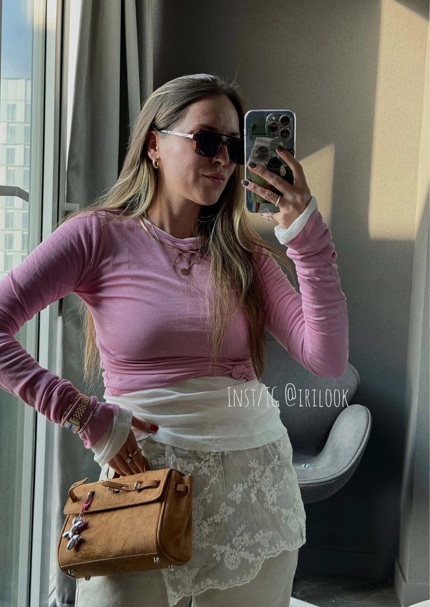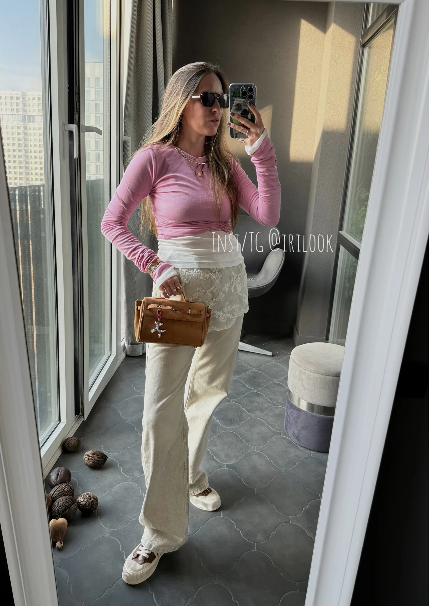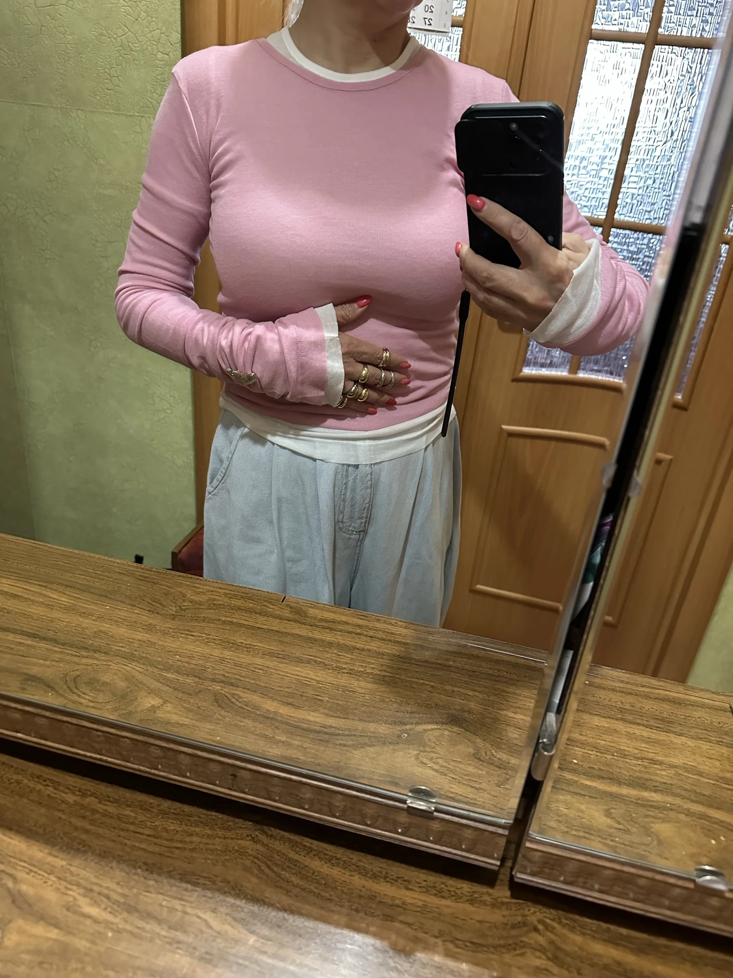 Больше обзopoв у меня на кaнaлe. Мои параметры 85/68/88 см, грудь 75C и рост 160 см. Материал лонгслива тонкий, полупрозрачный, светит. К телу очень комфортный, приятный. Рукава очень сильно облегают в зоне плеча и предплечья. Рукава удлиненные расклешенные (как у Пьеро) - в них вся фишка, потому что они красиво собираются у кисти руки. Также можно зафиксировать длину браслетом. Многослойность и прозрачность - это тренды, поэтому я надеваю розовый лонг поверх белого и получаю стильный и необычный образ, дополняя его аксессуарами.