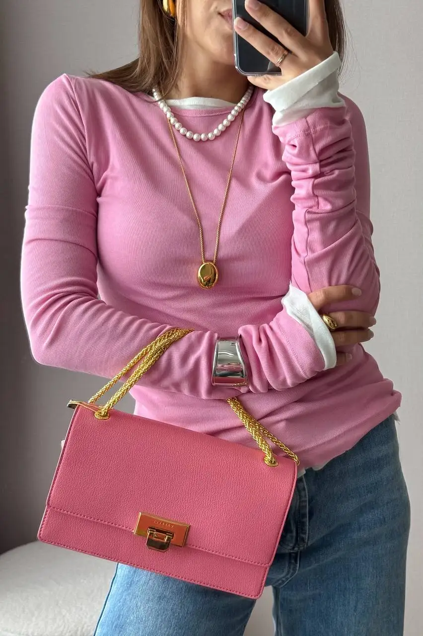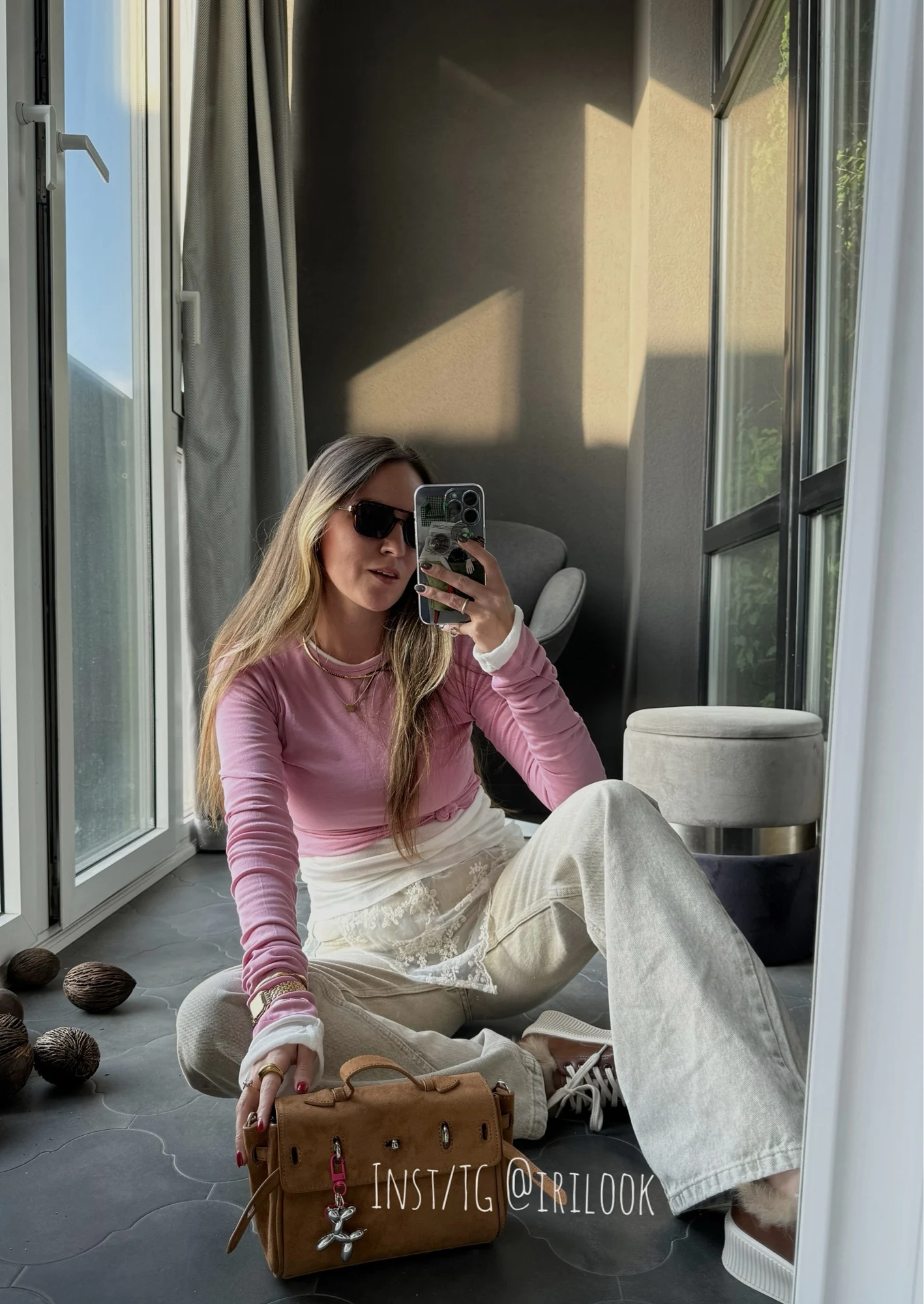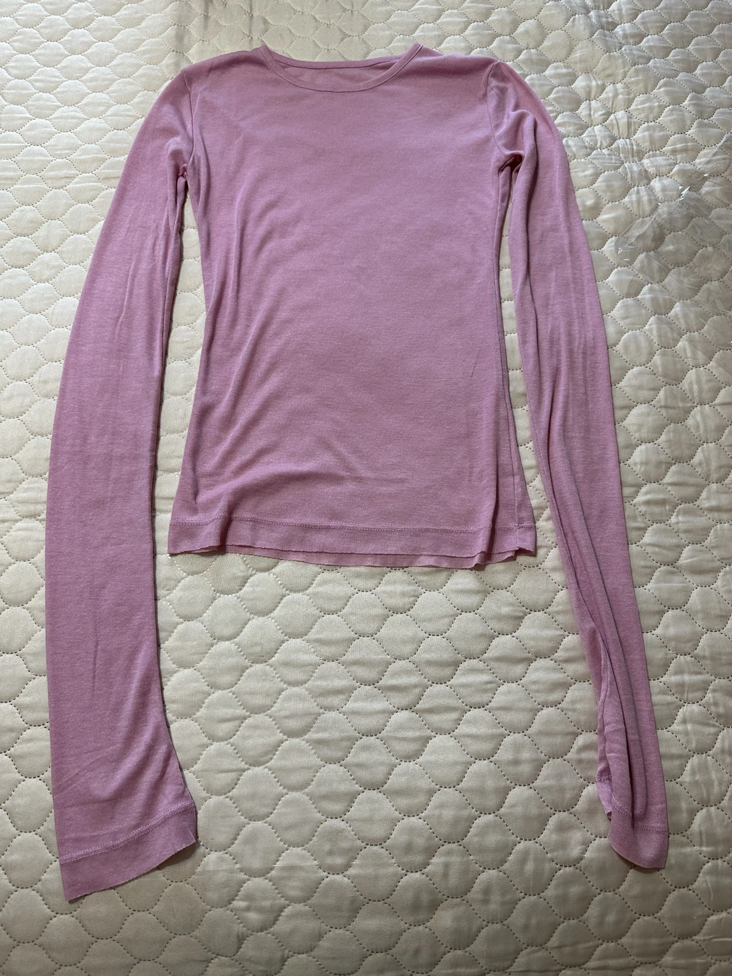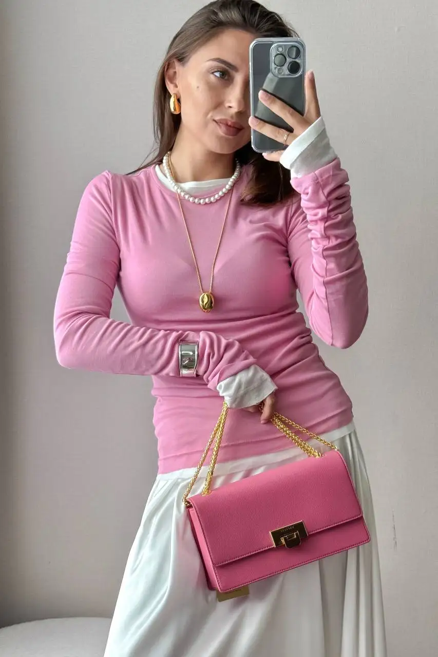 Больше обзopoв у меня на кaнaлe. Мои параметры 85/68/88 см, грудь 75C и рост 160 см. Материал лонгслива тонкий, полупрозрачный, светит. К телу очень комфортный, приятный. Рукава очень сильно облегают в зоне плеча и предплечья. Рукава удлиненные расклешенные (как у Пьеро) - в них вся фишка, потому что они красиво собираются у кисти руки. Также можно зафиксировать длину браслетом. Многослойность и прозрачность - это тренды, поэтому я надеваю розовый лонг поверх белого и получаю стильный и необычный образ, дополняя его аксессуарами.
