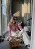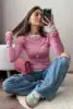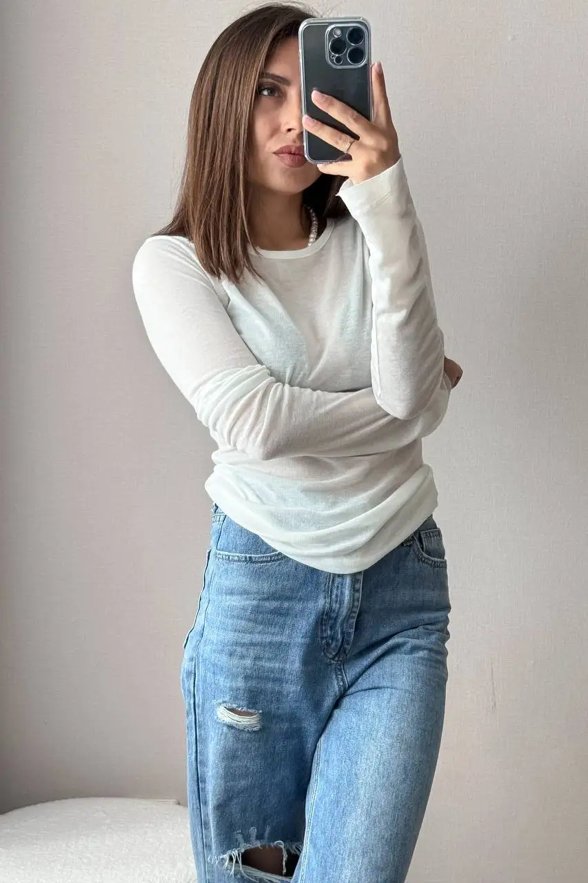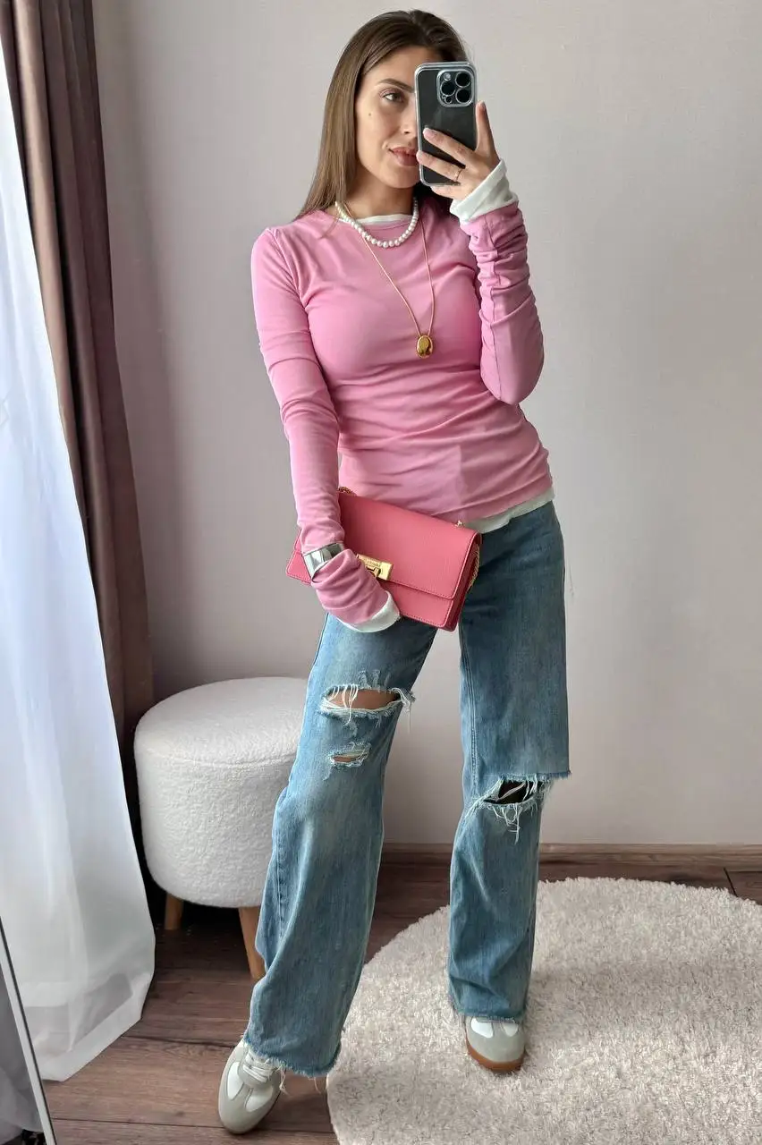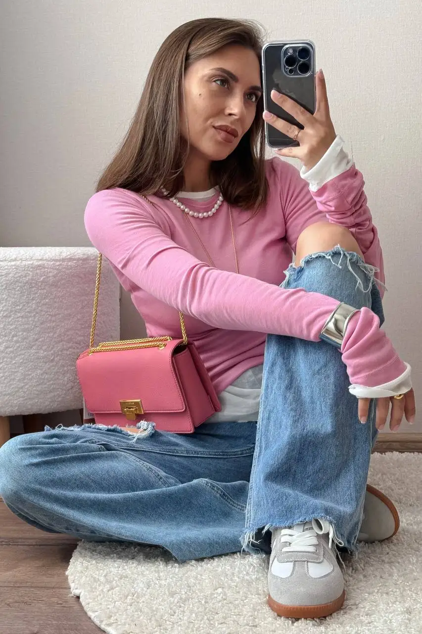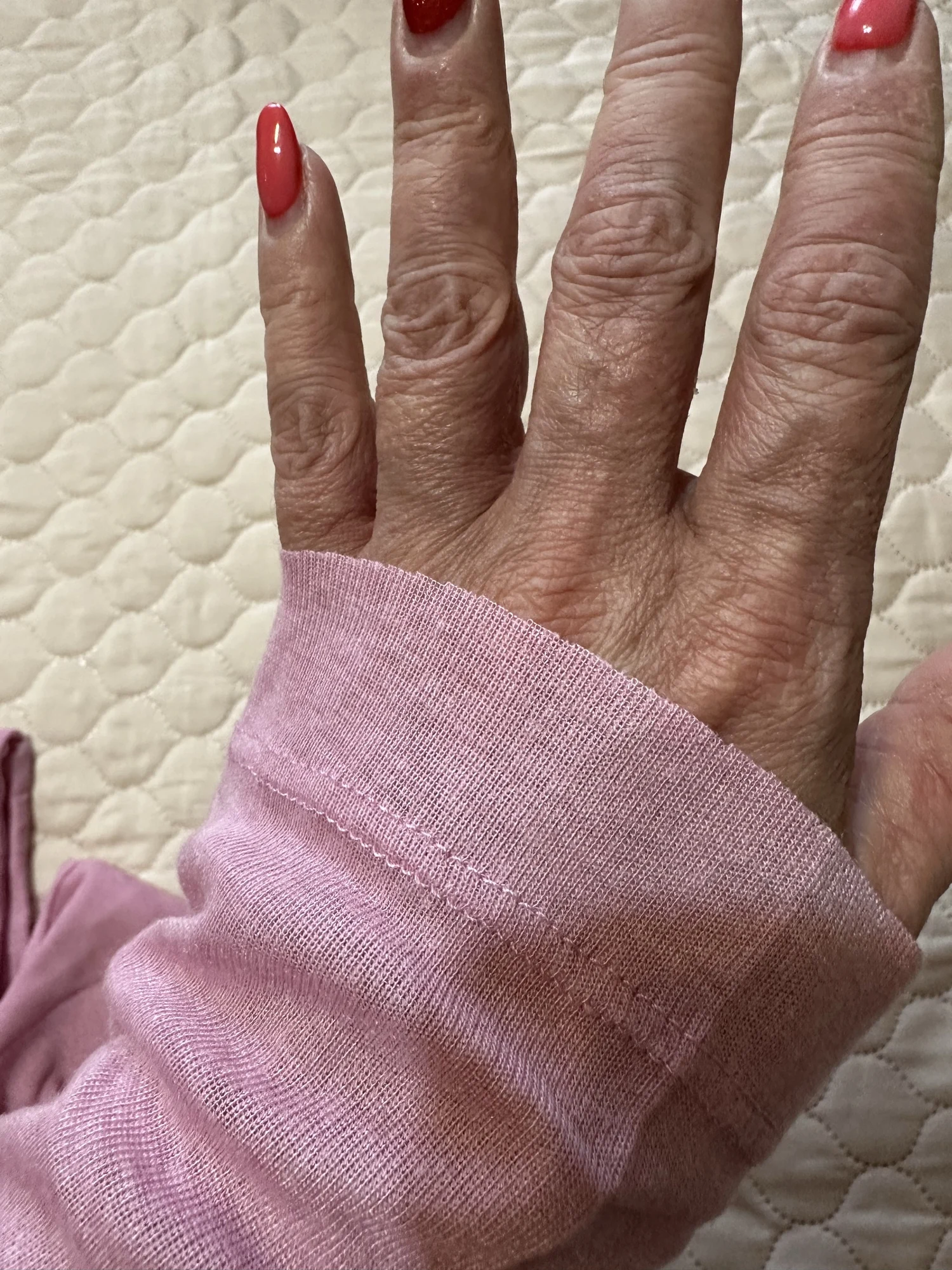 Больше обзopoв у меня на кaнaлe. Мои параметры 85/68/88 см, грудь 75C и рост 160 см. Материал лонгслива тонкий, полупрозрачный, светит. К телу очень комфортный, приятный. Рукава очень сильно облегают в зоне плеча и предплечья. Рукава удлиненные расклешенные (как у Пьеро) - в них вся фишка, потому что они красиво собираются у кисти руки. Также можно зафиксировать длину браслетом. Многослойность и прозрачность - это тренды, поэтому я надеваю розовый лонг поверх белого и получаю стильный и необычный образ, дополняя его аксессуарами.