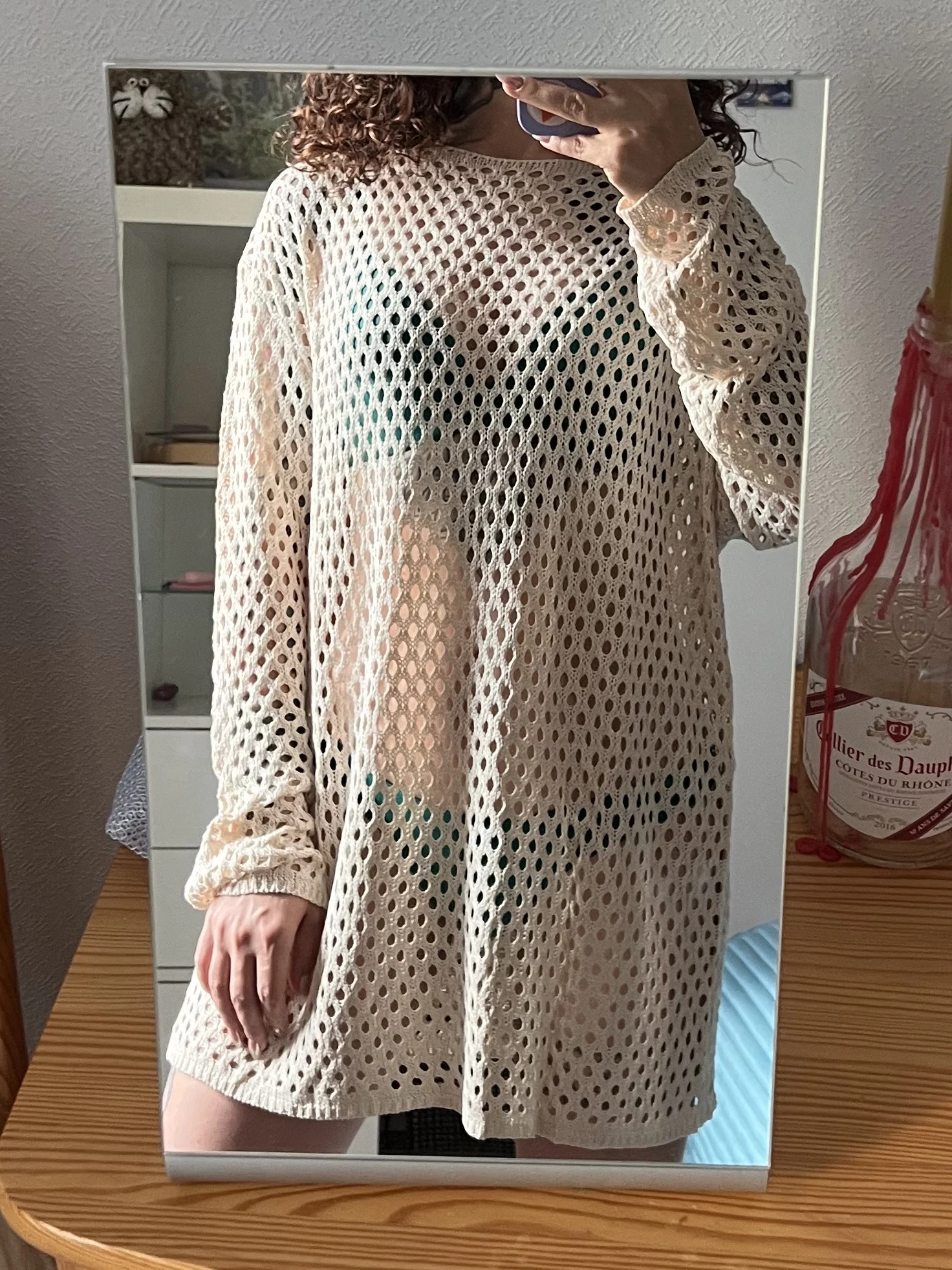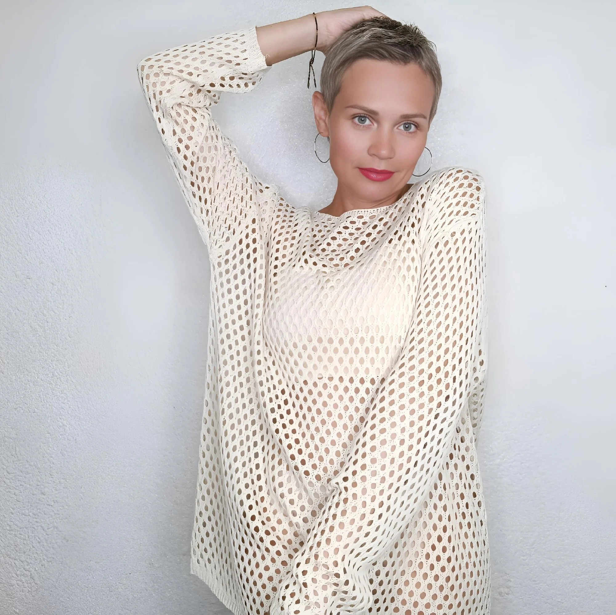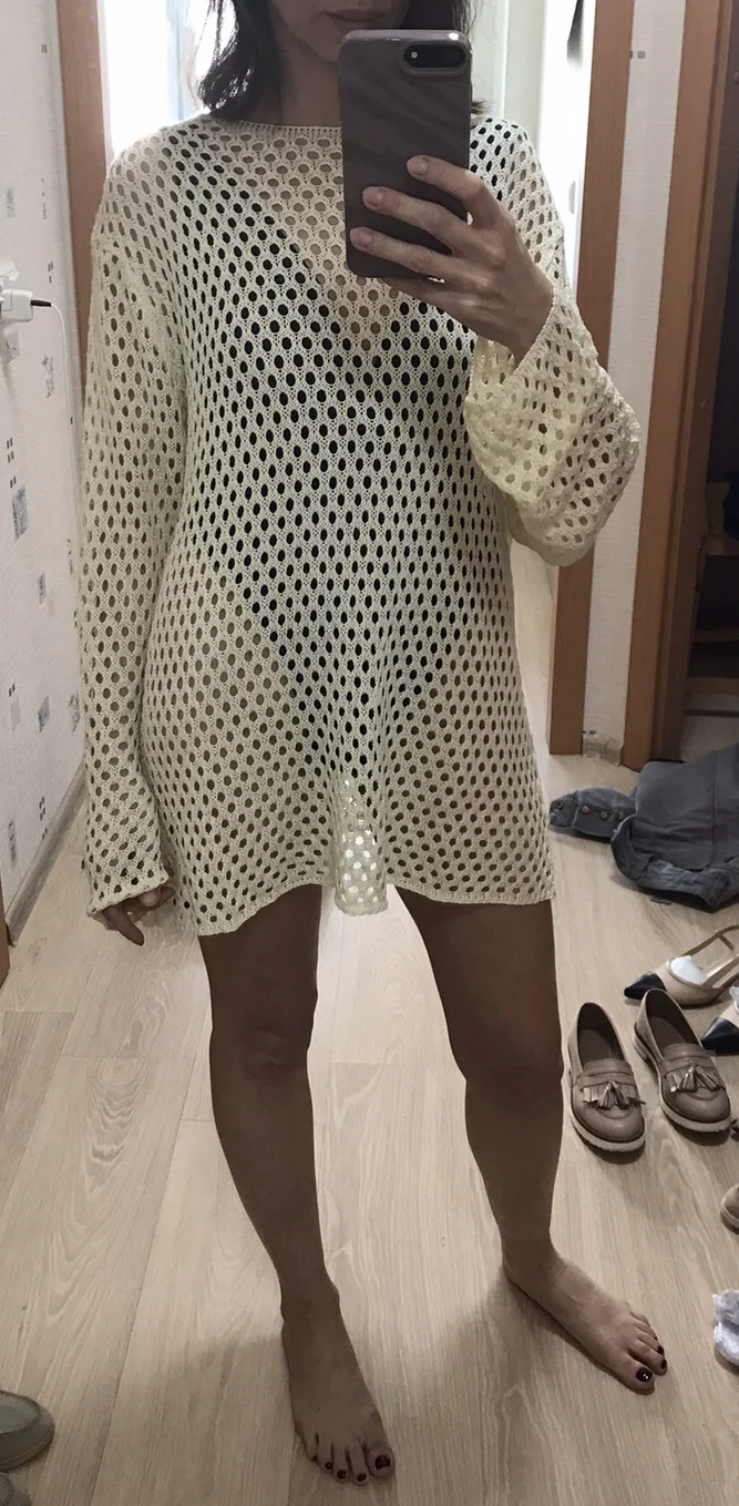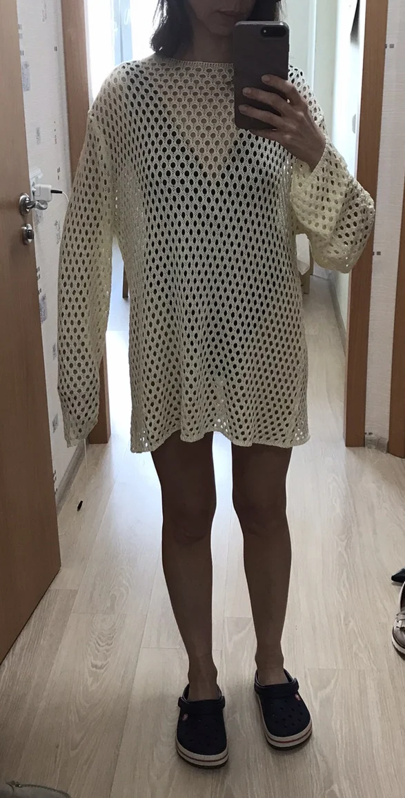 Туника с длинным рукавом, которая добавить изюминку образу от Тоssy.Данную модель можно использовать и как тунику под купальник.Крой свободный, хороший стрейч эффект.Простой дизайн.Вязка ко ширине дырочек очень правильная, подойдёт на любой возраст. Отлично будет сочетаться как в повседневных образах, иак и пляжных. В пляжных можно использовать и как мини платье, например с поясом.Смотрится стильно.2 цвета. Размер L, на: рост 165см, ОГ 90 см, ОТ 70см, ОБ 90 см. Села идеально.Зацепок нет.Рекомендую