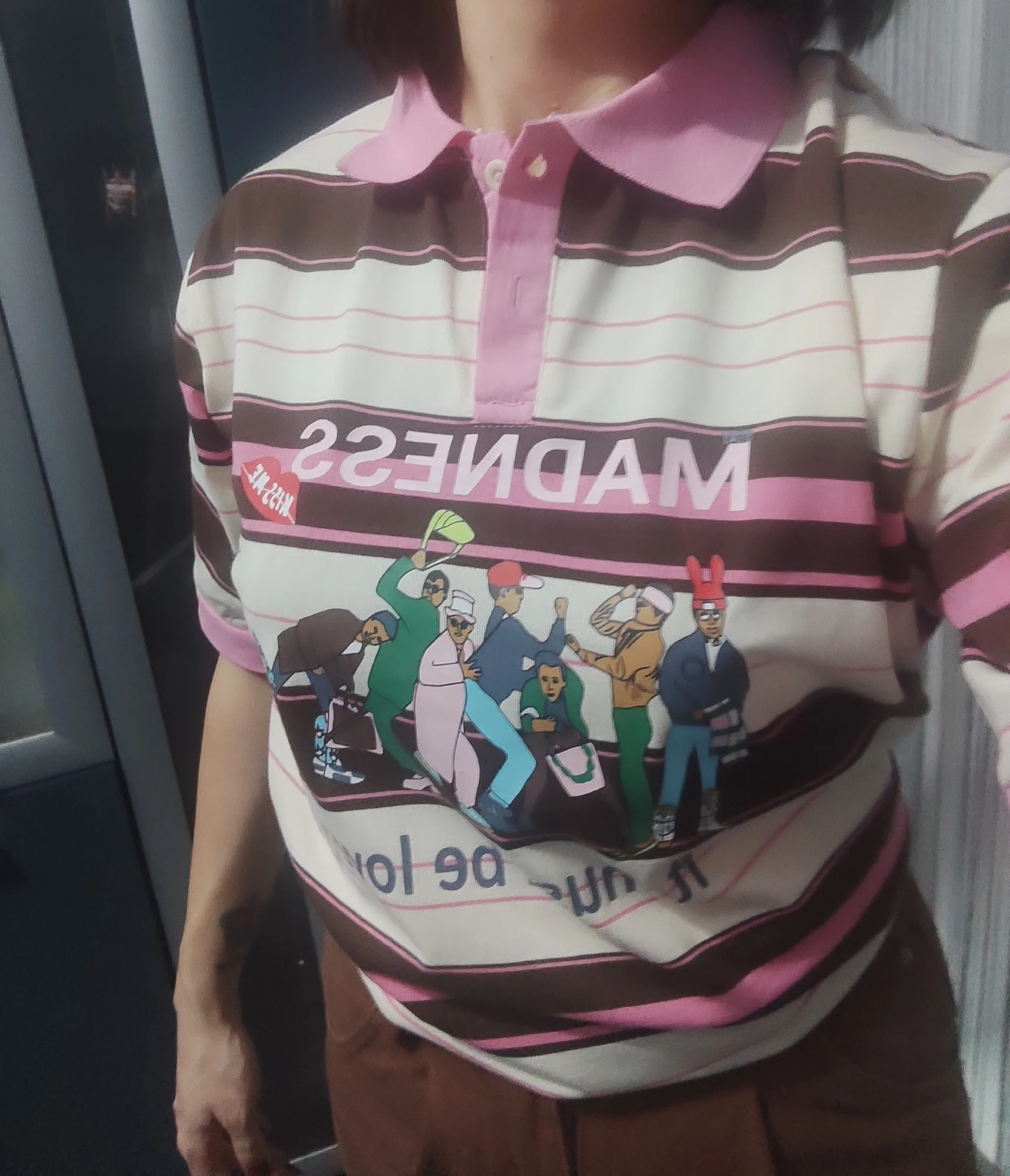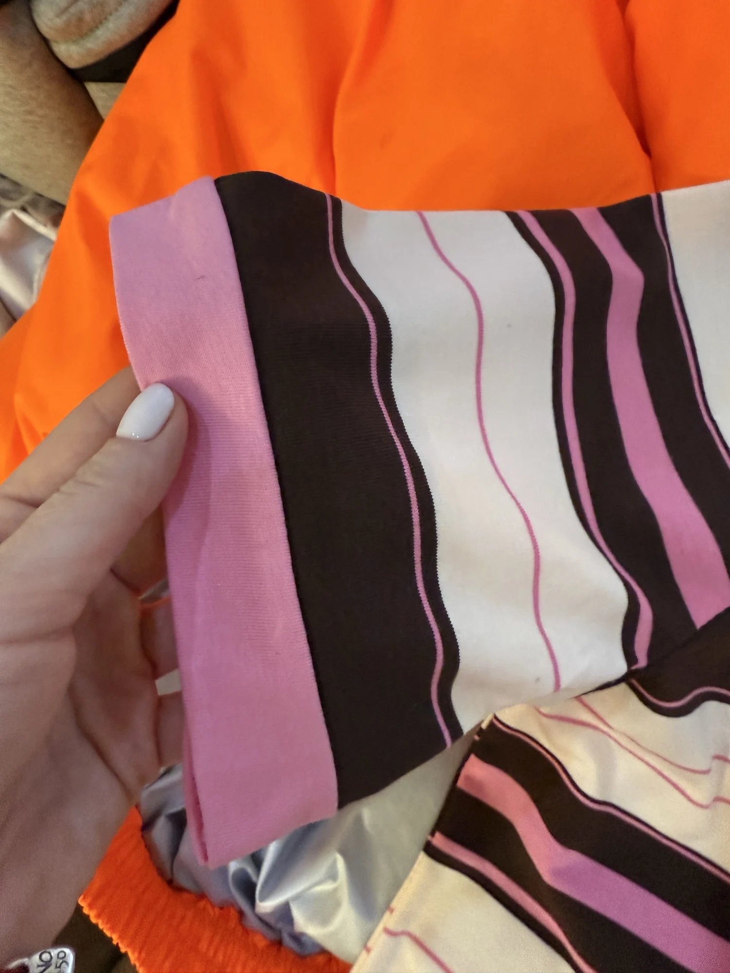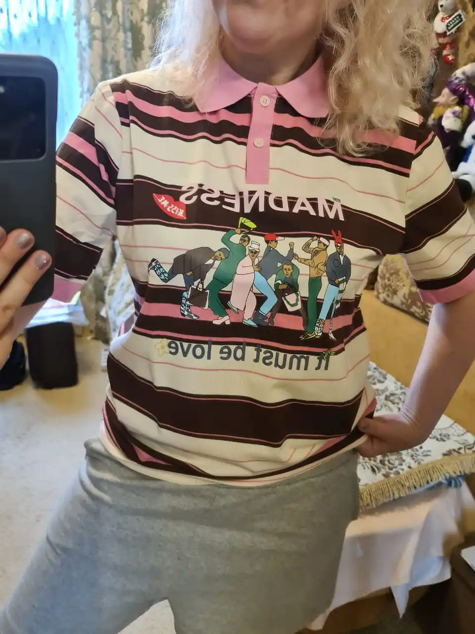 Прямо хочется поставить три ⭐ за примитивный крой. Сшито как будто на коленке. Не совпадают полосы на спине и передней полочке от слова совсем. К пройме пришит широченный рукав, как будто взят с 56-58 го размера.Изнутри висят нитки от краевой обработки. При этом идеальная упаковка в зип пакет, прокладка из картона. Есть вшитые бирки с указанием 100% соtton. В целом, смотрится весело, наклейка сделана аккуратно, надеюсь выдержит летний сезон.Розовый цвет на поло довольно яркий. Размерная сетка верная. Продавцу спасибо за быструю отправку.Alla Y. 8 мая 2025