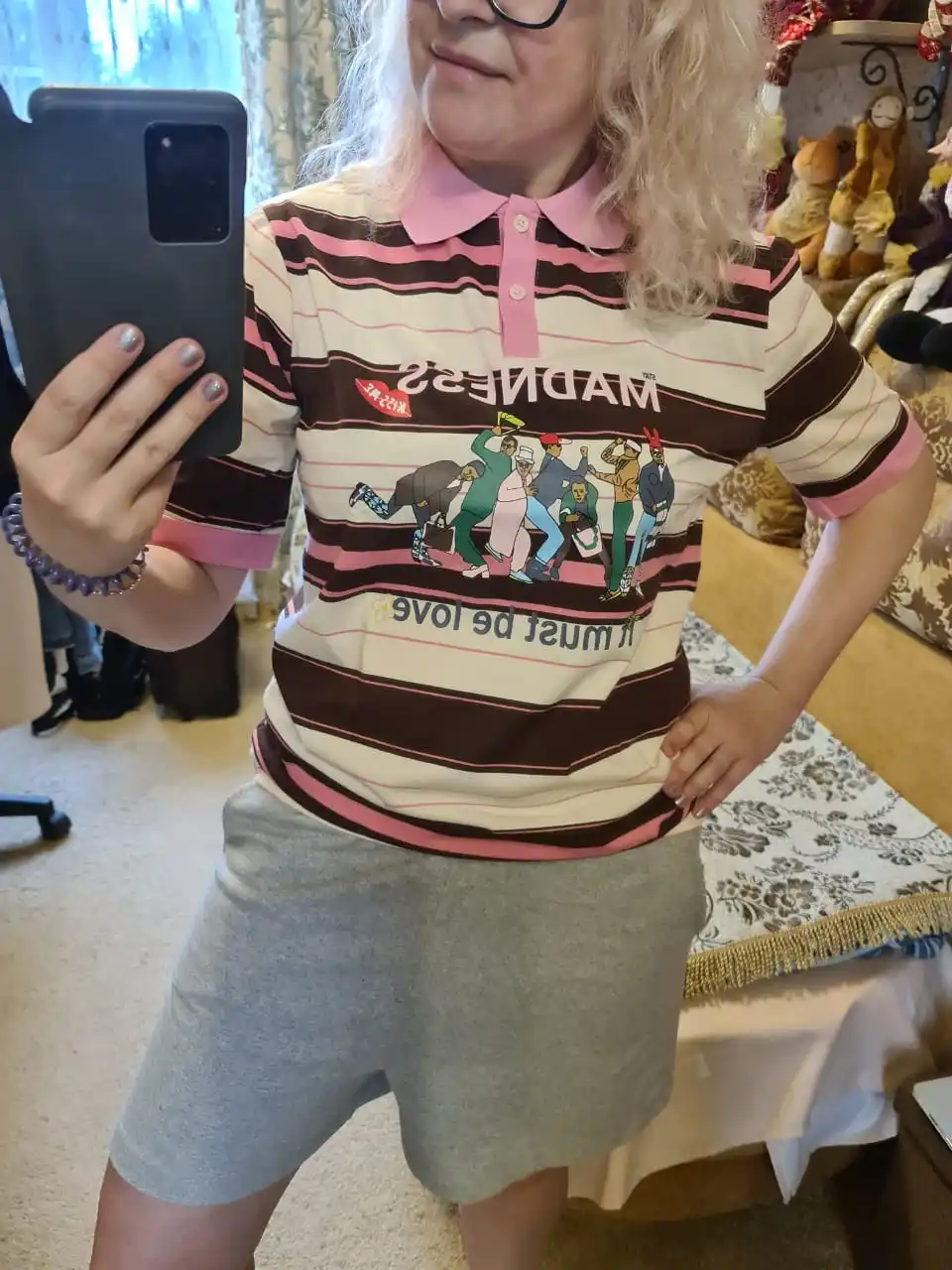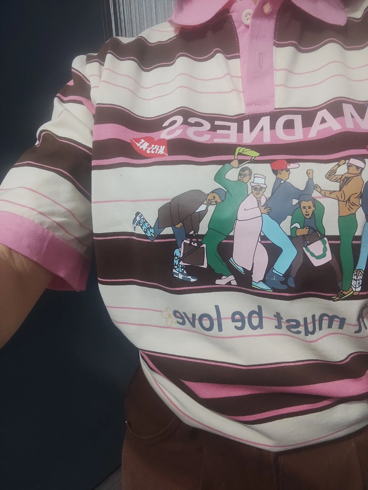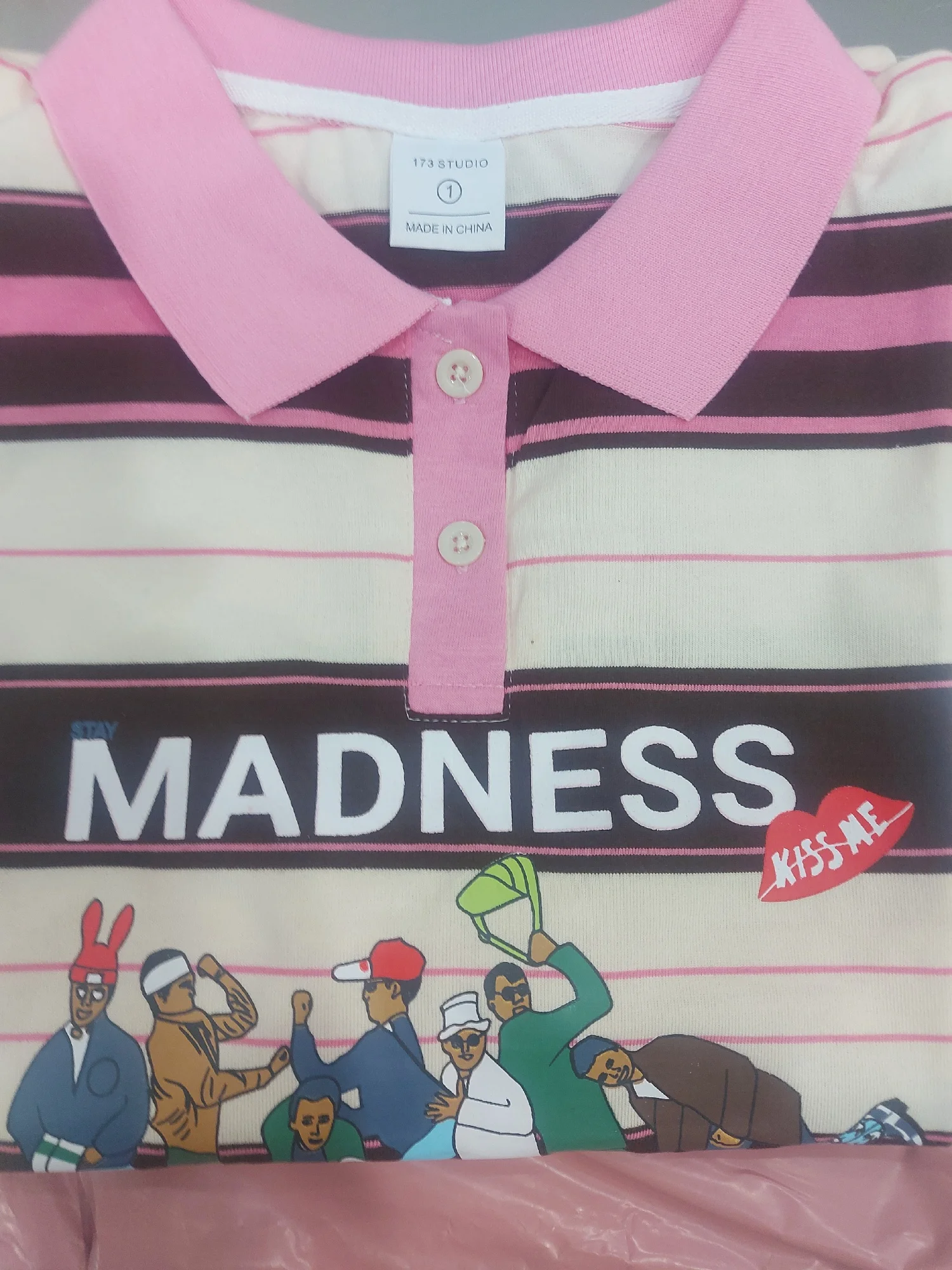 Прямо хочется поставить три ⭐ за примитивный крой. Сшито как будто на коленке. Не совпадают полосы на спине и передней полочке от слова совсем. К пройме пришит широченный рукав, как будто взят с 56-58 го размера.Изнутри висят нитки от краевой обработки. При этом идеальная упаковка в зип пакет, прокладка из картона. Есть вшитые бирки с указанием 100% соtton. В целом, смотрится весело, наклейка сделана аккуратно, надеюсь выдержит летний сезон.Розовый цвет на поло довольно яркий. Размерная сетка верная. Продавцу спасибо за быструю отправку.Alla Y. 8 мая 2025