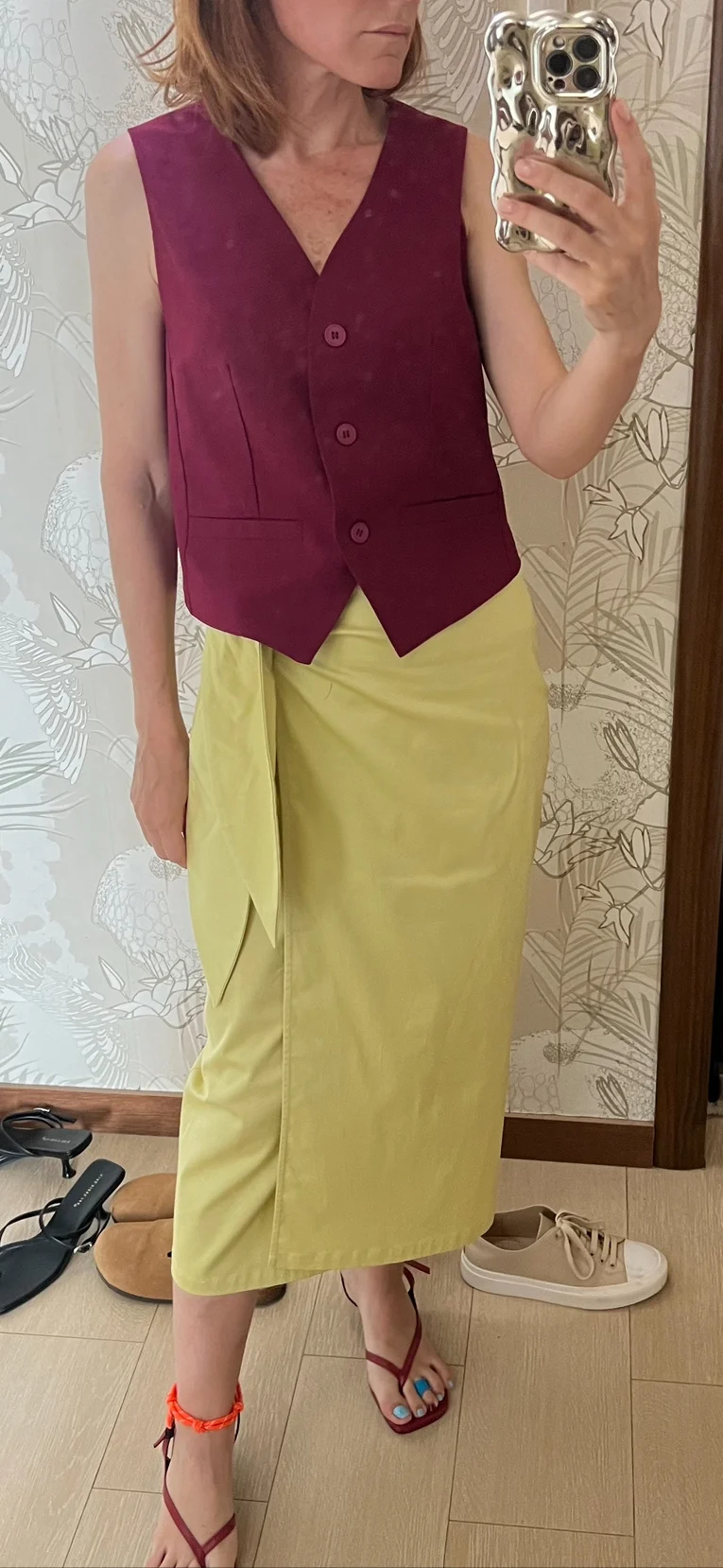 хороший жилет на подкладке (подклад нормальный, не стеклянный, за счёт того, что жилет не в обтяг, думаю жарко не будет), на 0Г-94, ОТ-78 размер М подошёл. Состав на этикетке 30% лен 70% хлопок. Цвет красивый.Sveta D. 22 июля 2024