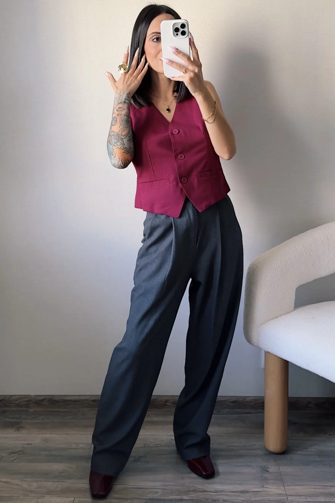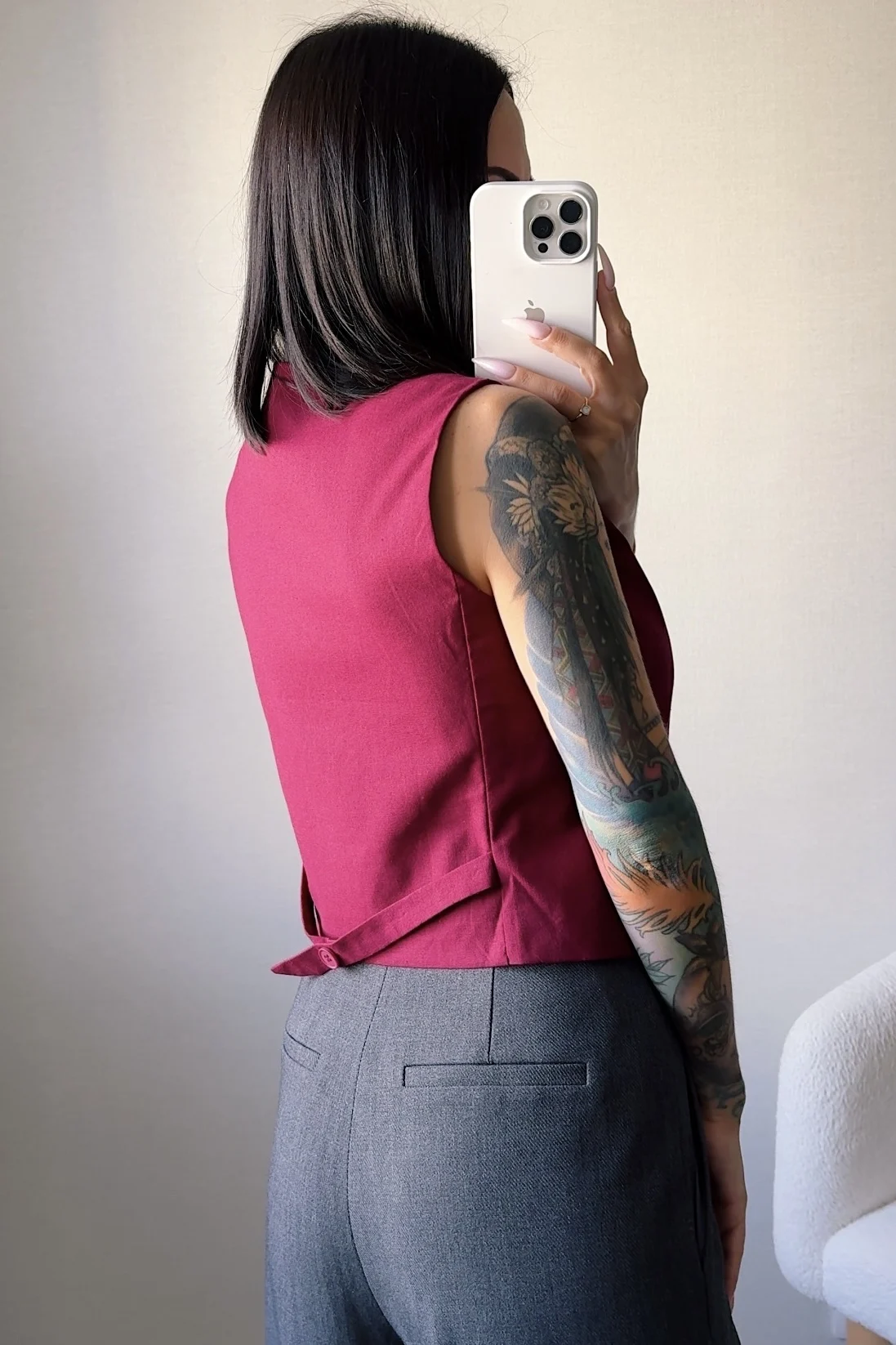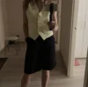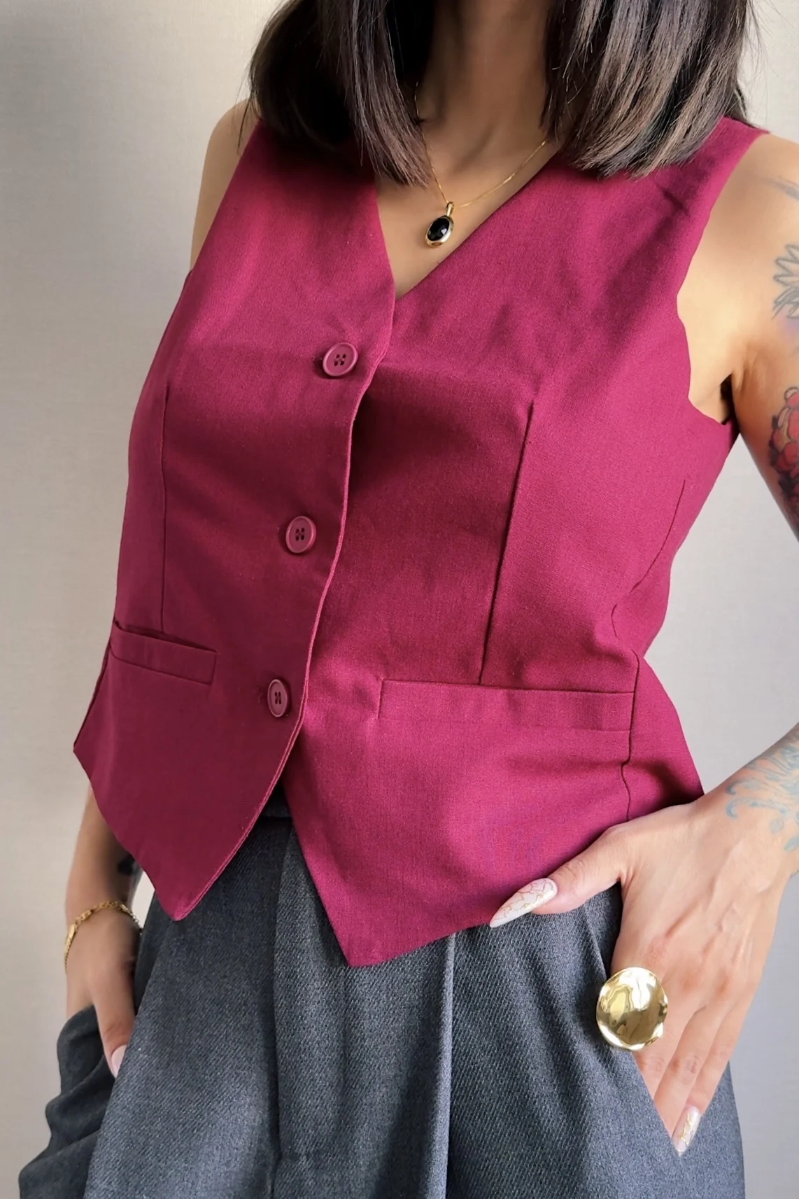 жилет хорошего качества, аккуратно сшит, в составе точно есть лен) он в размере S даже немного овер, а еще он короткий, на мне бруюки от этого же продавца с завышенной талией, с ними жилет классно смотрится, а если брюки на бедра сделать, то между жилетом и брюками будет много пространства.Продавец отправил быстро, в челябинск пришло за 12 дней- супер скорость. Единственное, что сзади хлястик висит не красиво, от него никакой ни пользы ни вида, перешить бы пуговицу.