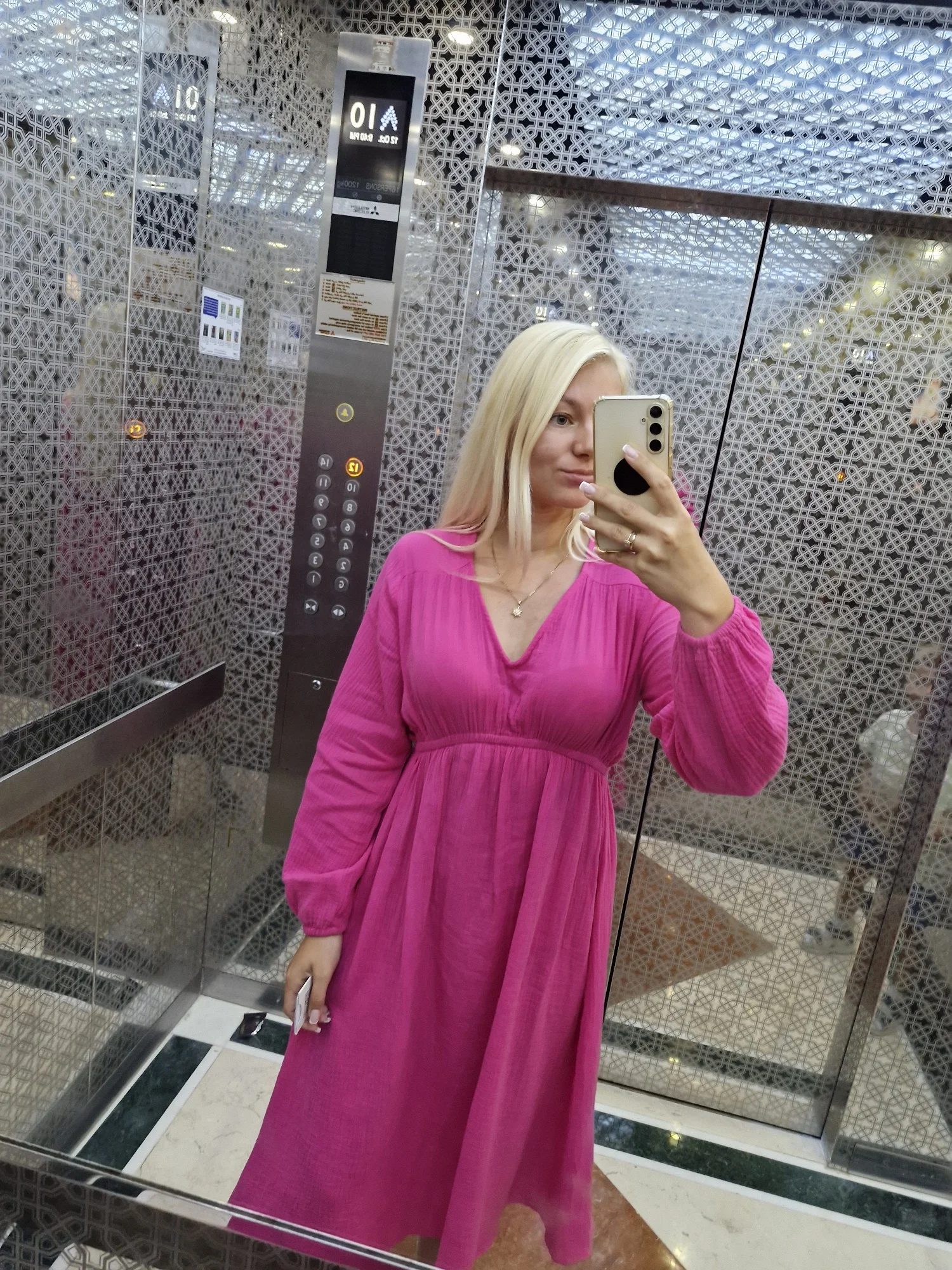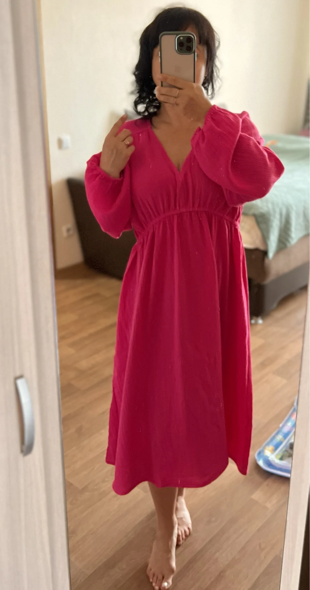 Очень красивое платье. Сшито хорошо, нитки не торчат. Выглядит как на фото. Ткань плотный муслин, что приятно удивило. Цвет фуксия красивый. На мой рост 165 см закрывает колено. Рукав до запястья. В талии свободно. Село отлично. Сразу постирала и после стирки оно не деформировалось. Не линяет. На лето отличный вариант, возможно возьму ещё в белом цвете. Мои параметры 85-78-1041237 u. 27 апреля 2025