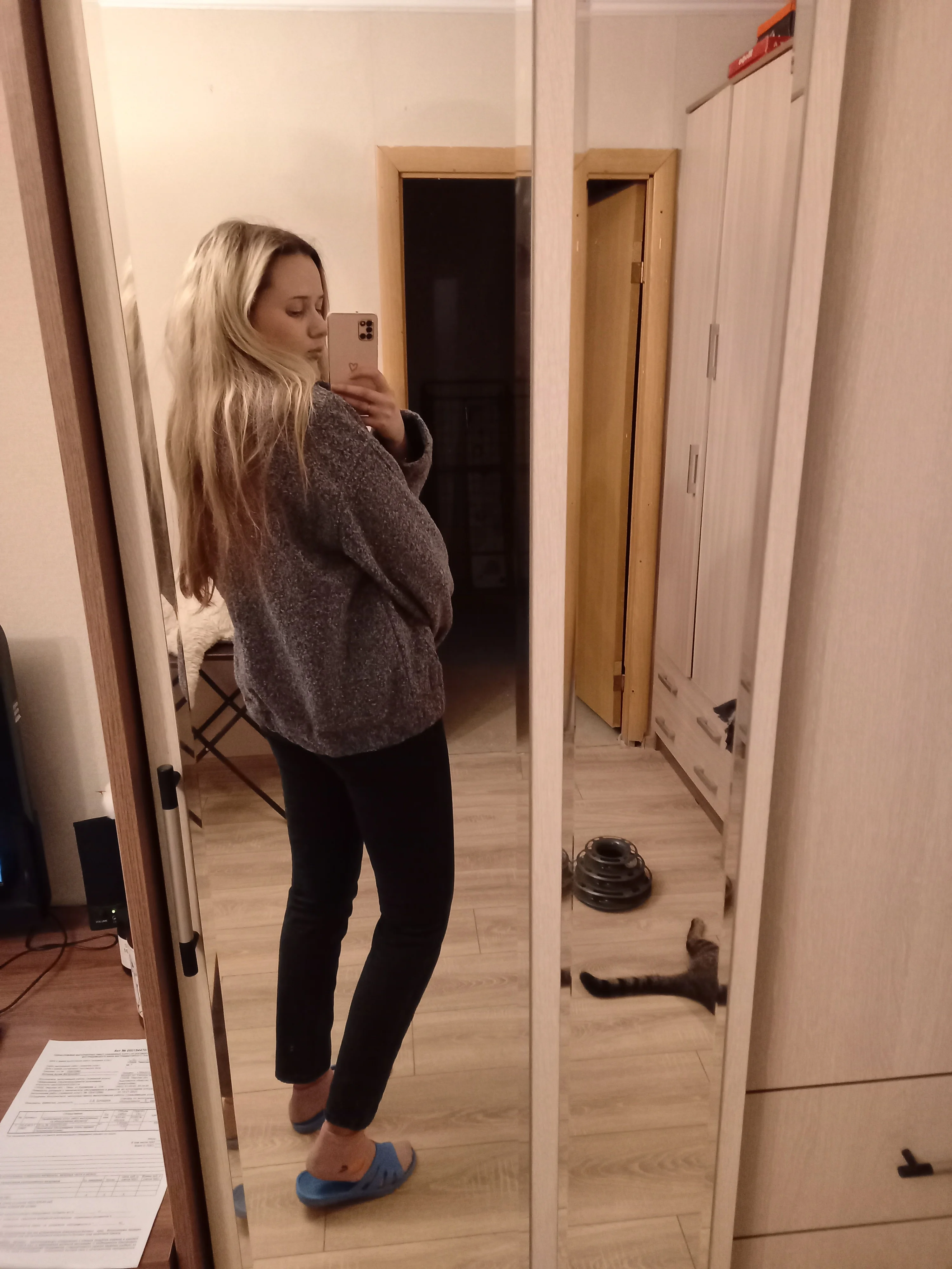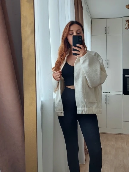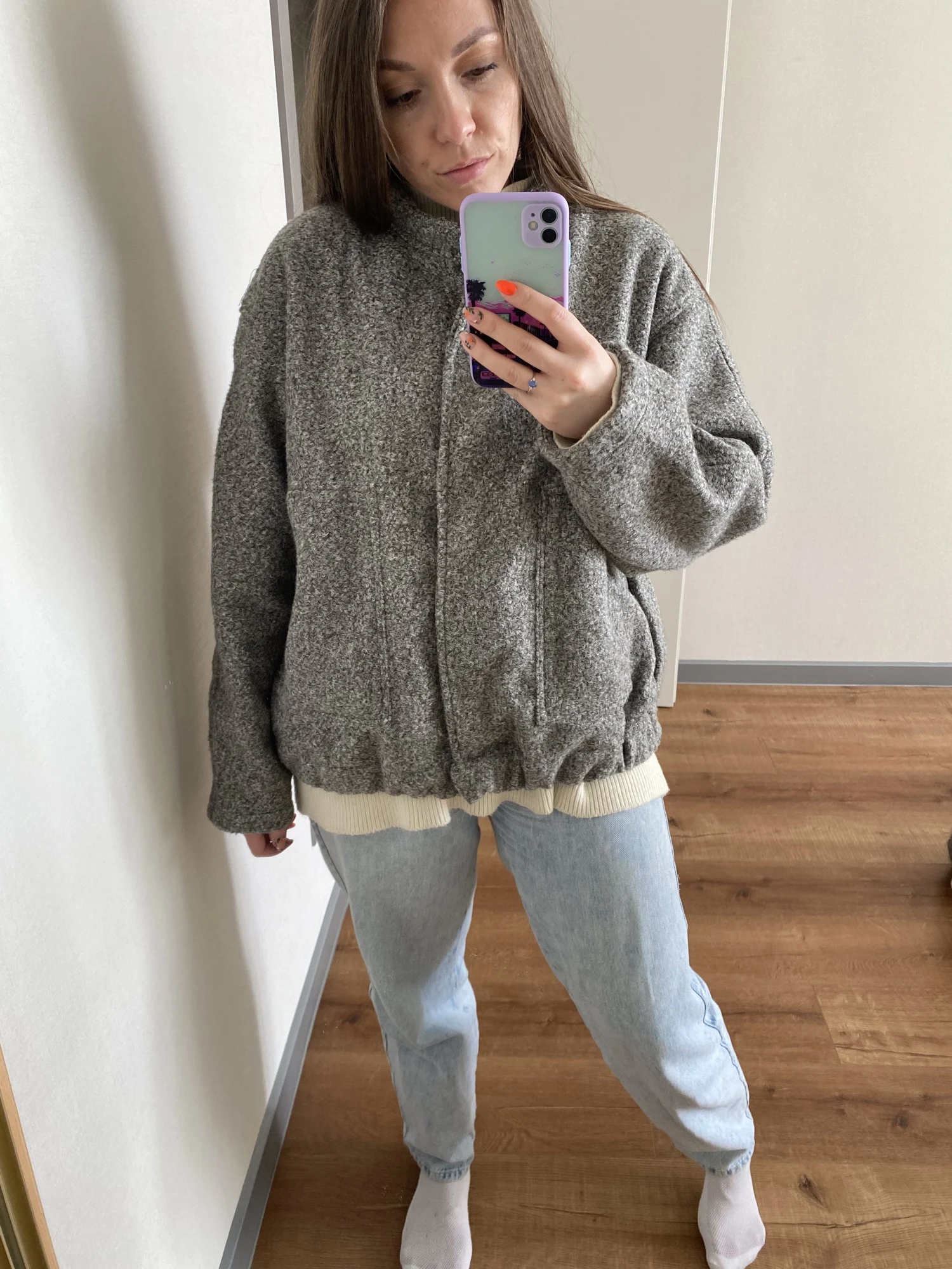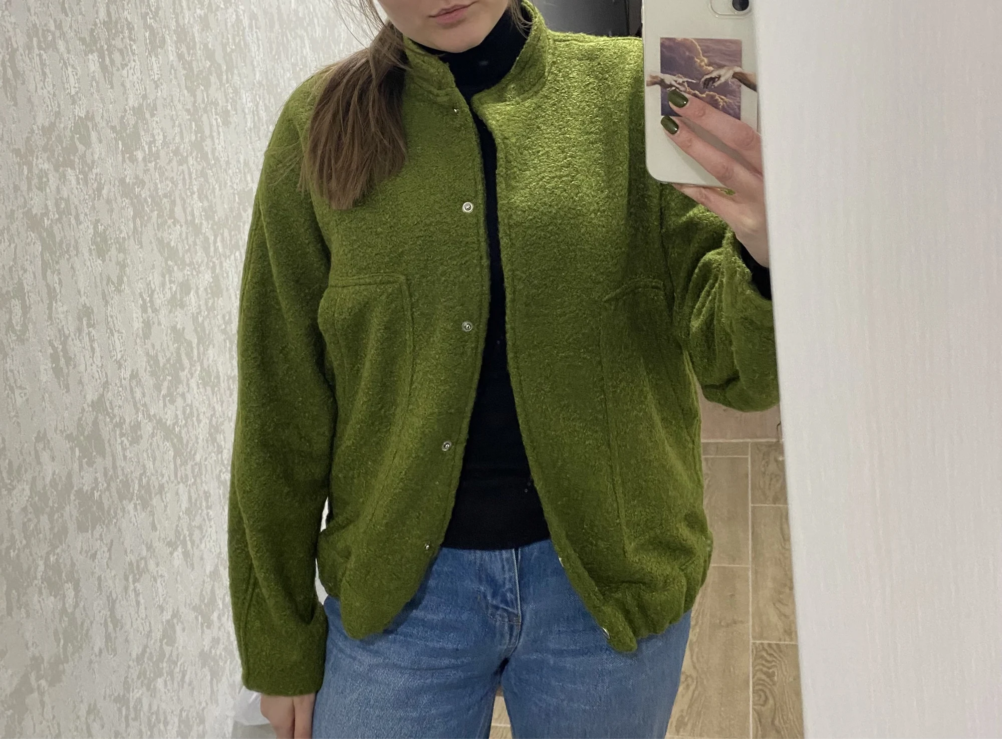 Бомбер приятный, на ощупь мягкий, больше как тёплая кофта. На свои параметры рост 176, 96/73/101 взяла размер L, вполне можно было бы взять и М, но резинка была бы тугой на бёдрах. Минусы - не держит форму, слишком широкие манжеты