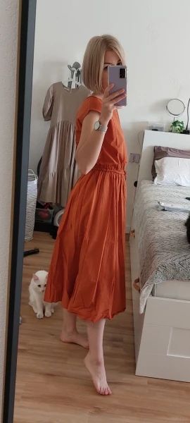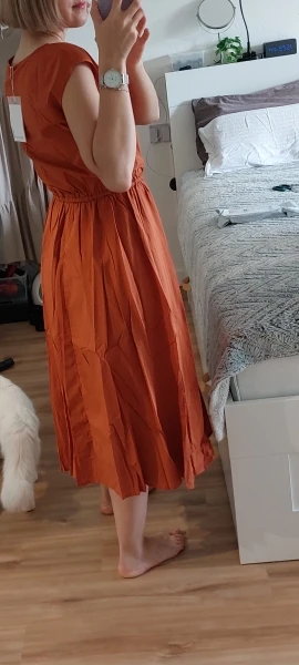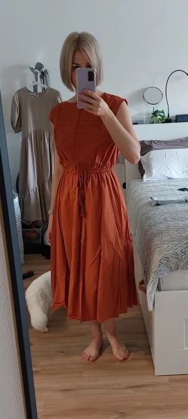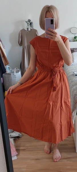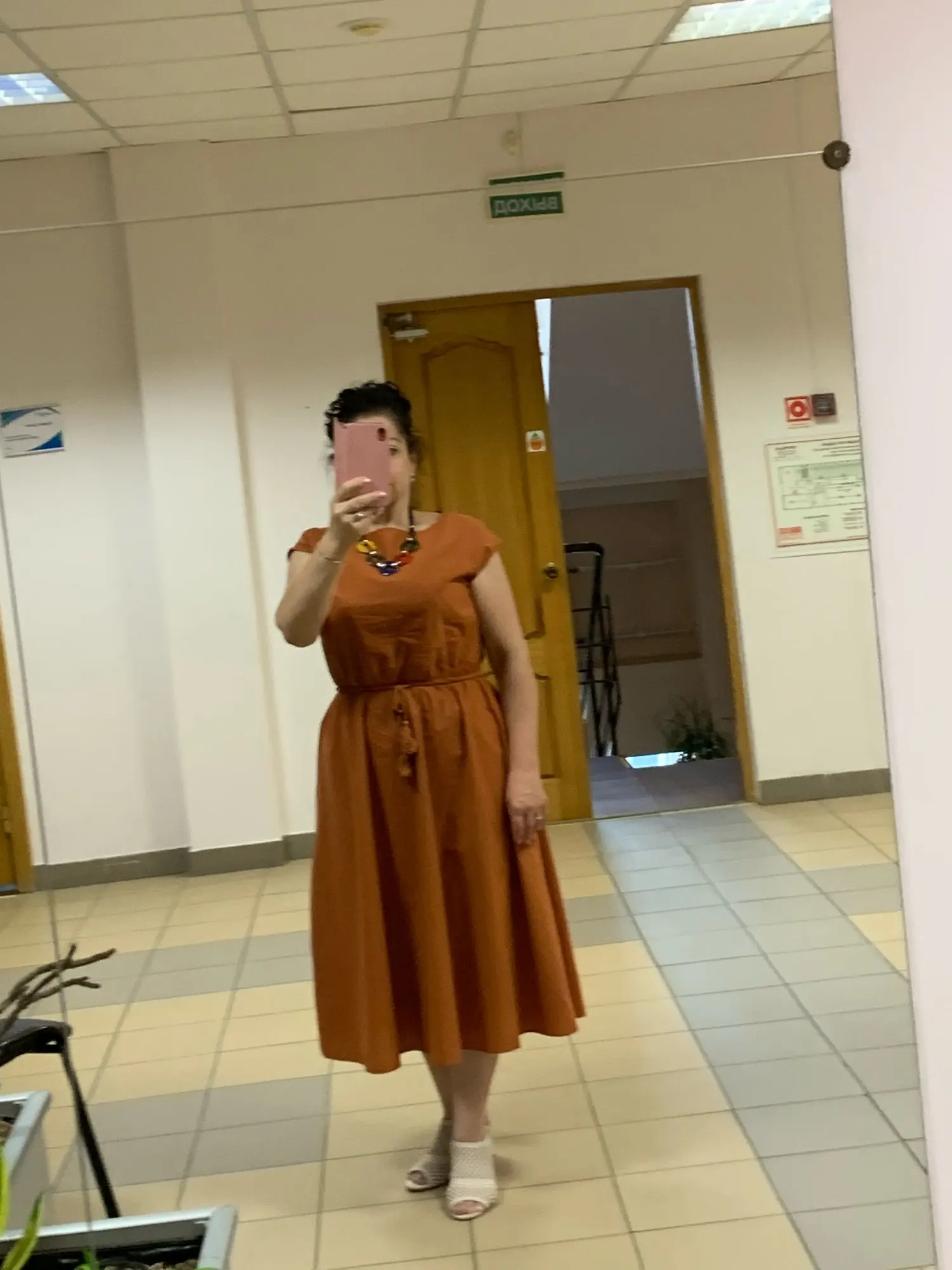 классное платье! за свою цену просто очень хорошего качества. швы ровные, хороший оверложенные. Мне нравятся ткань. Хлопок. Подъюбник синтетика. Цвет благородный терракотовый. Люблю такой. Заказ пришёл ща недельки три в Екатеринбург.Пока не носила, потому что у нас начались уже холода. Фото прилагаю. на параметры 90-72-95 выбрала S-2XL. потому что хотела чтобы оно сидело объемно. Люблю когда такой фасон свободно сидит.
