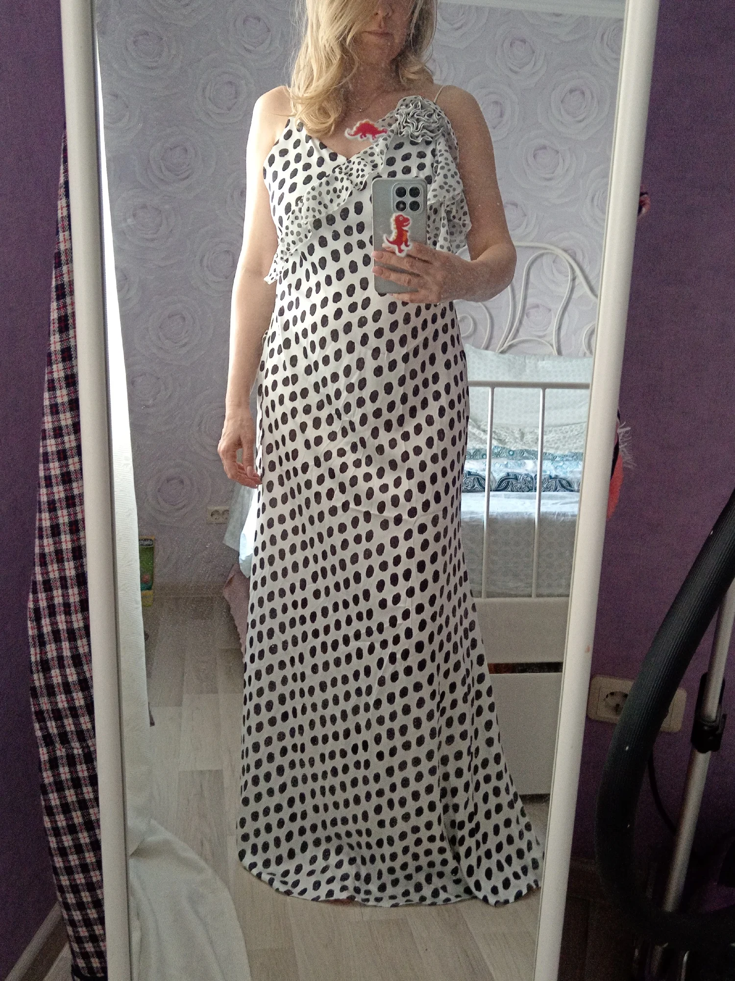 Платье в пол, как будто соответствует фото, только с вы тачками что-то напутано или лямки-резинки надо чтобы подлиннее были. Вроде фигура пропорциональная, но в груди не село. Взяла L на 98-75-96. Сильно топорщиться в пройме спереди. Пришлось перешить и теперь все ок😊 ткань полиэстер с эластаном, приятная. Пошив качественный. Фото уже после перешивать вытачек)
