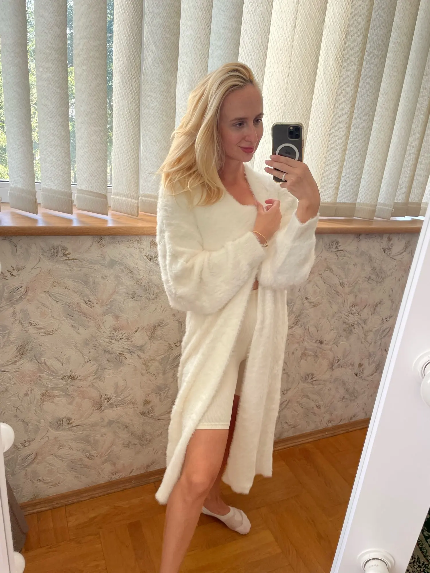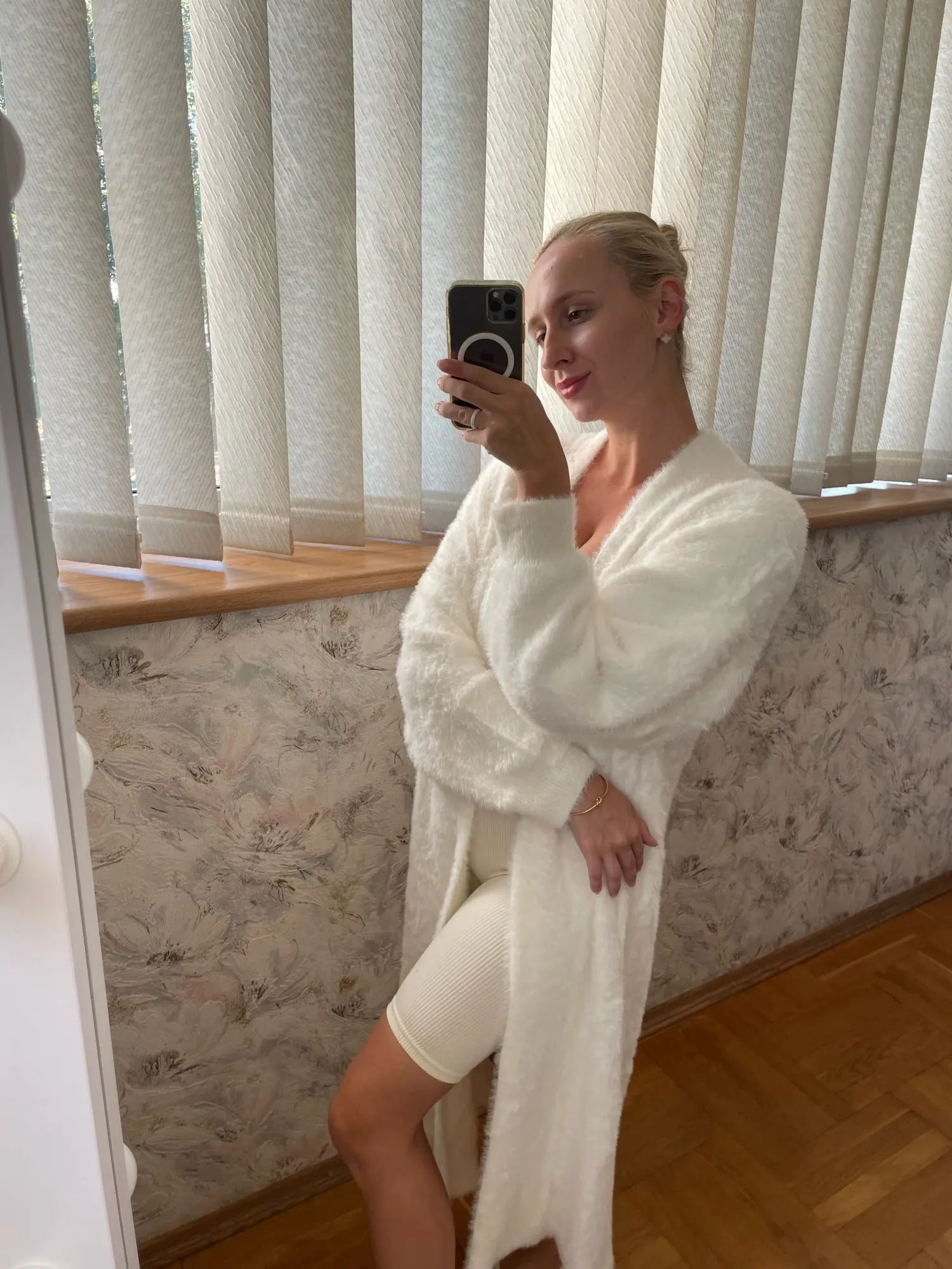 Чудовий кардиган, дуже теплий, м’який і приємний до тіла. Бірок про склад матеріалу не було. Шви ідеальні , без кишень (якщо когось цікавить). Сам кандиган важкий , завдяки цьому спадаючий, довжина від плеча 110 см, мій зріст 160 см . Швидка доставка , з продавцем не спілкувалась.