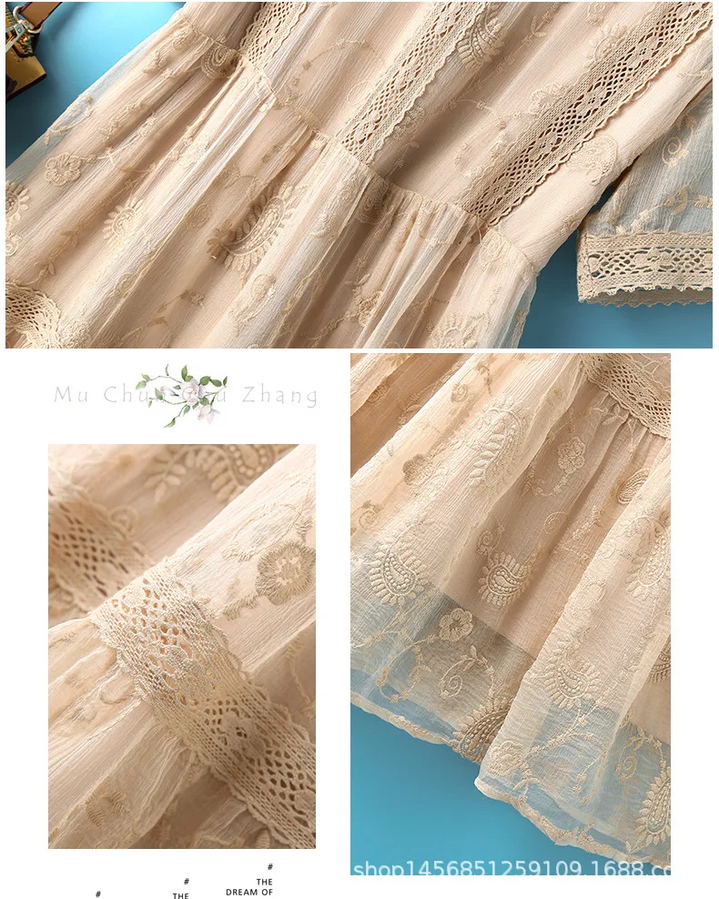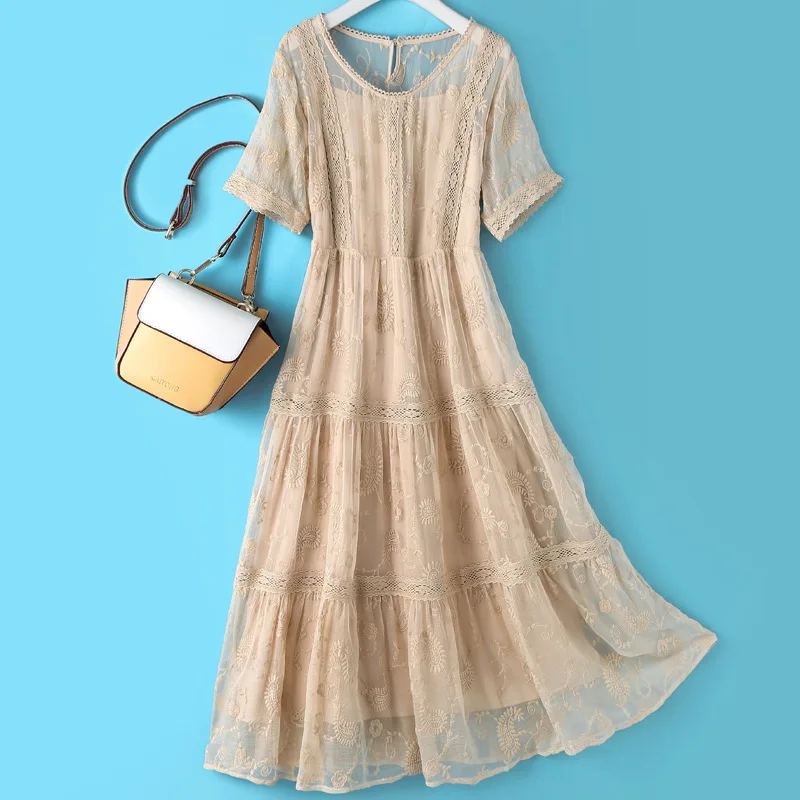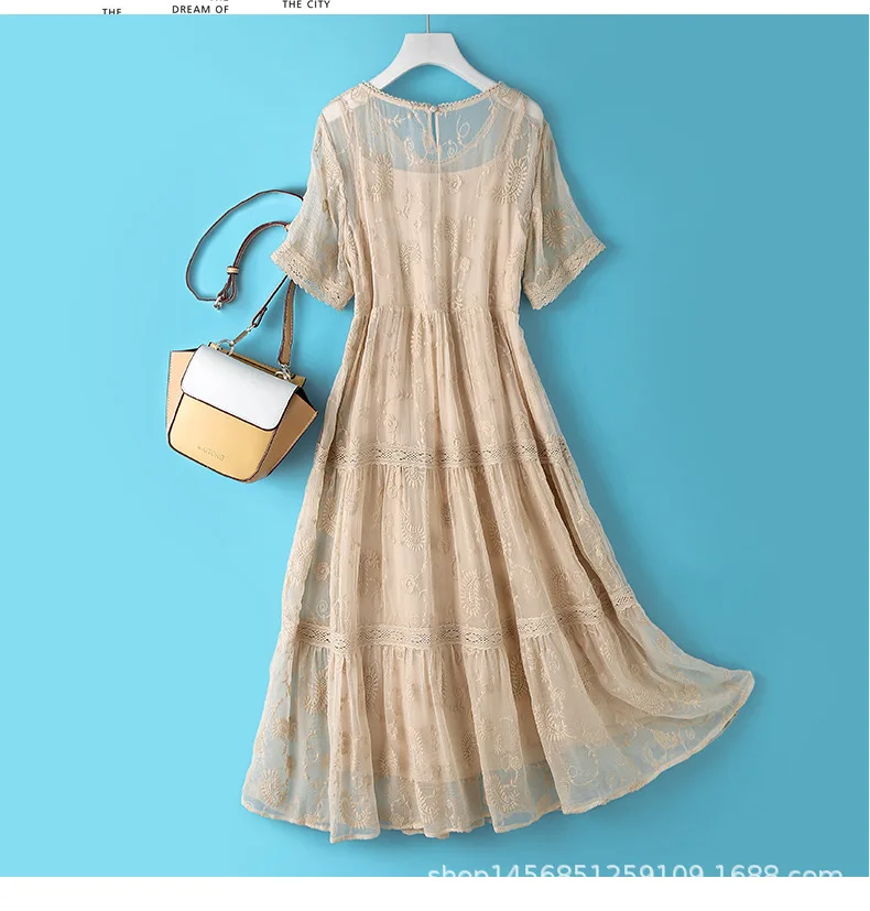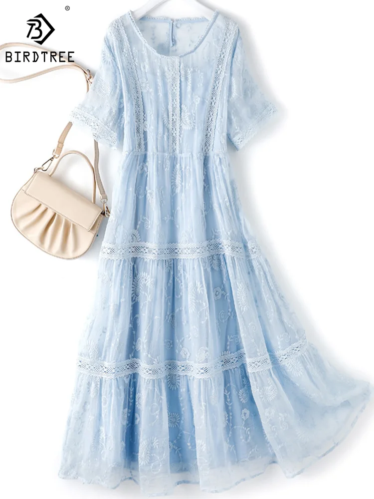 Birdtree 100%Real Mulberry Silk Dress Heavy Embroidery Round-Neck Mid-Sleeve...