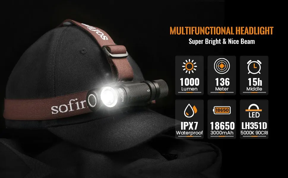 Sofirn New SP40A мощный налобный фонарь, предназначенный для дома, EDC или активного отдыха, например, кемпинга, пеших прогулок и т. д.Им можно управлять от одной литий-ионной аккумуляторной батареи 18650.Переключатель управляет следующими функциями: Низкий-Средний-Высокий, скрытый турбо.