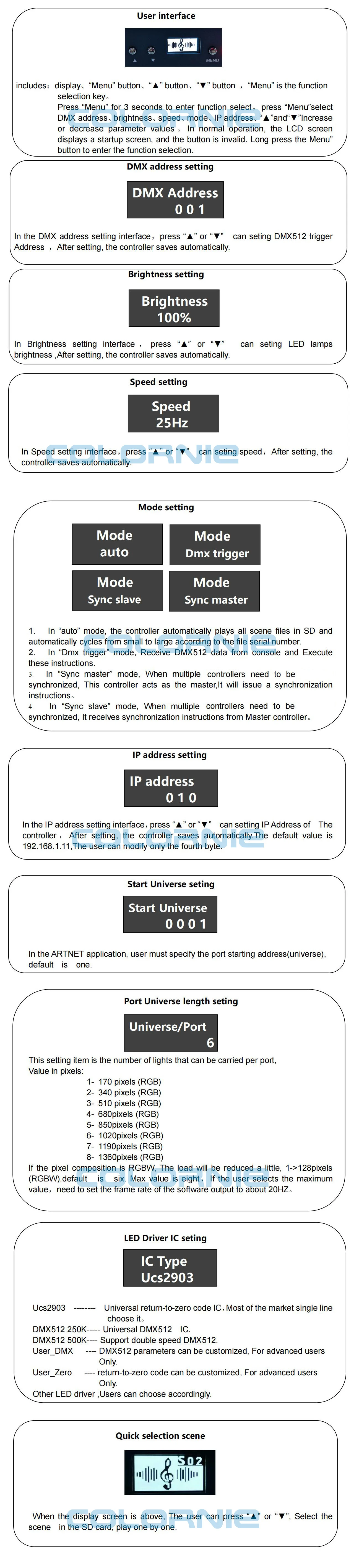 Can support a variety of lighting driver IC: DMX512, UCS series, TM series, LX series, GW series, TLS series, MY series and so on.