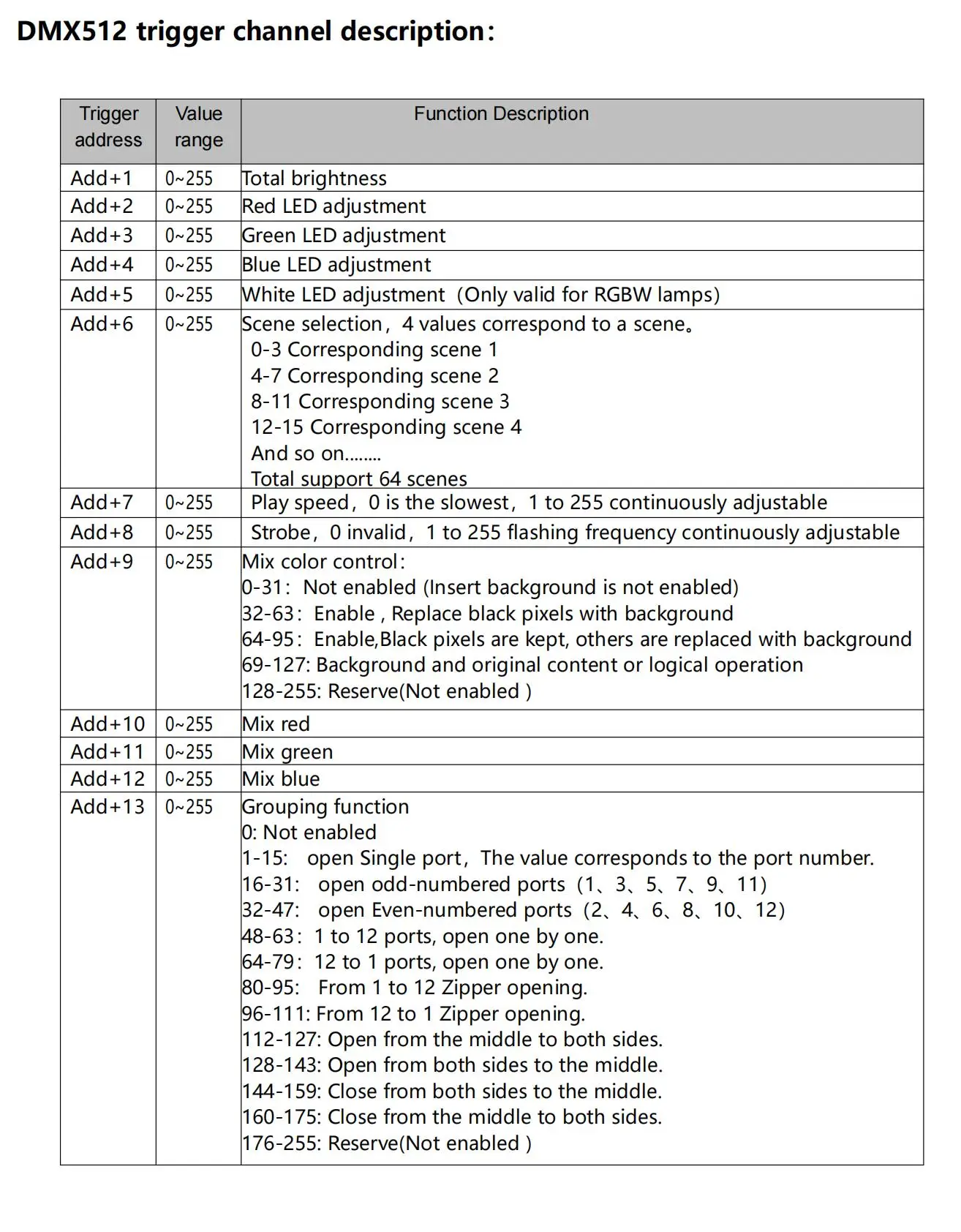 The controller has external DMX512 trigger function, can access control console and KTV intelligent lighting control box, very suitable for bar, KTV room lighting control, accept the command call program, adjust speed, brightness, special effects, support up to 13 channels OF DMX512 instruction.