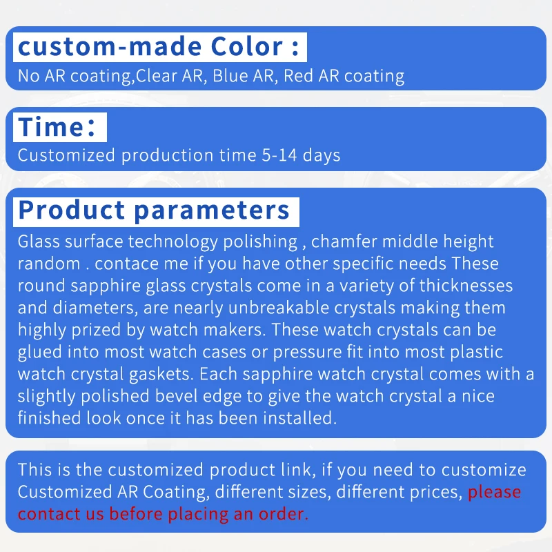 Это индивидуальная ссылка на продукт, если вам нужно настроить сапфировое стекло с AR покрытием, пожалуйста, свяжитесь со мной перед заказом. Синее AR-покрытие, поддерживается на заказ, пожалуйста, свяжитесь со мной!