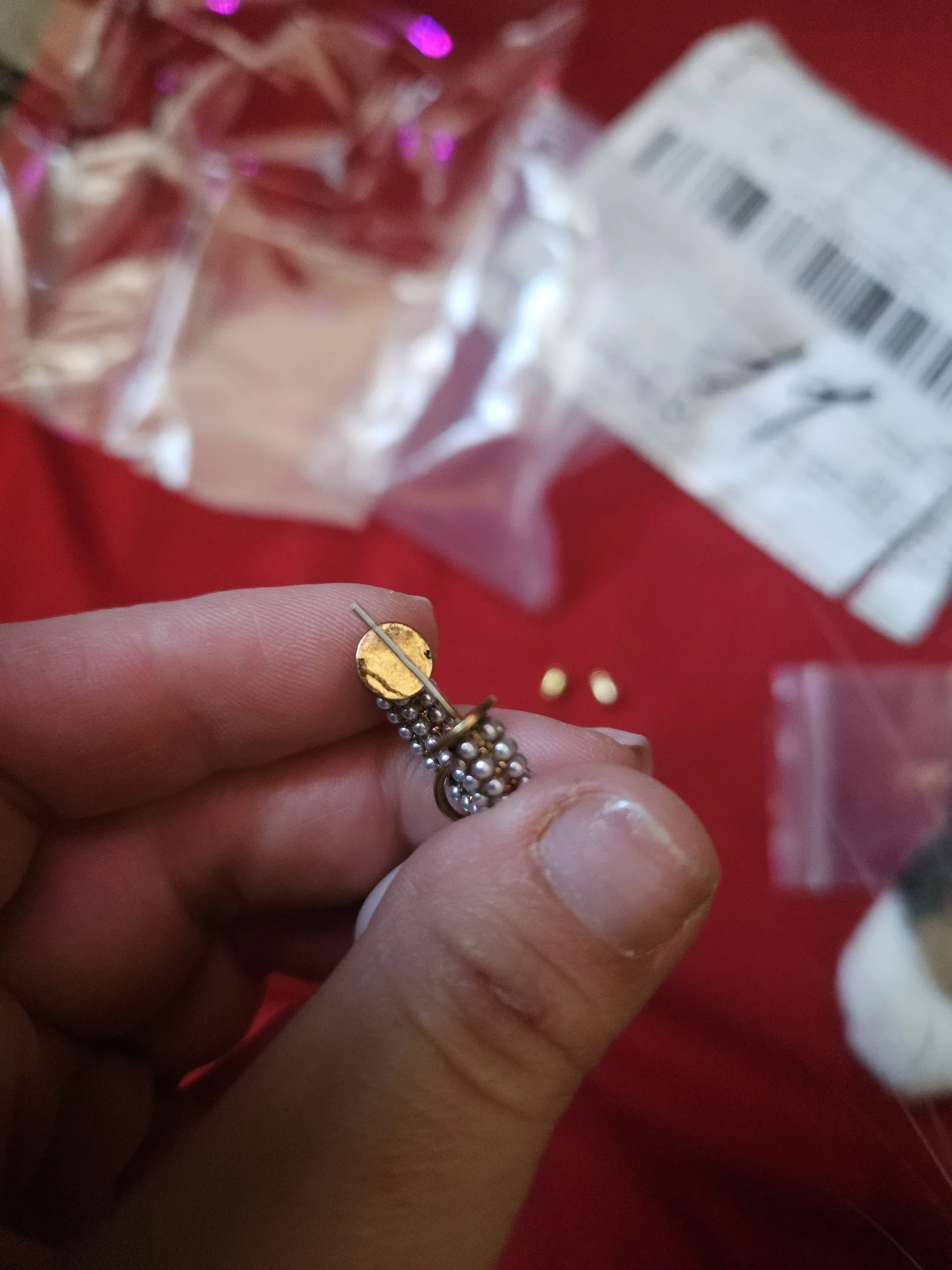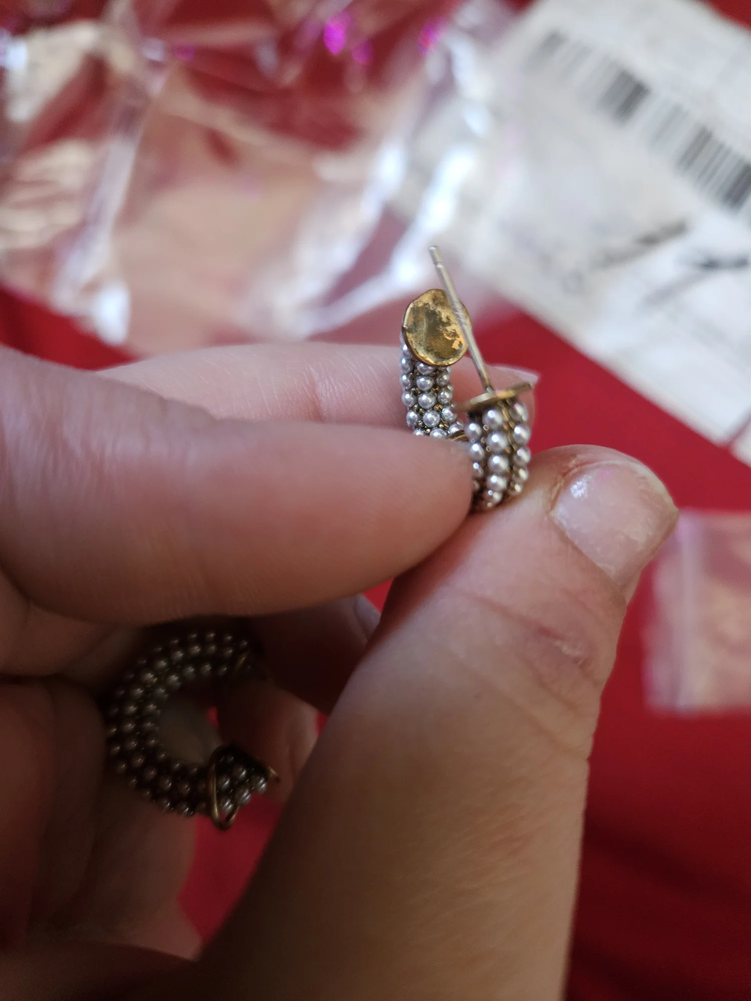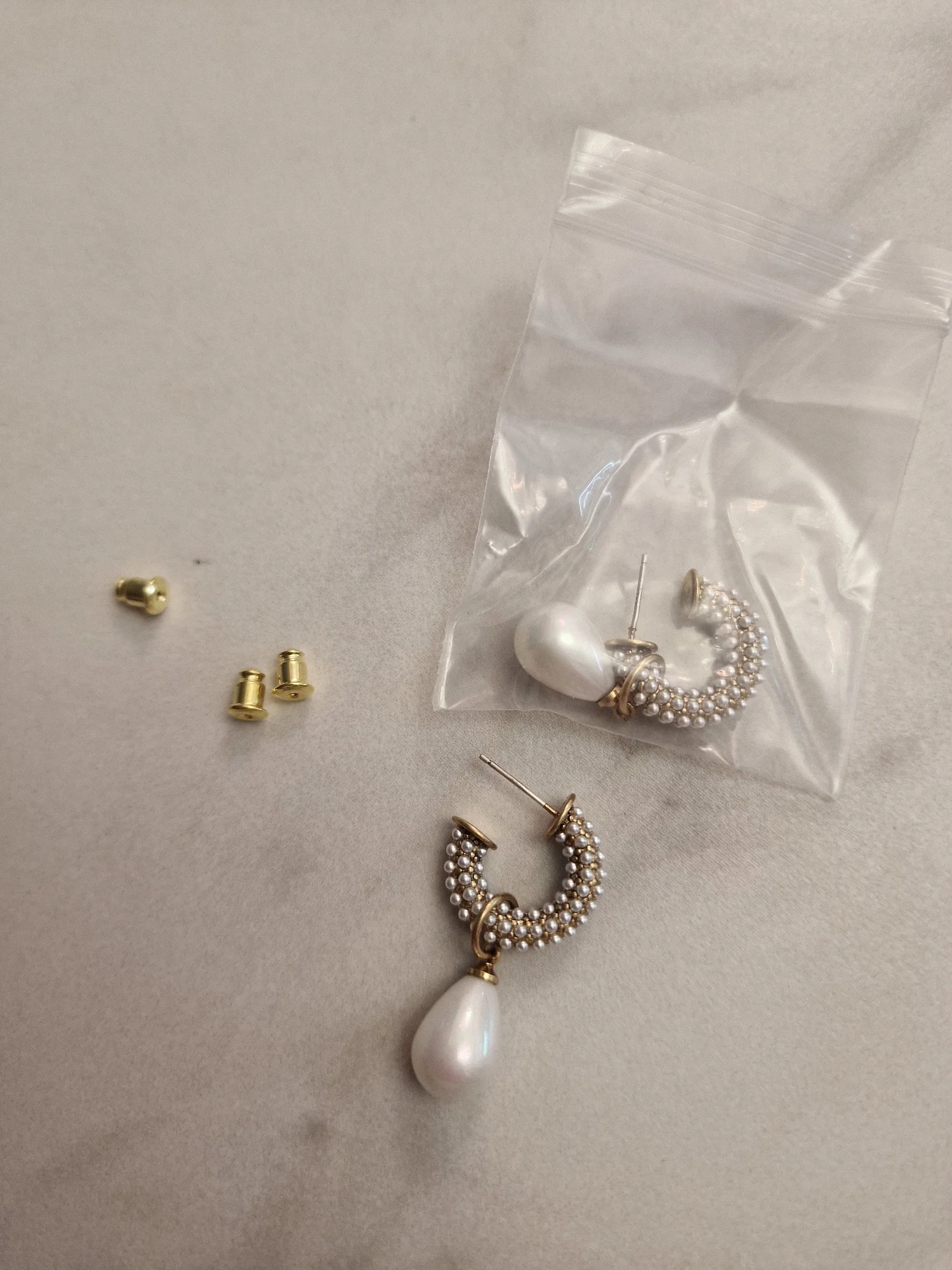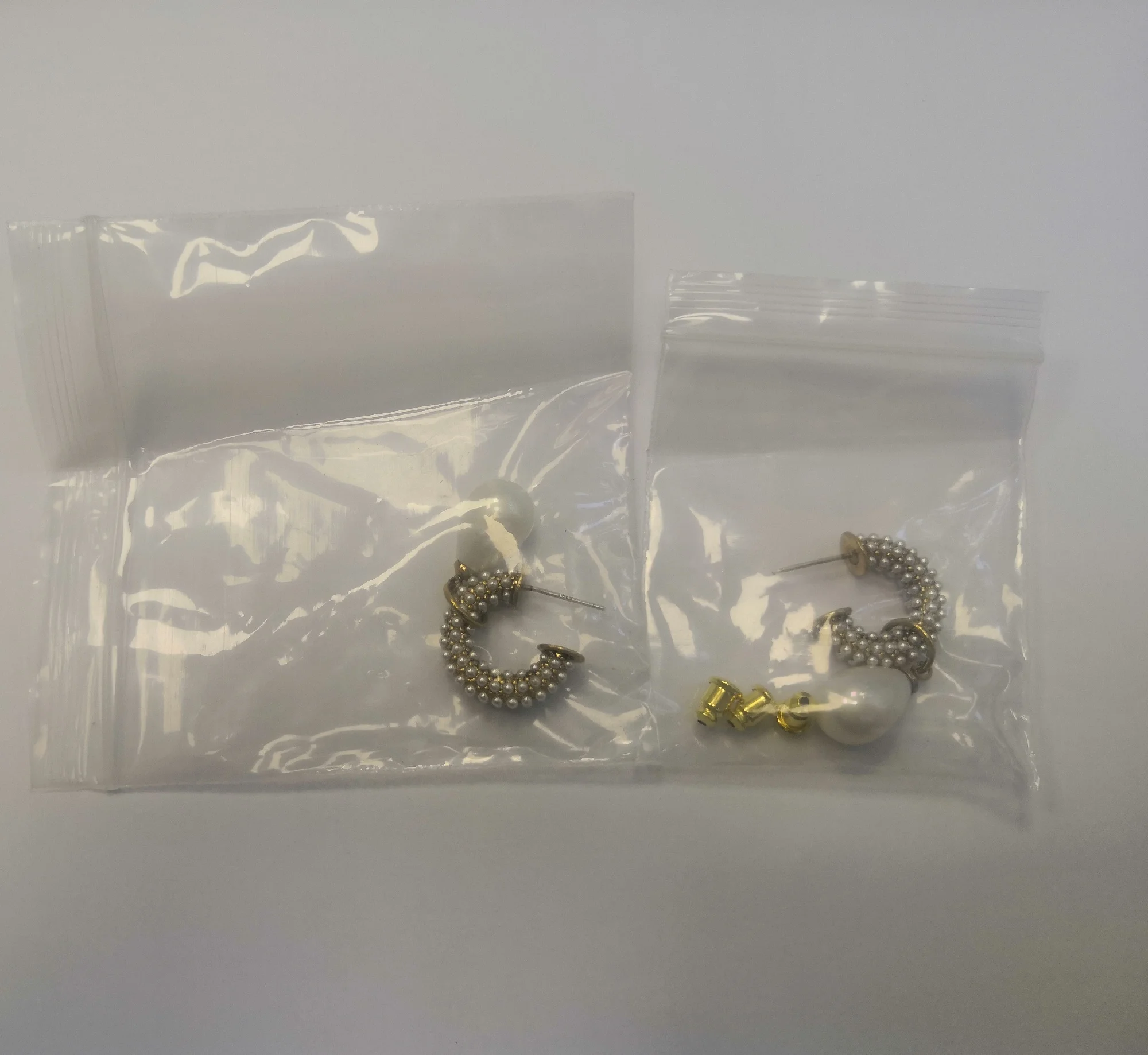 Всё пришло целое в совместной посылке. Упаковано отлично. Каждая серёжка в своём пакете. Мне очень понравились. При желании жемчужину можно снять. Один гвоздик кривенький(на фото видно) и на них что-то написано или нацарапано. К сожалению разглядеть не смогла.