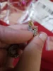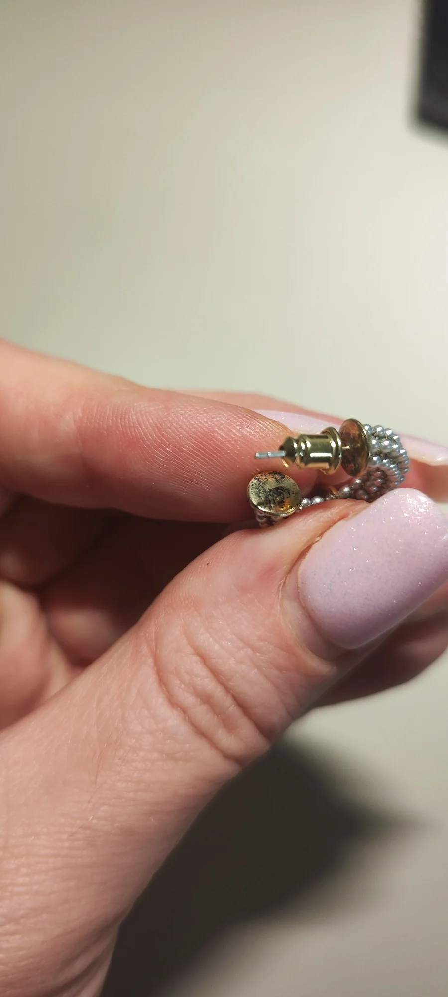В целом сами красивые, но в одной серьге ,одна бусинка торчит, видно очень, и металл отличается от подвесок и замочка . Подвески более яркие , новые, а у основания, где гвоздик, как будто ржавый , заглушка желтая.