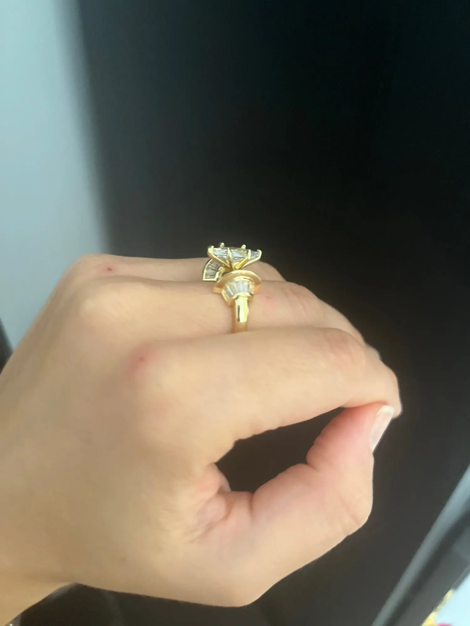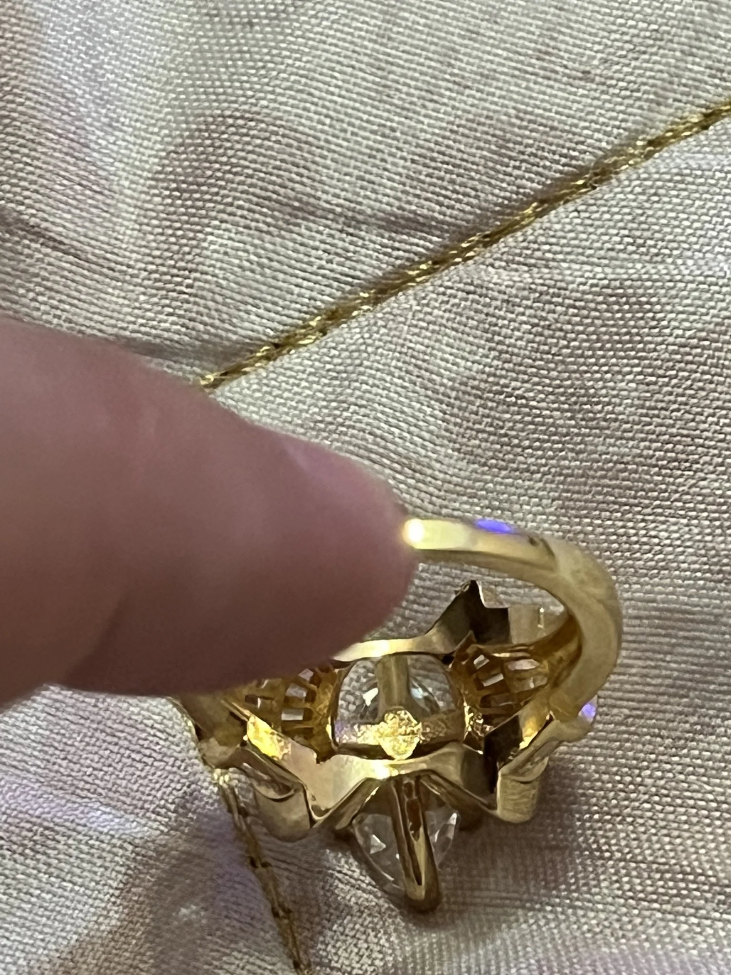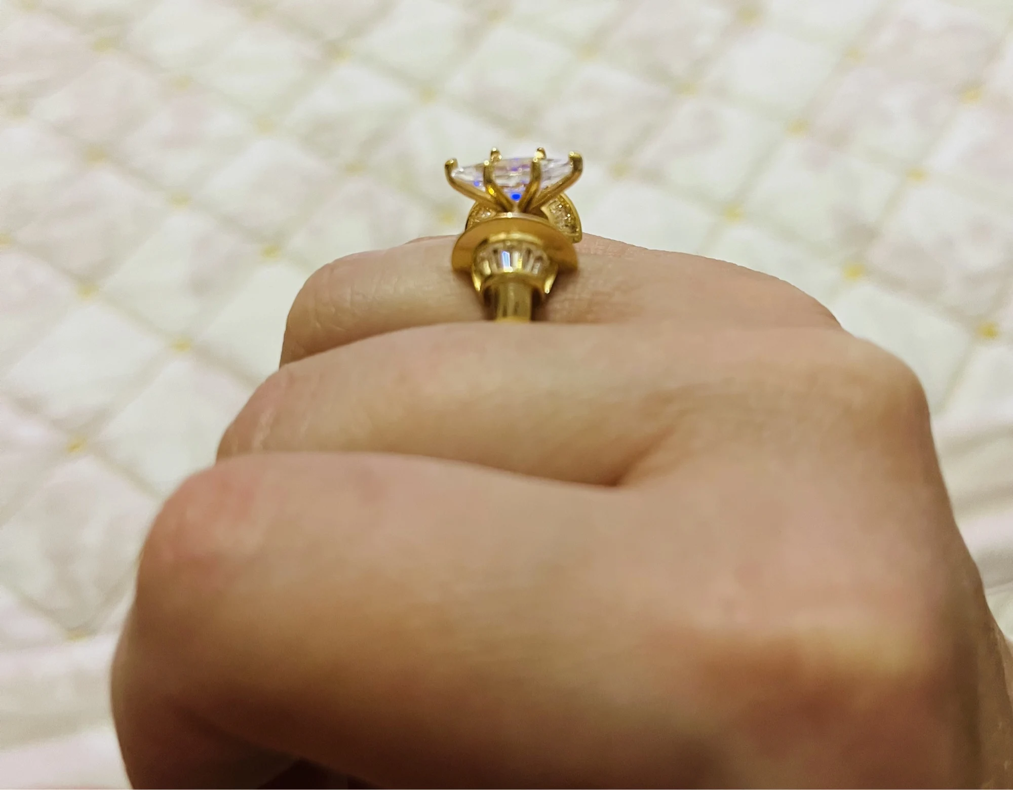 Кольцо замечательное, прямо как на фото. Звезду сняла за небольшой заводской брак на боковых сторонах, где крепятся трапеции, и за несоответствие размеру, так как на среднем пальце у меня 9 размер, а кольцо не налазиет к сожалению на средний палец, на безымянном у меня 8 размер, на нем сидит относительно нормально, слегка свободновато. Настоящий размер кольца 8,5 а не 9 как заявленно, еслиб знала то заказала бы больше.