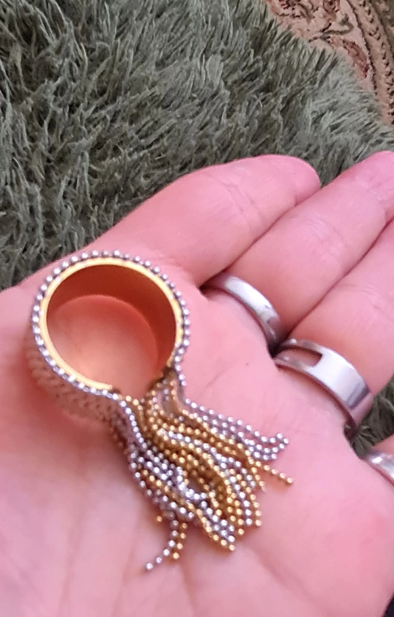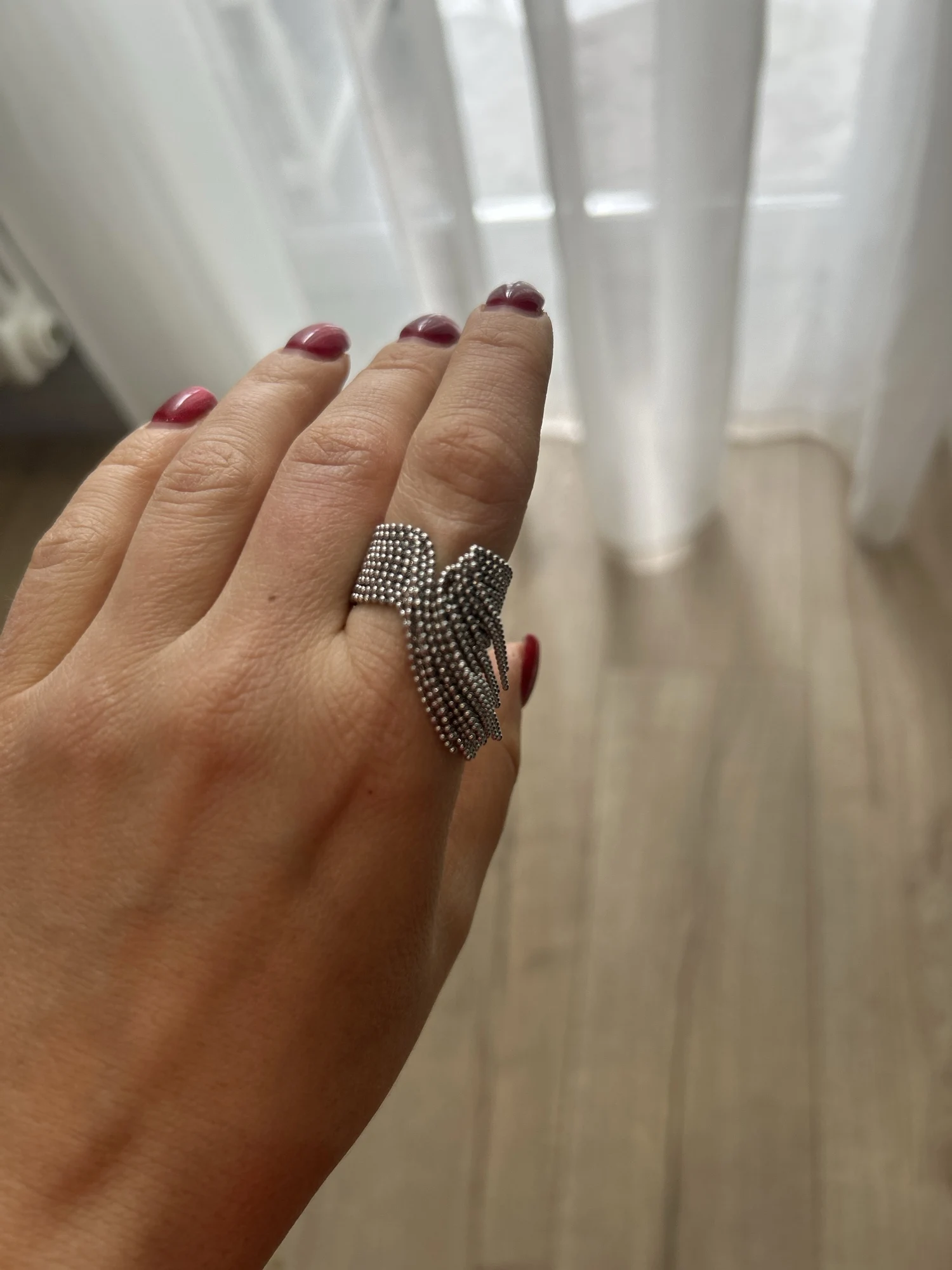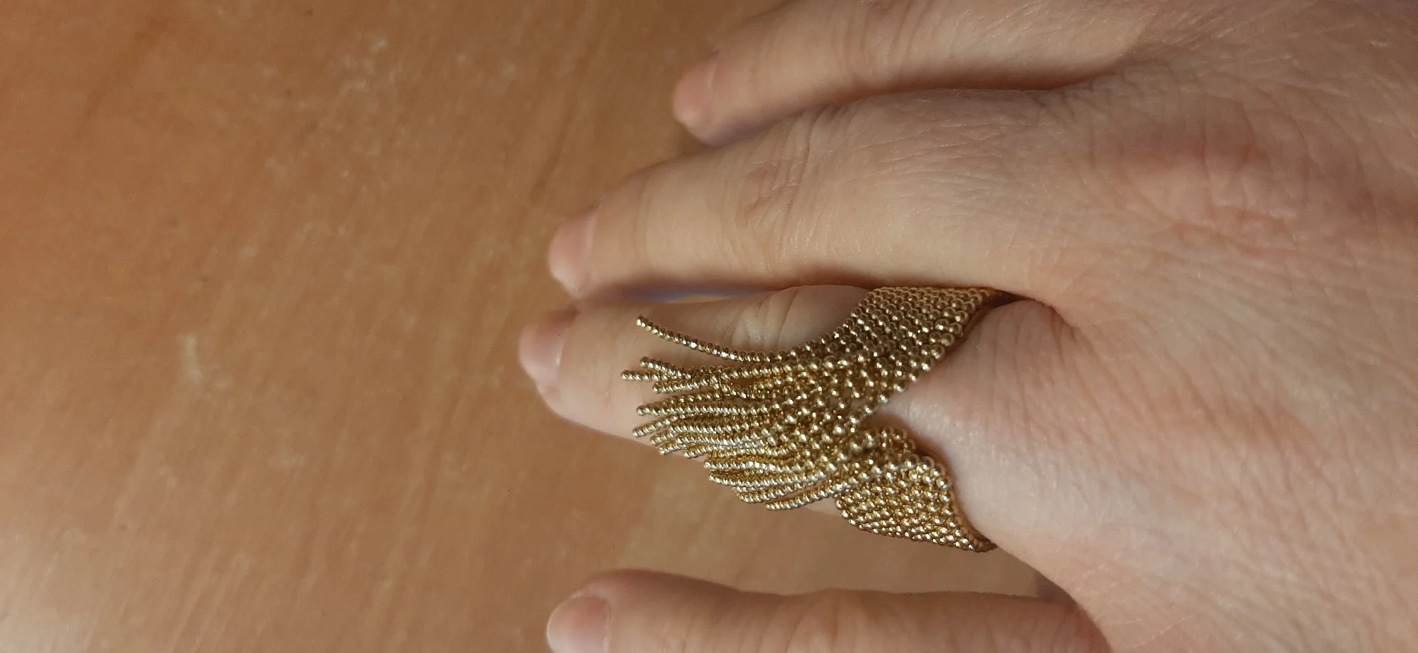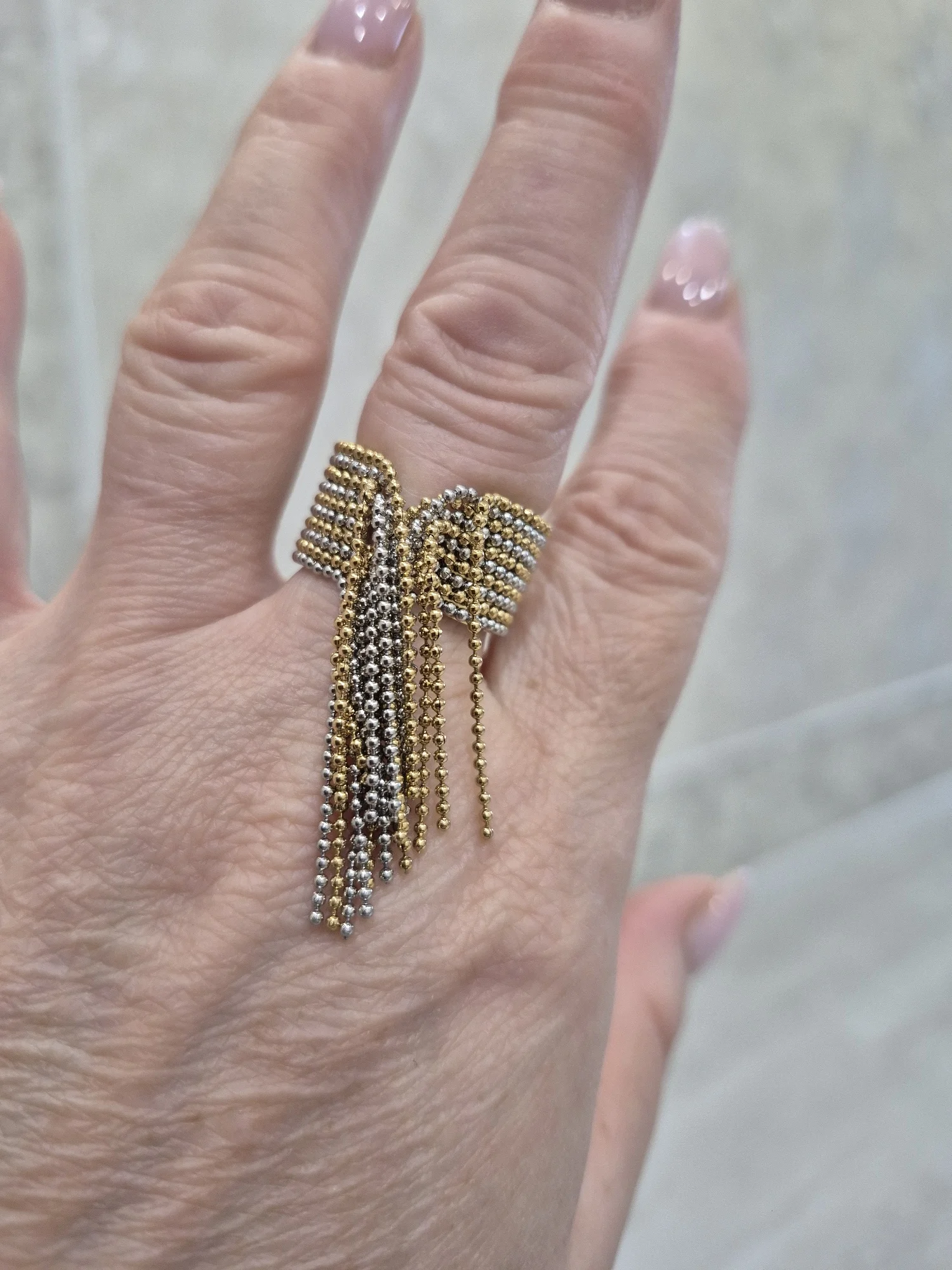 очень красивое и качественное кольцо. отлично упаковано, в три слоя. красивый цвет. мягкие цепочки. быстрая доставка.