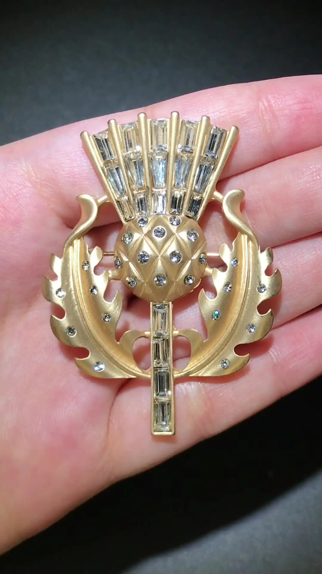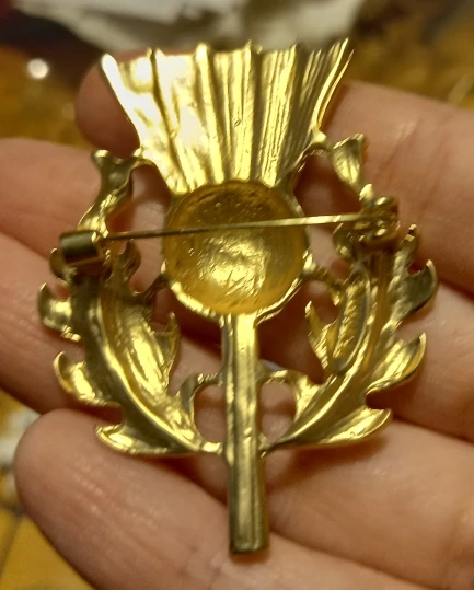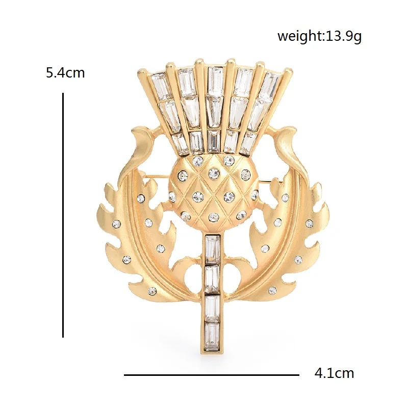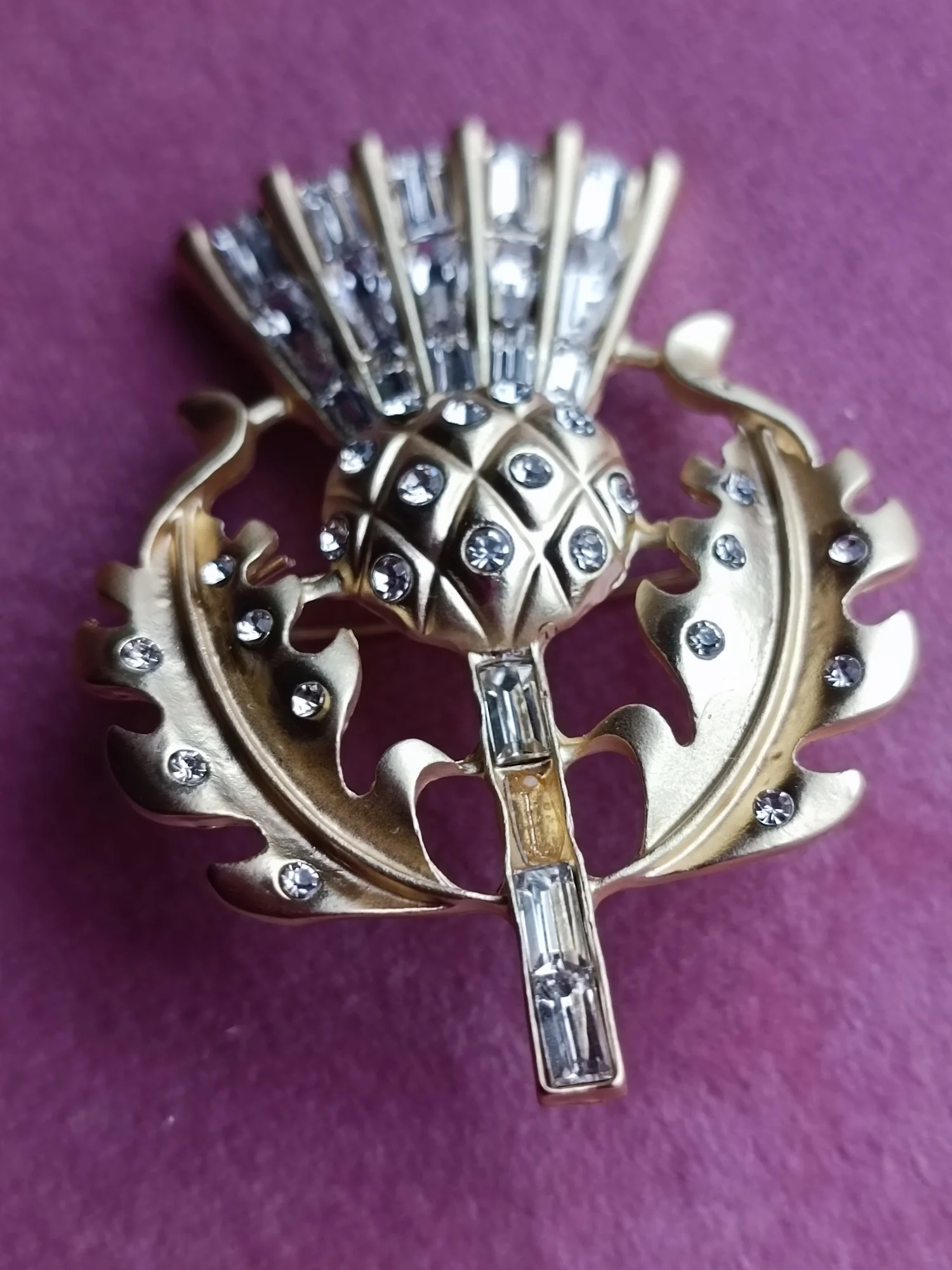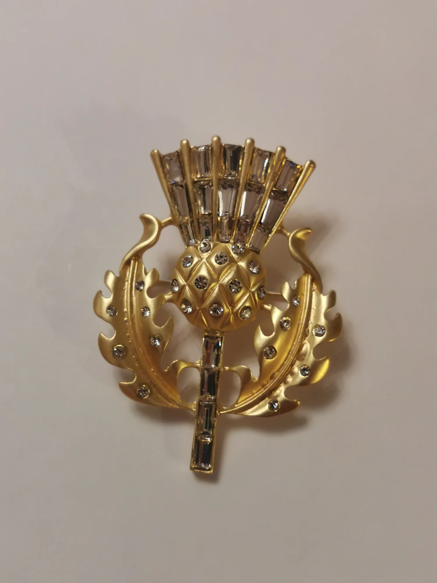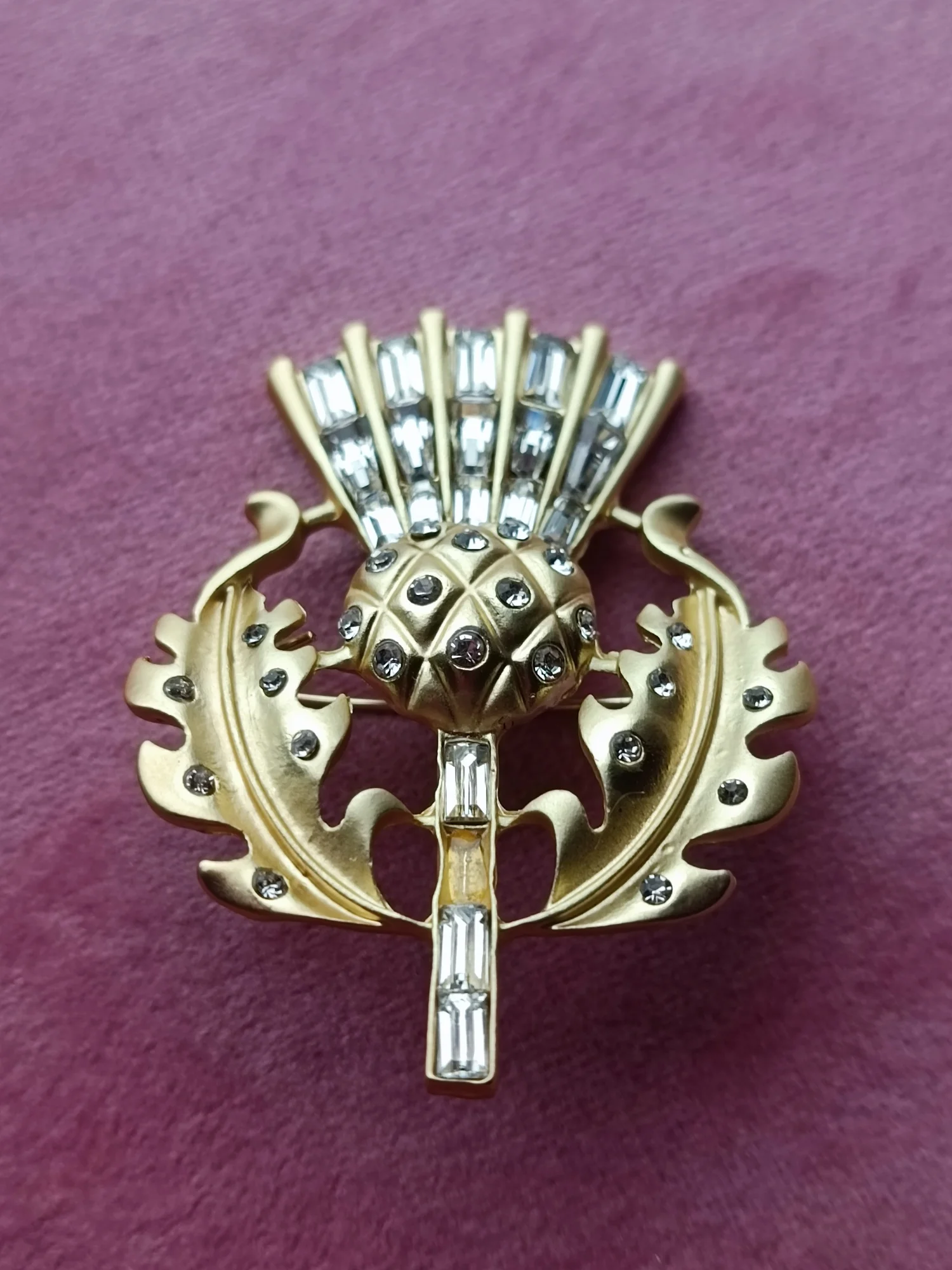 Gorgeous vintage style thistle flower brooch. it's made from lovely matte finish gold coloured metal and very sparkly and stunning. Thanks for a great quality item and a great service.